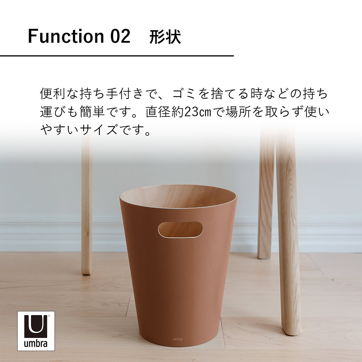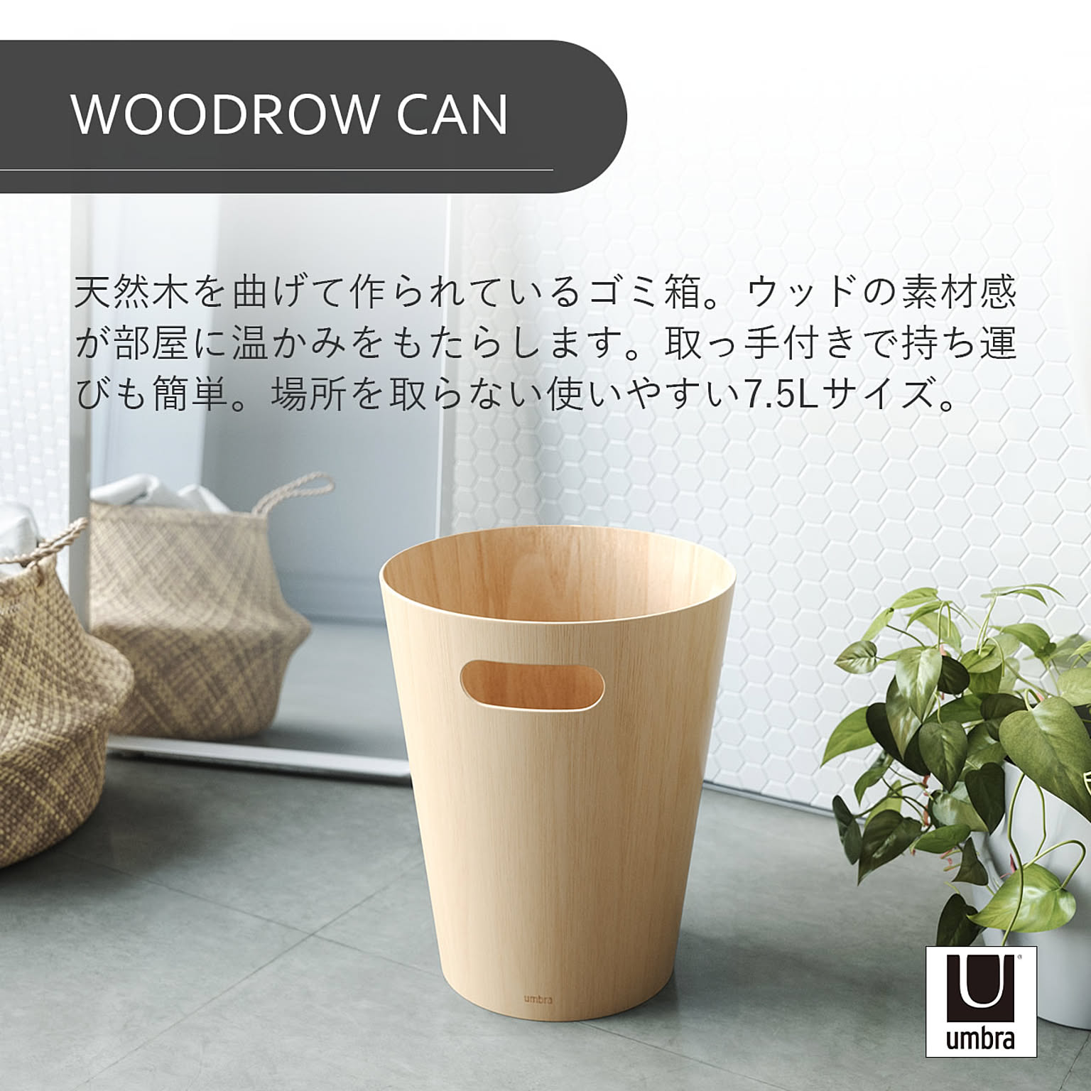 天然木を曲げて作られているゴミ箱。ウッドの素材感が部屋に温かみをもたらします。取っ手付きで持ち運びも簡単。場所を取らない使いやすい7.5Lサイズ。