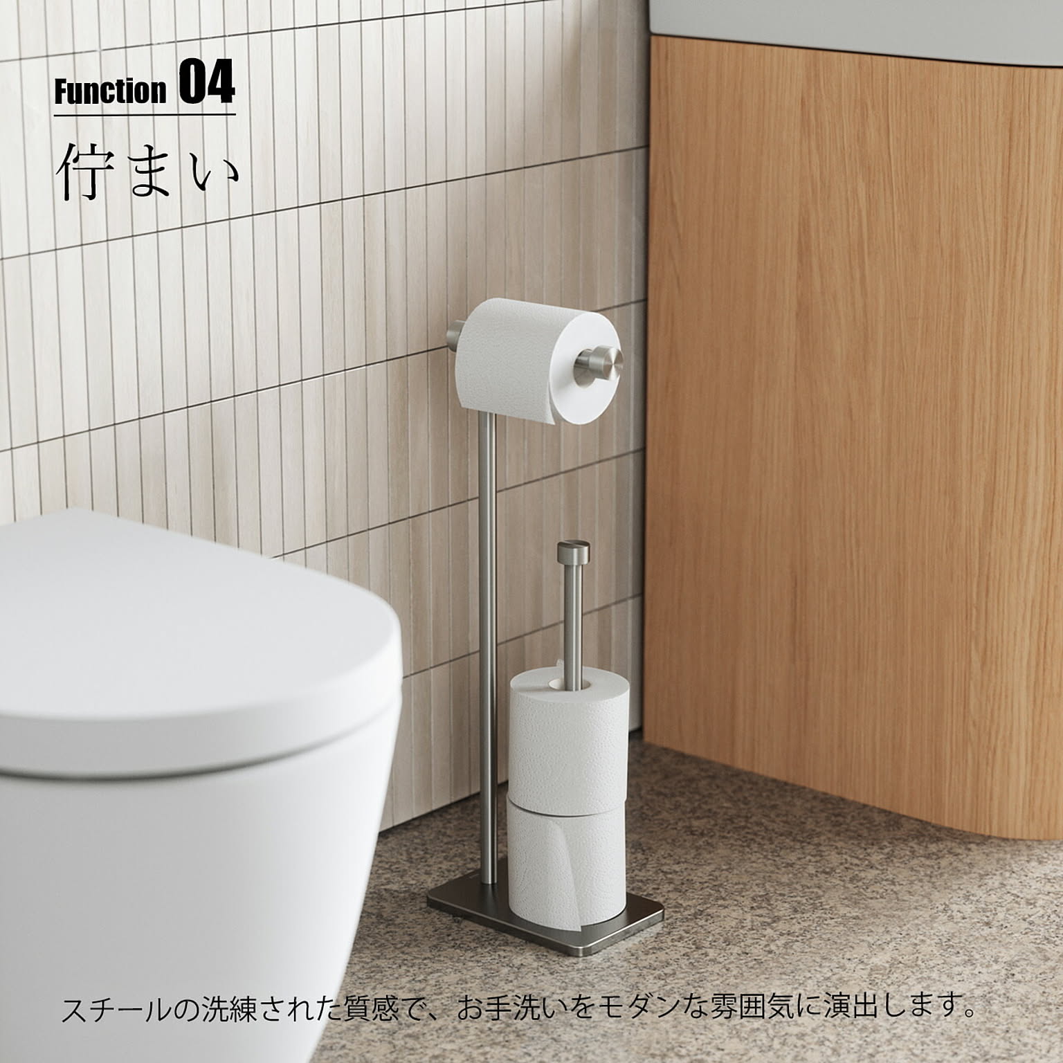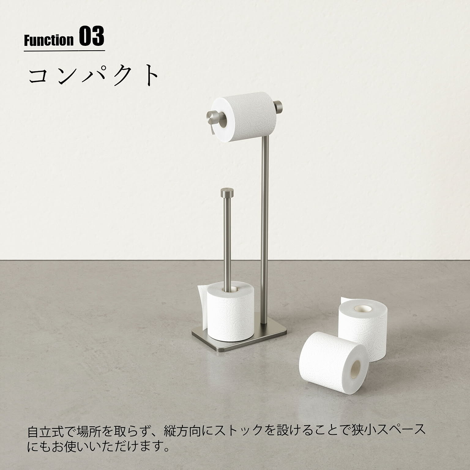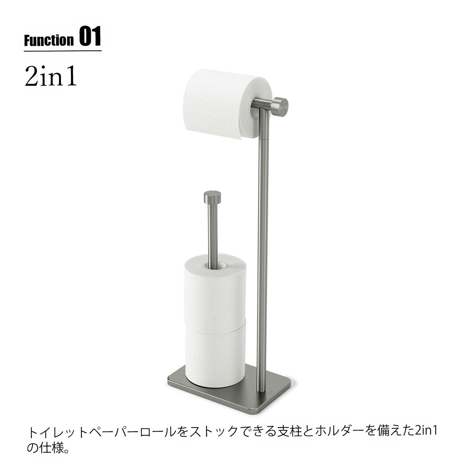 コンパクトなミニマルデザインのトイレットペーパースタンド。トイレットペーパーロールをストックできる支柱とホルダーを備えた2in1の仕様。一定の重量があるスクエア状の土台を備え、安定感もしっかりあります。自立式で場所を取らず、縦方向にストックを設けることで狭小スペースにもお使いいただけ、移動も簡単なのでお掃除にも重宝します。スチールの洗練された質感で、お手洗いをモダンな雰囲気に演出します。