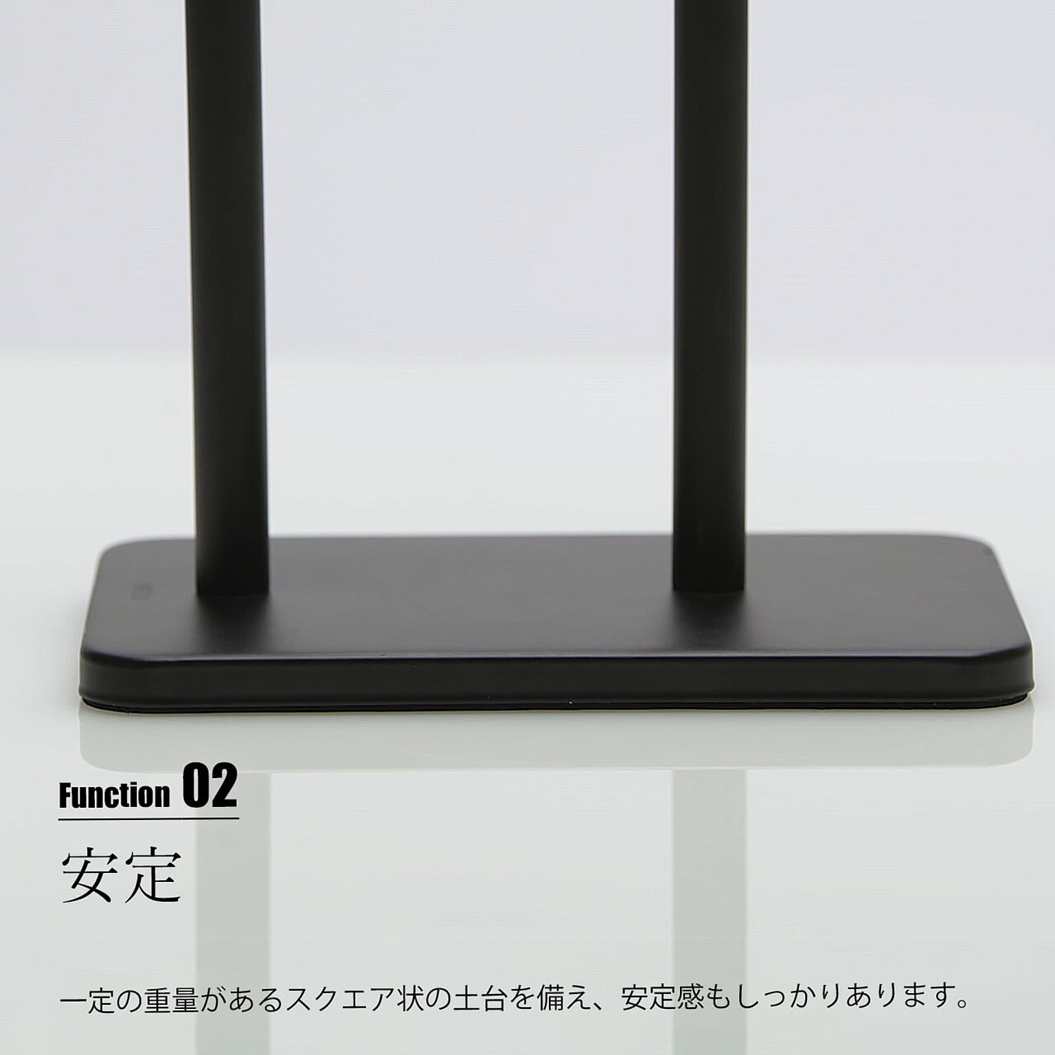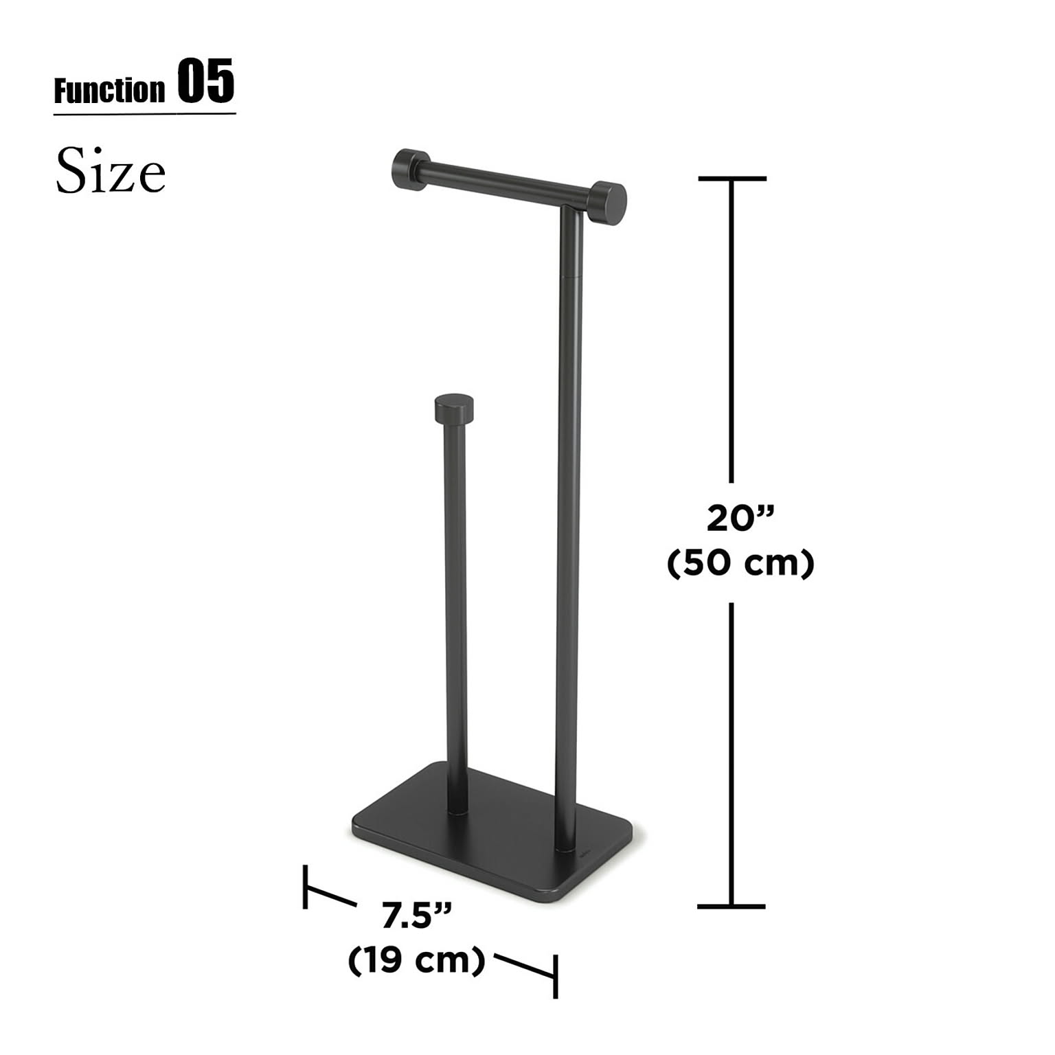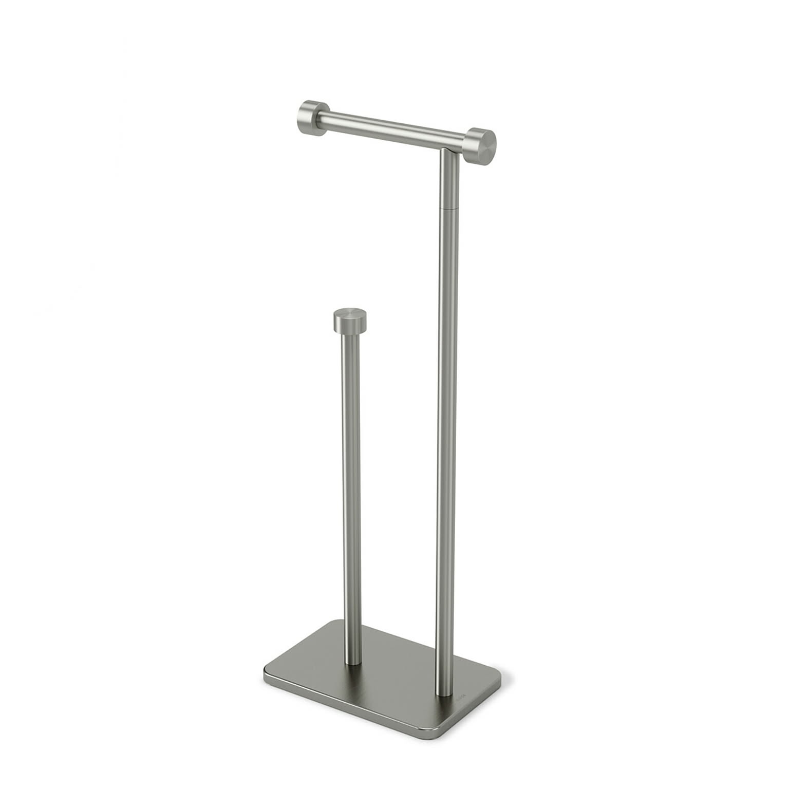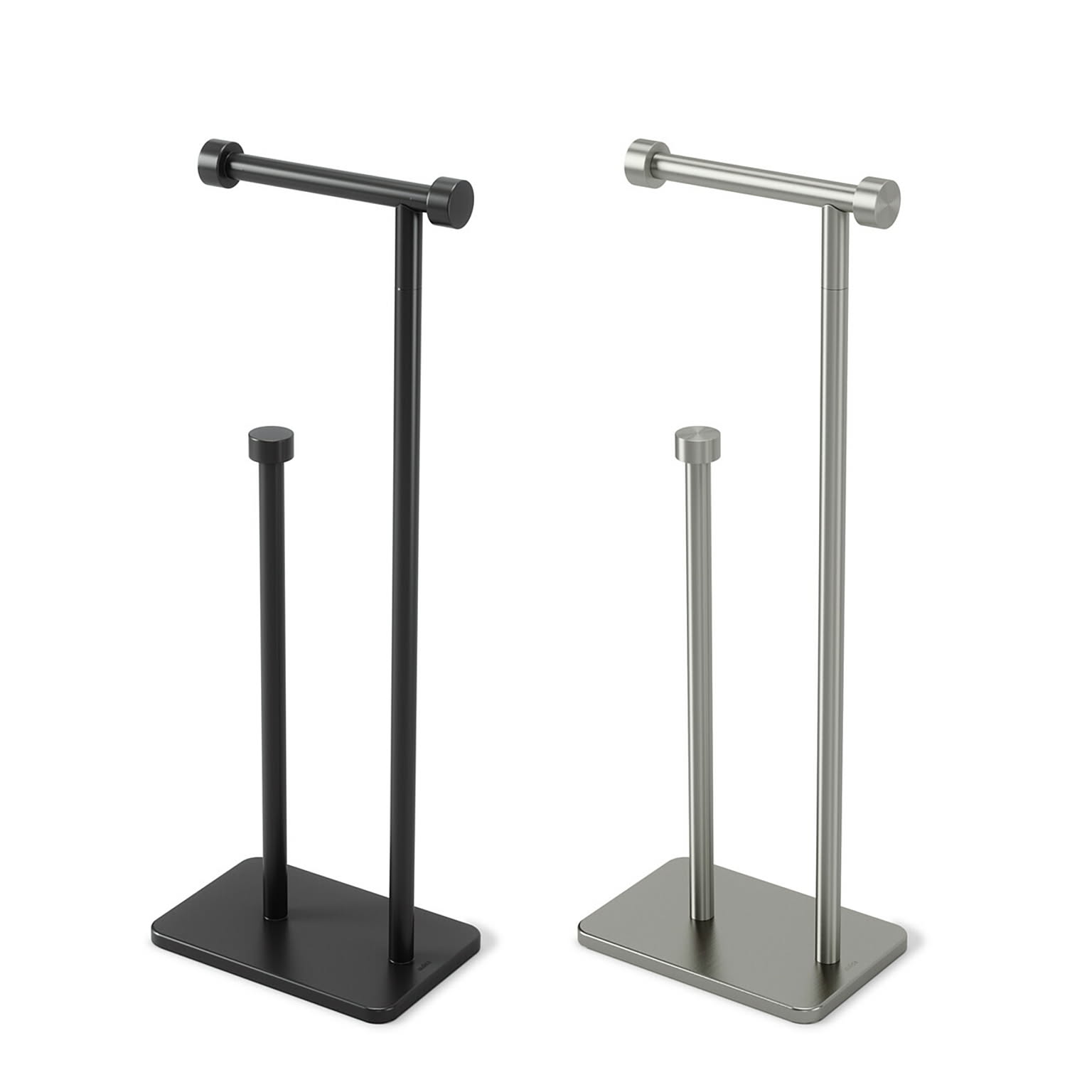 コンパクトなミニマルデザインのトイレットペーパースタンド。トイレットペーパーロールをストックできる支柱とホルダーを備えた2in1の仕様。一定の重量があるスクエア状の土台を備え、安定感もしっかりあります。自立式で場所を取らず、縦方向にストックを設けることで狭小スペースにもお使いいただけ、移動も簡単なのでお掃除にも重宝します。スチールの洗練された質感で、お手洗いをモダンな雰囲気に演出します。