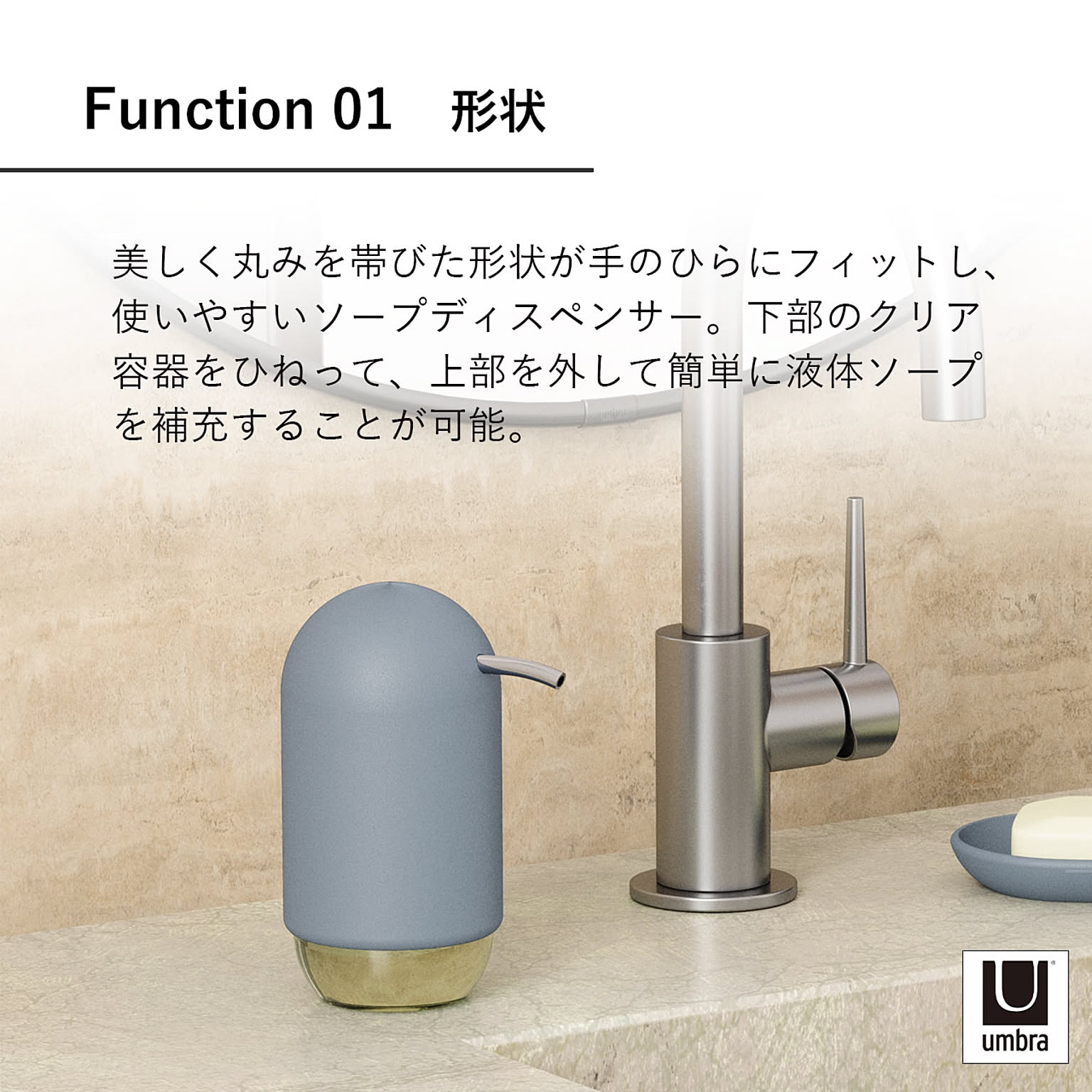 美しく丸みを帯びた形状が手のひらにフィットし、使いやすいソープディスペンサー。下部のクリア容器をひねって、上部を外して簡単に液体ソープを補充することが可能。残量の確認もわかりやすく、デザイン性はもちろん機能性も兼ね備えたアイテムです。