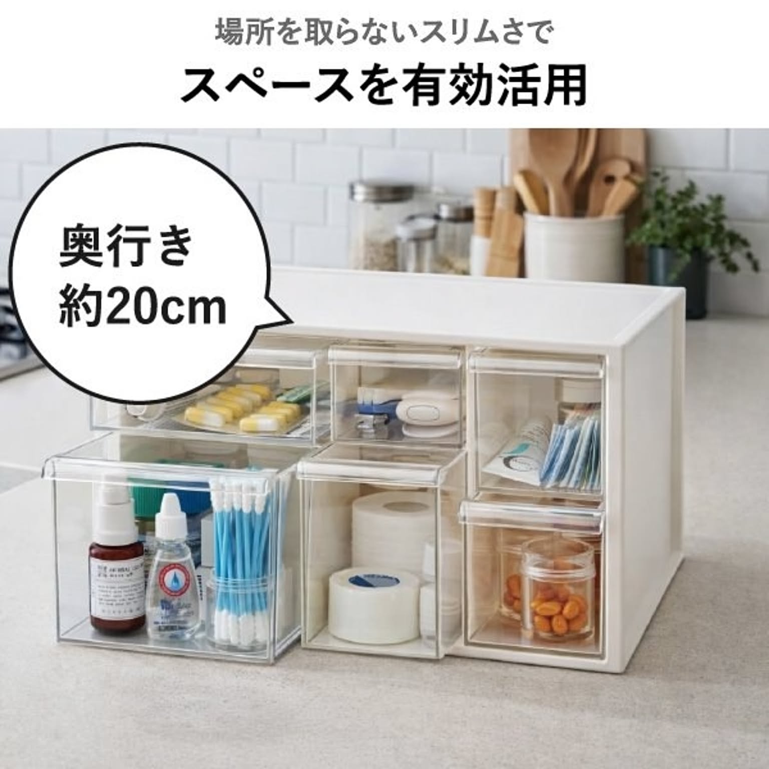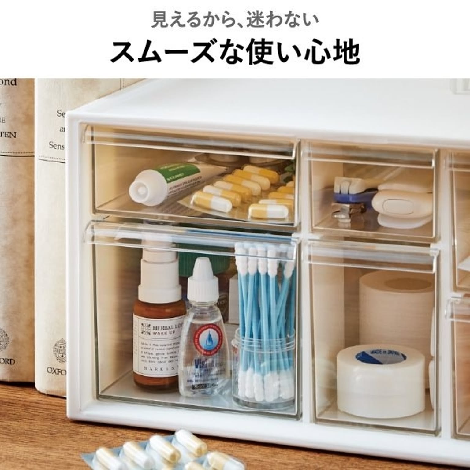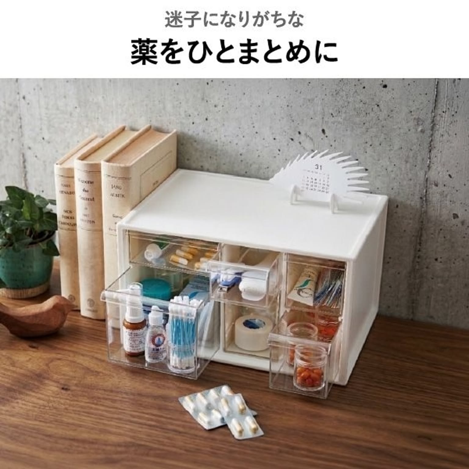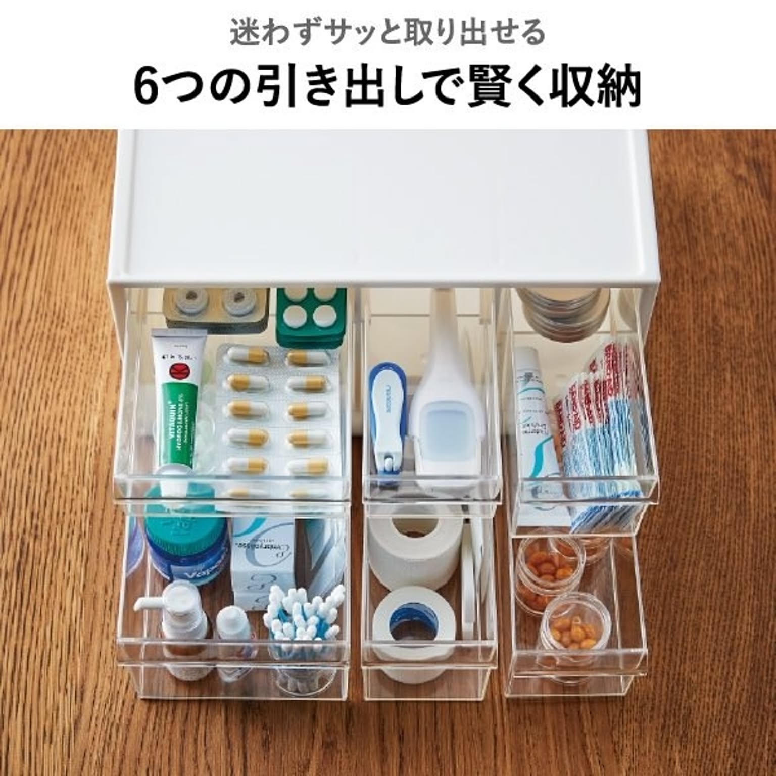 バラバラになりがちな薬やサプリを、すっきり整理整頓できるおしゃれなお薬ケースです。このお薬ケースは6つの引き出しで種類ごとに細かく仕分けができるため、家族の常備薬をこれ一つにまとめて整理できます。透明な引き出しは中身が一目で確認できるので、迷わずサッと取り出せます。薬やサプリの飲み忘れ防止やストック切れにも役立つ機能的なお薬ケース。リビングやキッチンに置いてもお部屋の雰囲気を壊さないおしゃれなデザインのお薬ケースは、生活感が出すぎず、空間をすっきりと見せてくれます。さらに、このお薬ケースは細々とした小物をスマートに片付けることができるマルチな収納としても大活躍。キッチン用品や文房具など散らかりがちな物もおしゃれに片付き、暮らしをより快適に整えることができます。