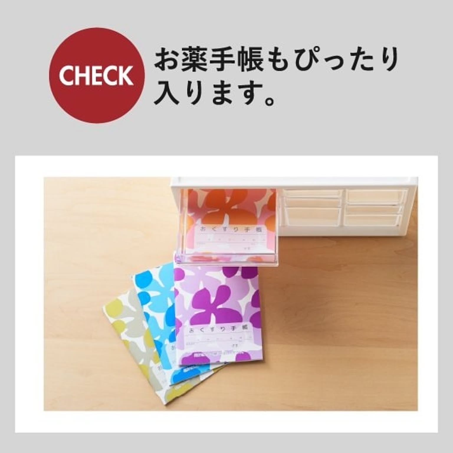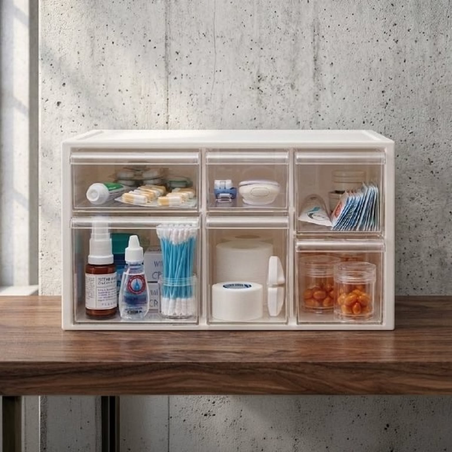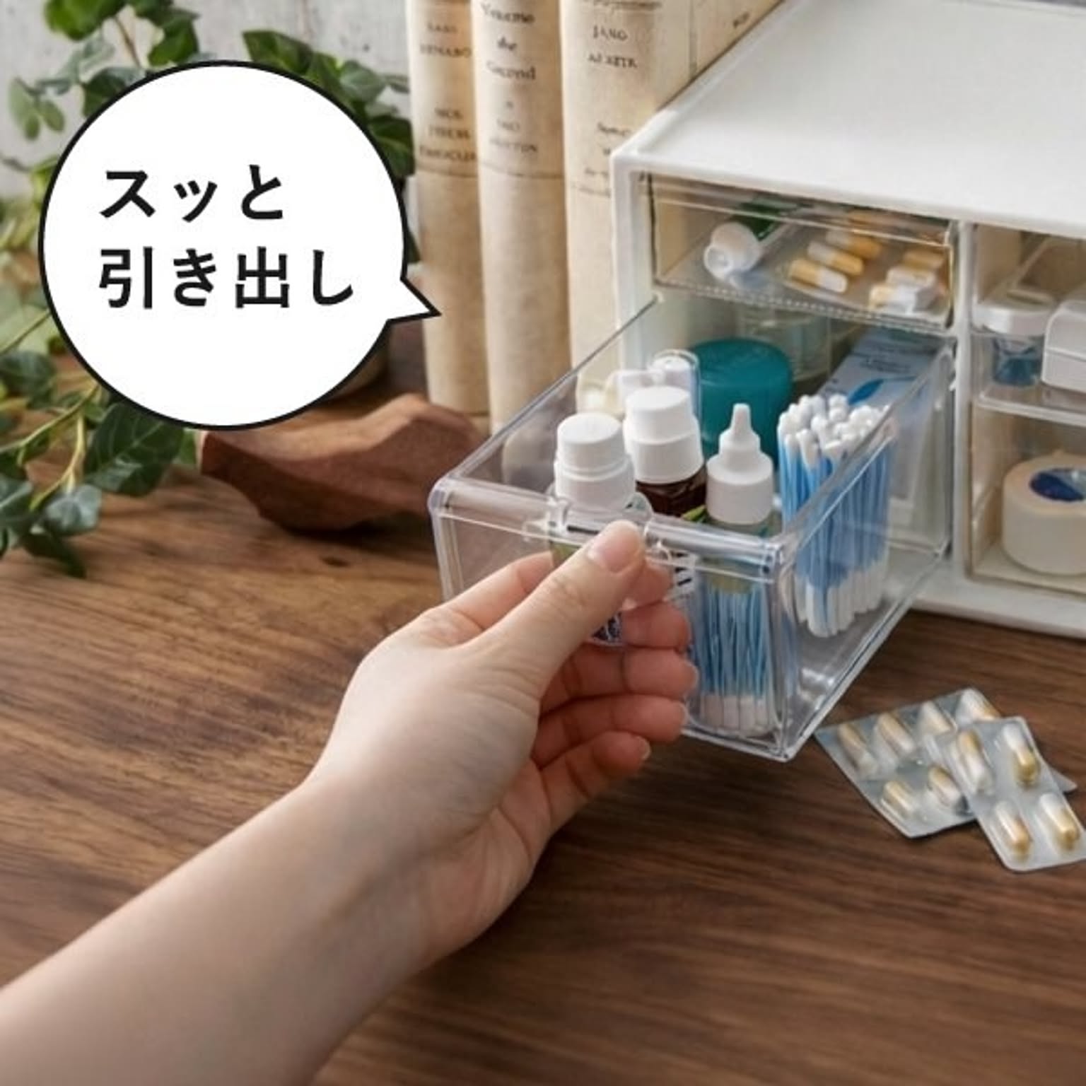 バラバラになりがちな薬やサプリを、すっきり整理整頓できるおしゃれなお薬ケースです。このお薬ケースは6つの引き出しで種類ごとに細かく仕分けができるため、家族の常備薬をこれ一つにまとめて整理できます。透明な引き出しは中身が一目で確認できるので、迷わずサッと取り出せます。薬やサプリの飲み忘れ防止やストック切れにも役立つ機能的なお薬ケース。リビングやキッチンに置いてもお部屋の雰囲気を壊さないおしゃれなデザインのお薬ケースは、生活感が出すぎず、空間をすっきりと見せてくれます。さらに、このお薬ケースは細々とした小物をスマートに片付けることができるマルチな収納としても大活躍。キッチン用品や文房具など散らかりがちな物もおしゃれに片付き、暮らしをより快適に整えることができます。
