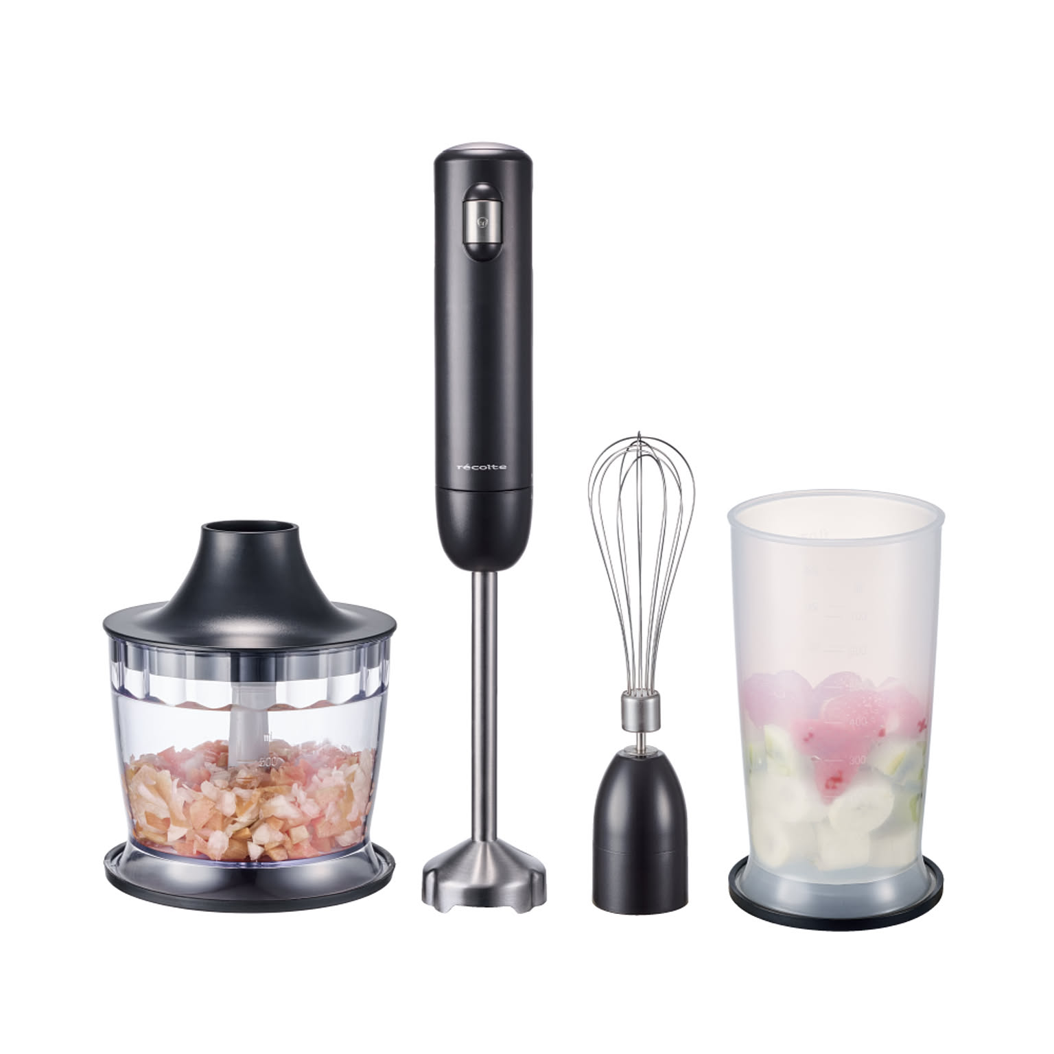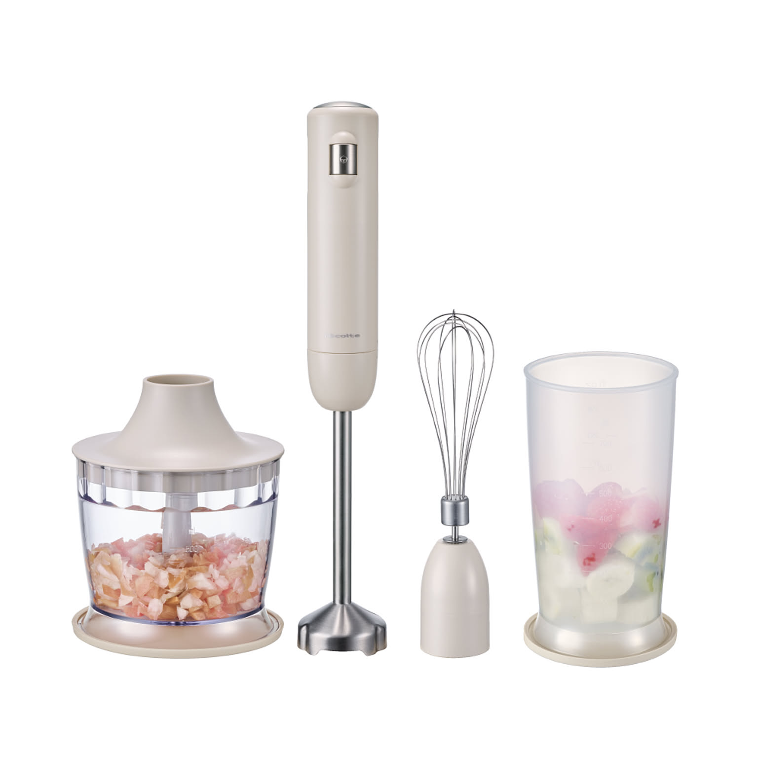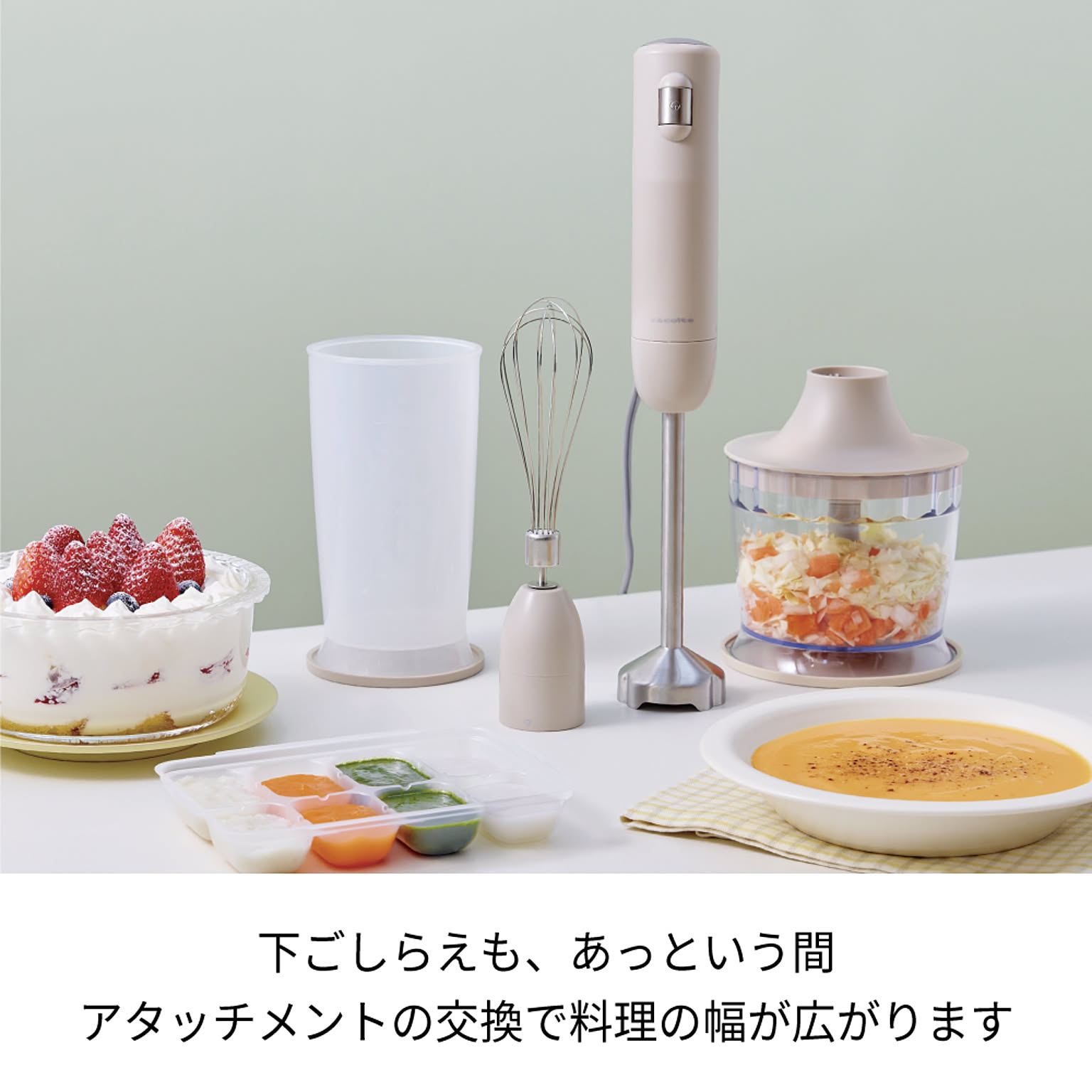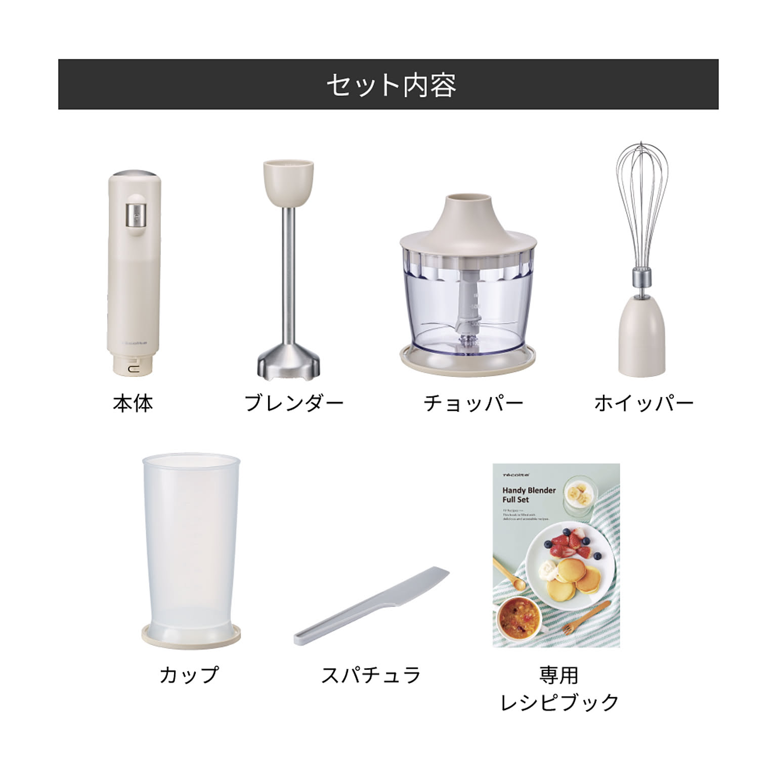 泡立て用の[ホイッパー]や、みじん切りができる[チョッパー]などのアタッチメントが付属したフルセットです。