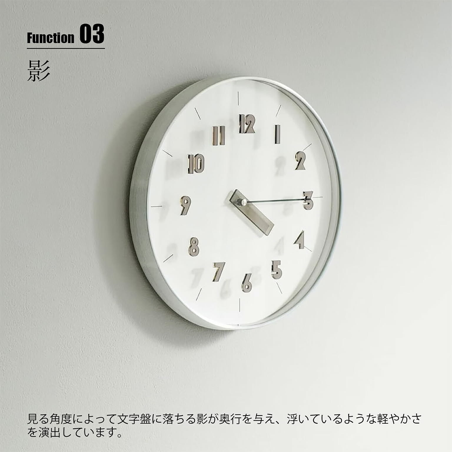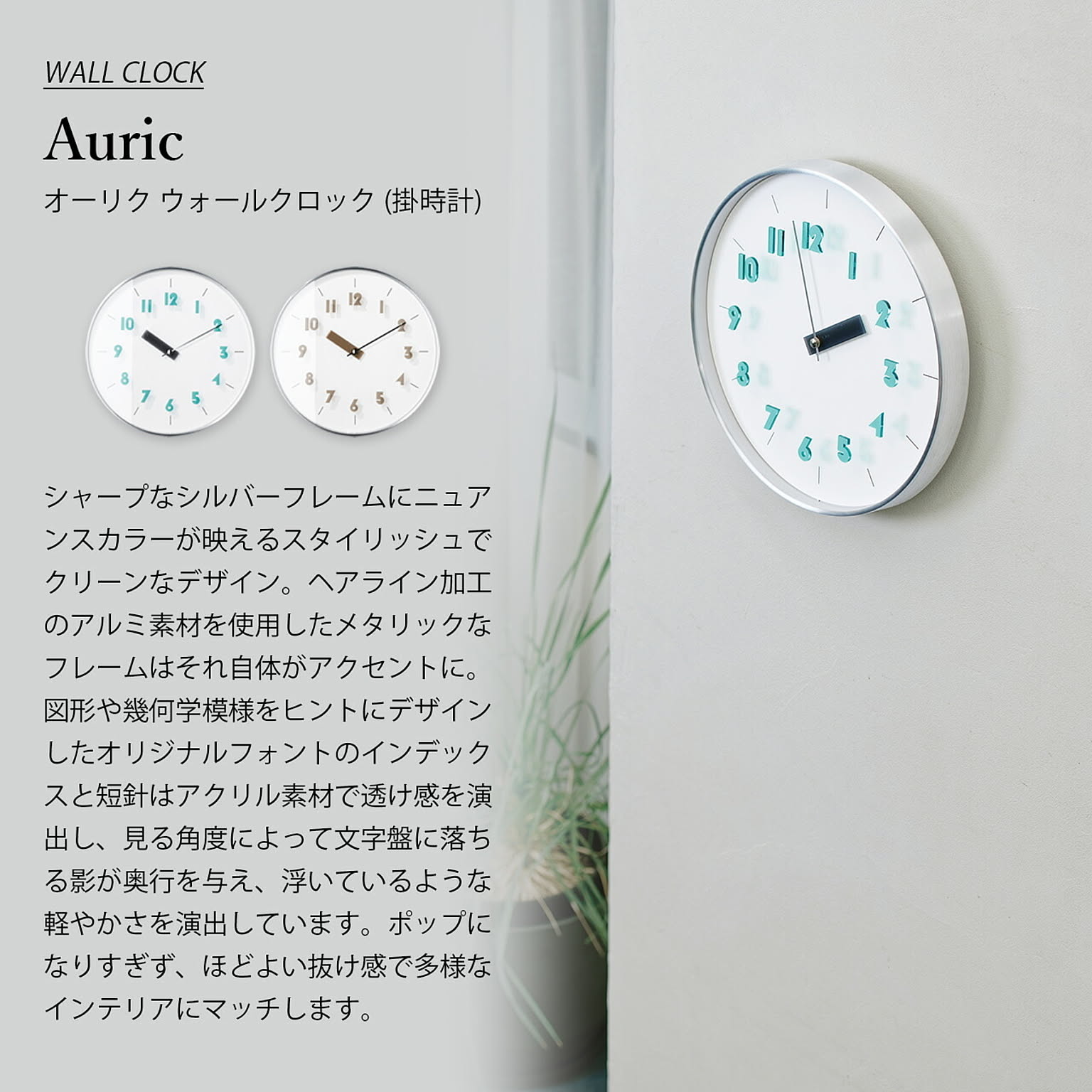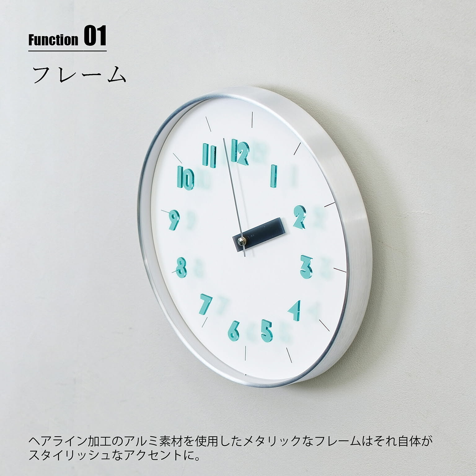 シャープなシルバーフレームにニュアンスカラーが映えるスタイリッシュでクリーンなデザイン。ヘアライン加工のアルミ素材を使用したメタリックなフレームはそれ自体がアクセントに。図形や幾何学模様をヒントにデザインしたオリジナルフォントのインデックスと短針はアクリル素材で透け感を演出し、見る角度によって文字盤に落ちる影が奥行を与え、浮いているような軽やかさを演出しています。ポップになりすぎず、ほどよい抜け感で多様なインテリアにマッチします。