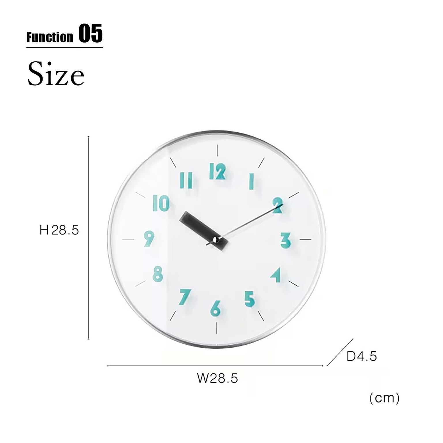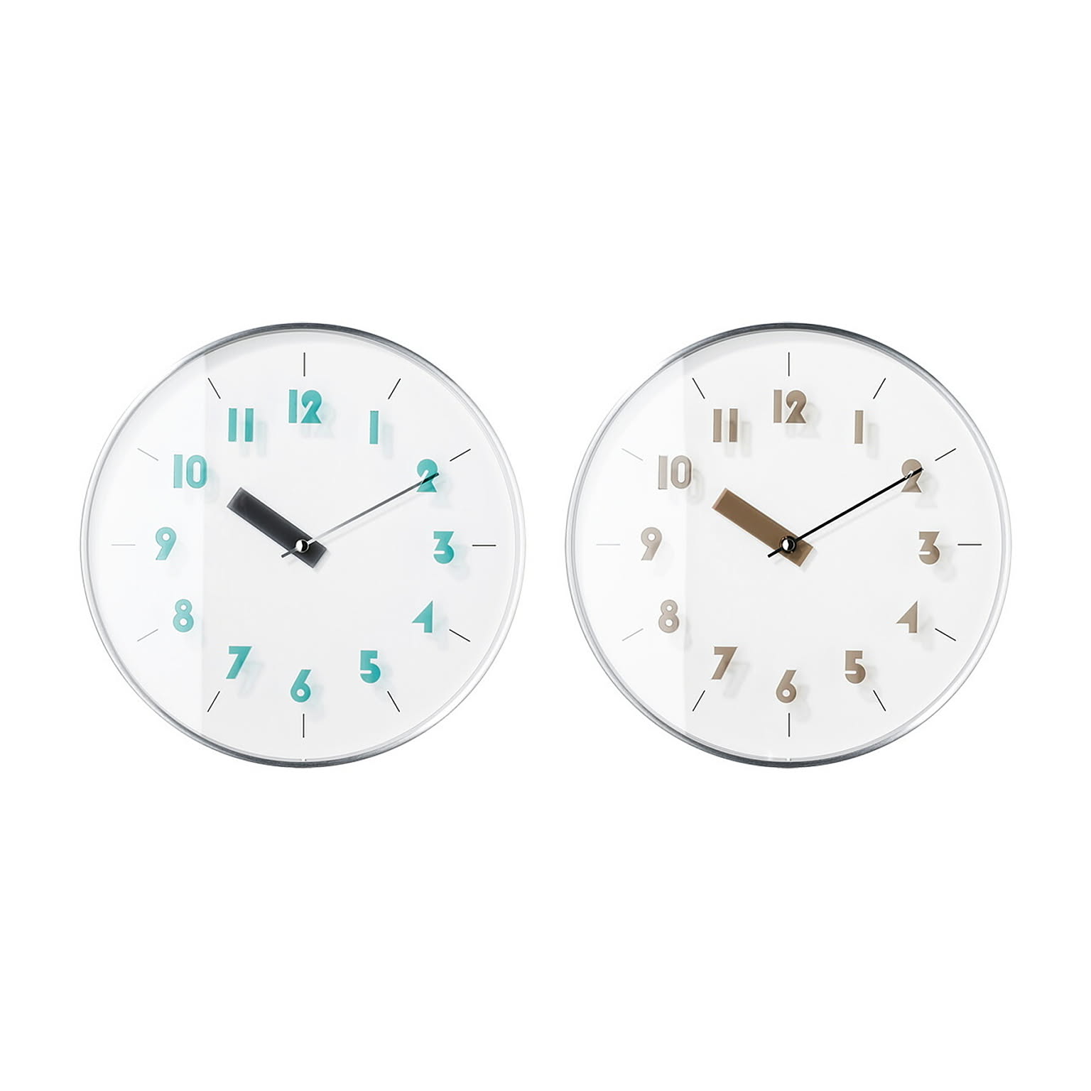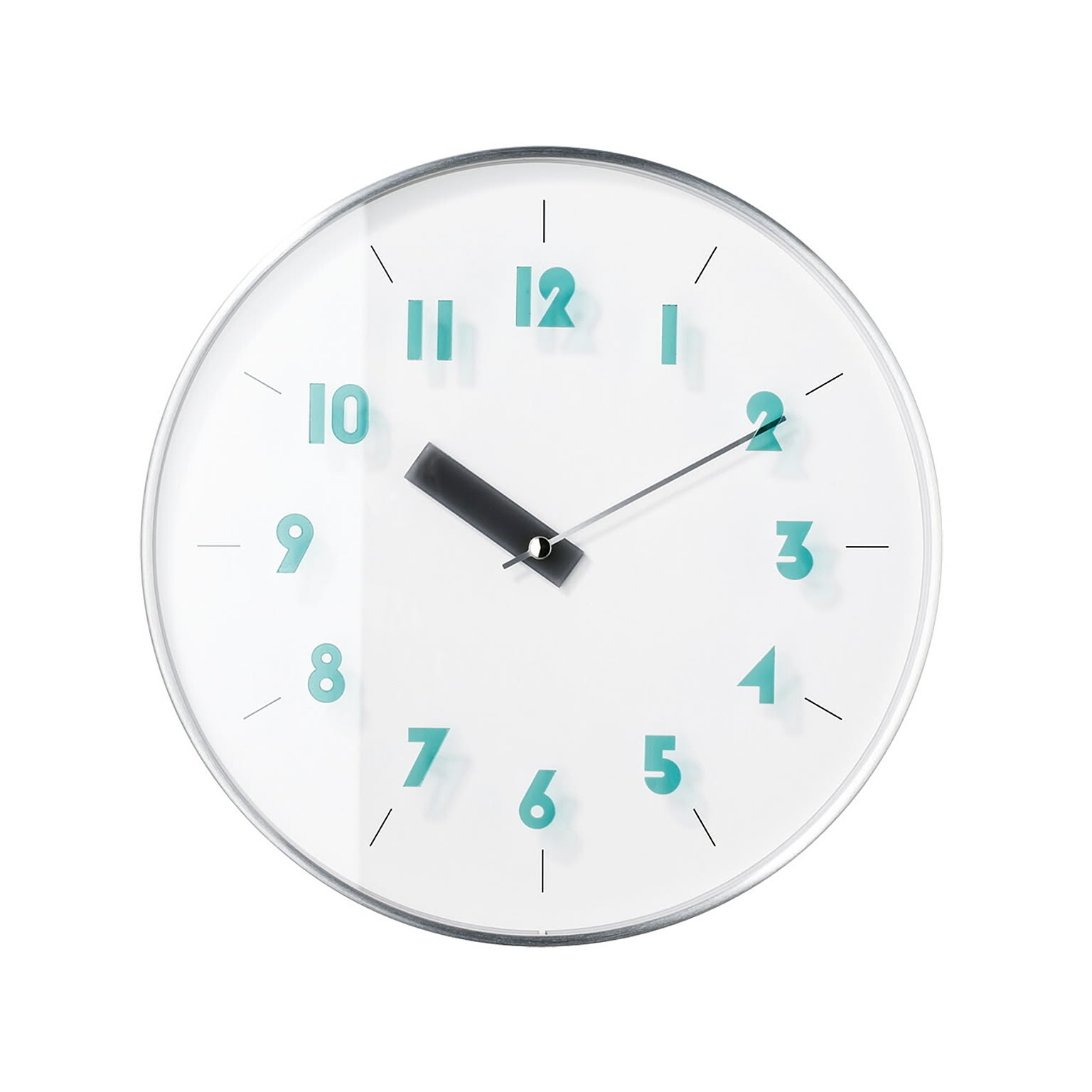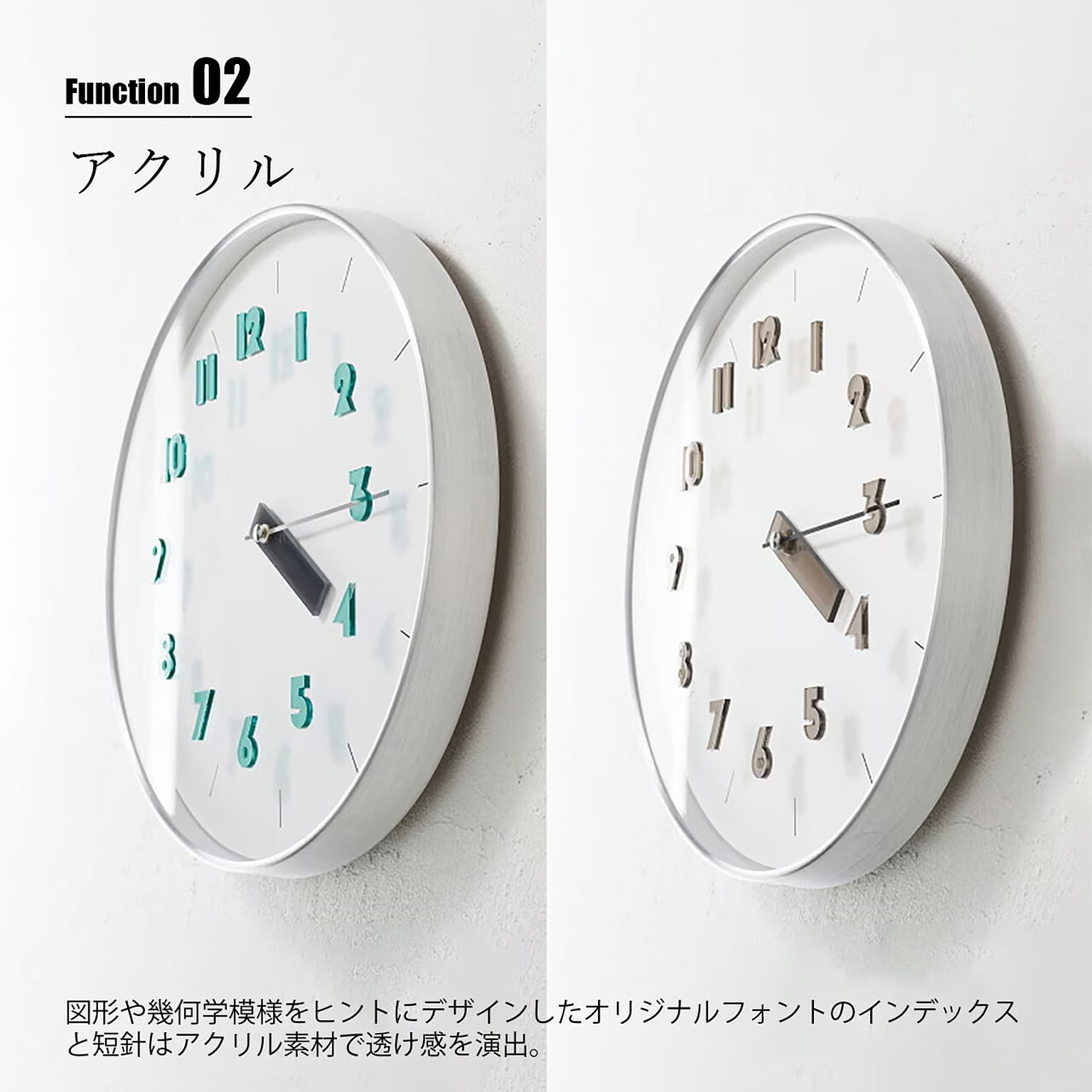 シャープなシルバーフレームにニュアンスカラーが映えるスタイリッシュでクリーンなデザイン。ヘアライン加工のアルミ素材を使用したメタリックなフレームはそれ自体がアクセントに。図形や幾何学模様をヒントにデザインしたオリジナルフォントのインデックスと短針はアクリル素材で透け感を演出し、見る角度によって文字盤に落ちる影が奥行を与え、浮いているような軽やかさを演出しています。ポップになりすぎず、ほどよい抜け感で多様なインテリアにマッチします。