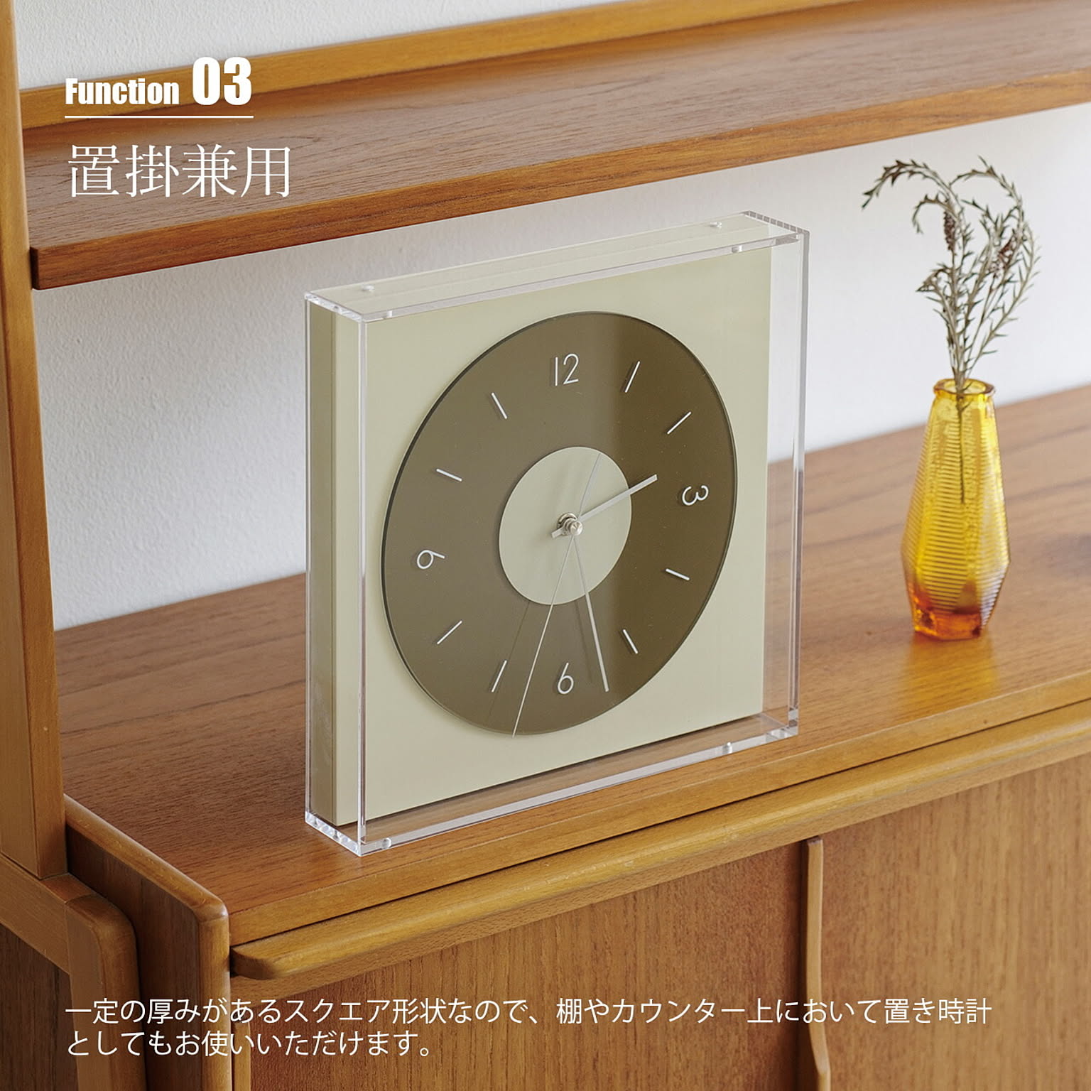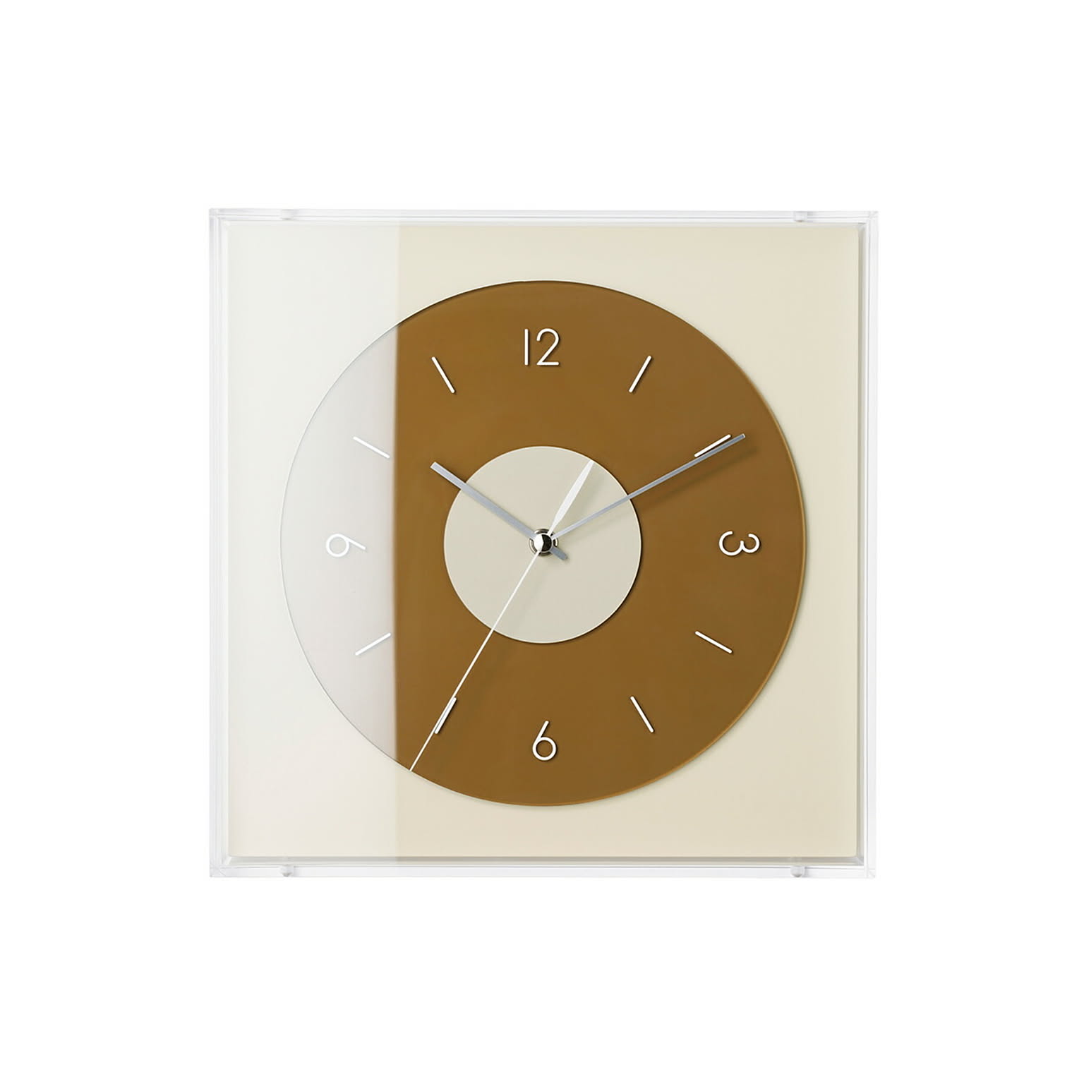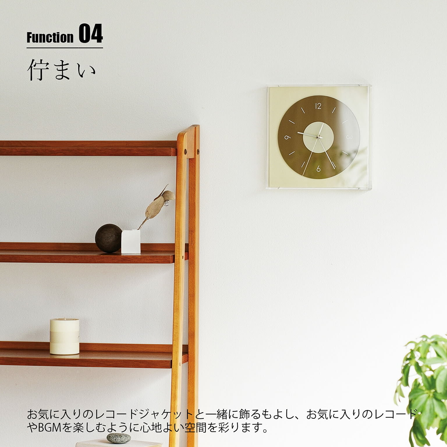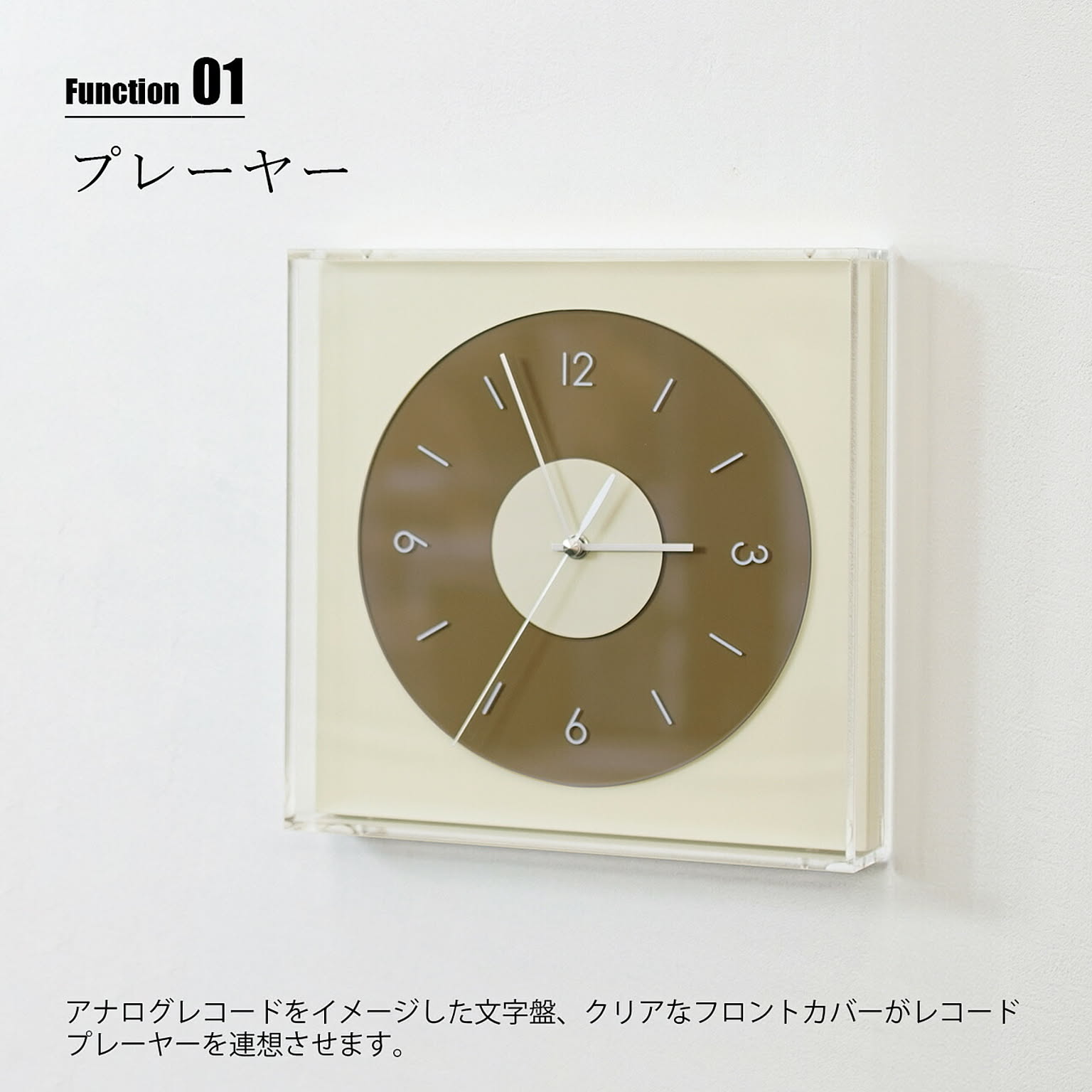 レコードプレイヤーをモチーフにしたレトロフューチャーのエッセンスあふれるデザイン。アナログレコードをイメージした文字盤の上をトーンアームのような秒針が滑らかに回り、クリアなフロントカバーがレコードプレーヤーを連想させます。ベージュにブラウンを合わせたウォームトーンのカラーリング。お気に入りのレコードやBGMを楽しむように心地よい空間を彩ります。一定の厚みがあるスクエア形状なので、棚やカウンター上において置き時計としてもお使いいただけます。