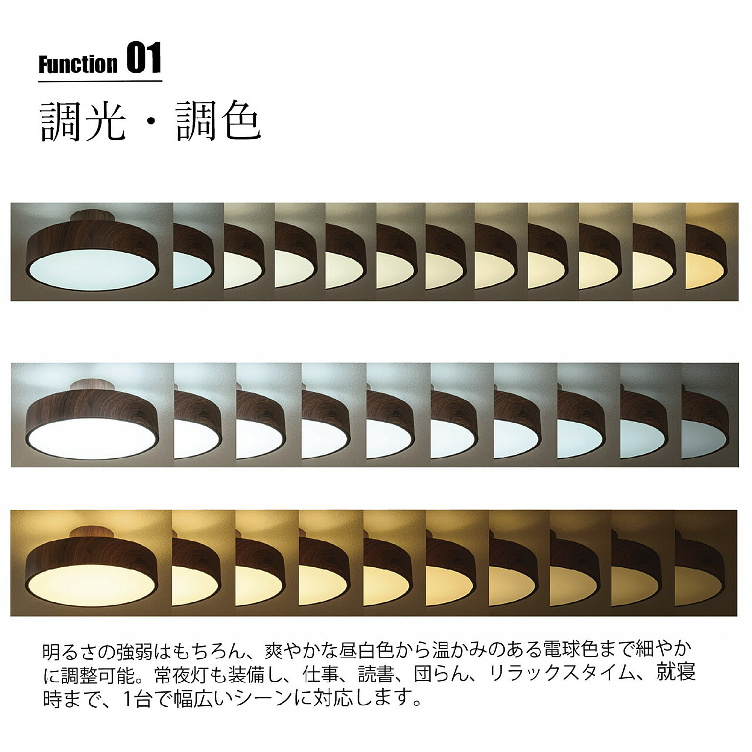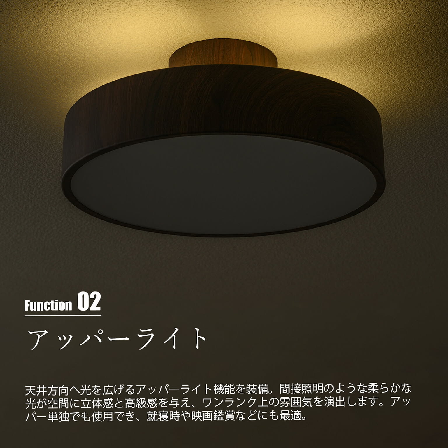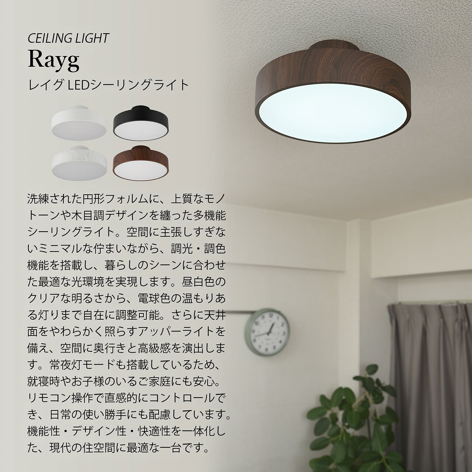洗練された円形フォルムに、上質なモノトーンや木目調デザインを纏った多機能シーリングライト。空間に主張しすぎないミニマルな佇まいながら、調光・調色機能を搭載し、暮らしのシーンに合わせた最適な光環境を実現します。昼白色のクリアな明るさから、電球色の温もりある灯りまで自在に調整可能。さらに天井面をやわらかく照らすアッパーライトを備え、空間に奥行きと高級感を演出します。常夜灯モードも搭載しているため、就寝時やお子様のいるご家庭にも安心。リモコン操作で直感的にコントロールでき、日常の使い勝手にも配慮しています。機能性・デザイン性・快適性を一体化した、現代の住空間に最適な一台です。
