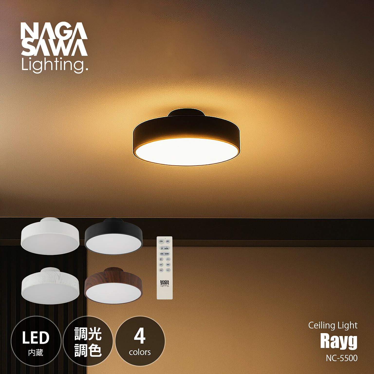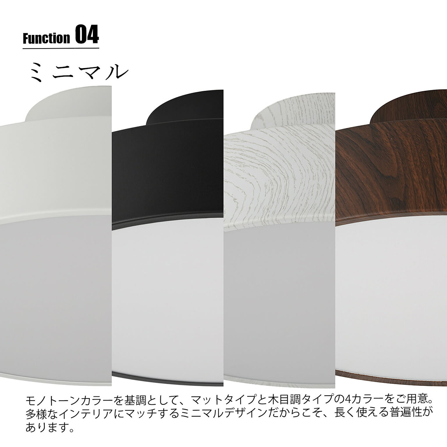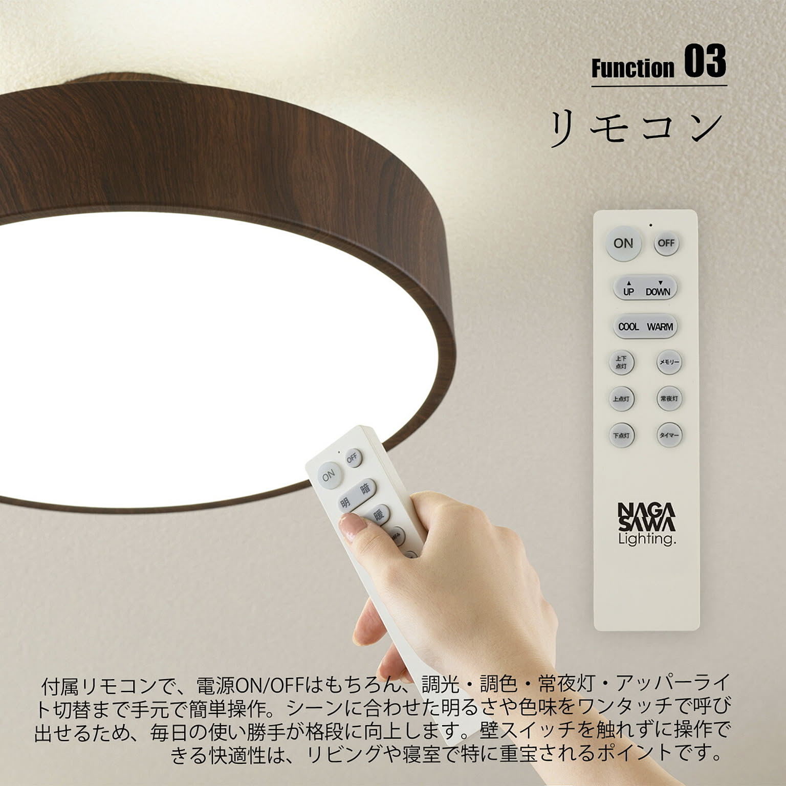 洗練された円形フォルムに、上質なモノトーンや木目調デザインを纏った多機能シーリングライト。空間に主張しすぎないミニマルな佇まいながら、調光・調色機能を搭載し、暮らしのシーンに合わせた最適な光環境を実現します。昼白色のクリアな明るさから、電球色の温もりある灯りまで自在に調整可能。さらに天井面をやわらかく照らすアッパーライトを備え、空間に奥行きと高級感を演出します。常夜灯モードも搭載しているため、就寝時やお子様のいるご家庭にも安心。リモコン操作で直感的にコントロールでき、日常の使い勝手にも配慮しています。機能性・デザイン性・快適性を一体化した、現代の住空間に最適な一台です。