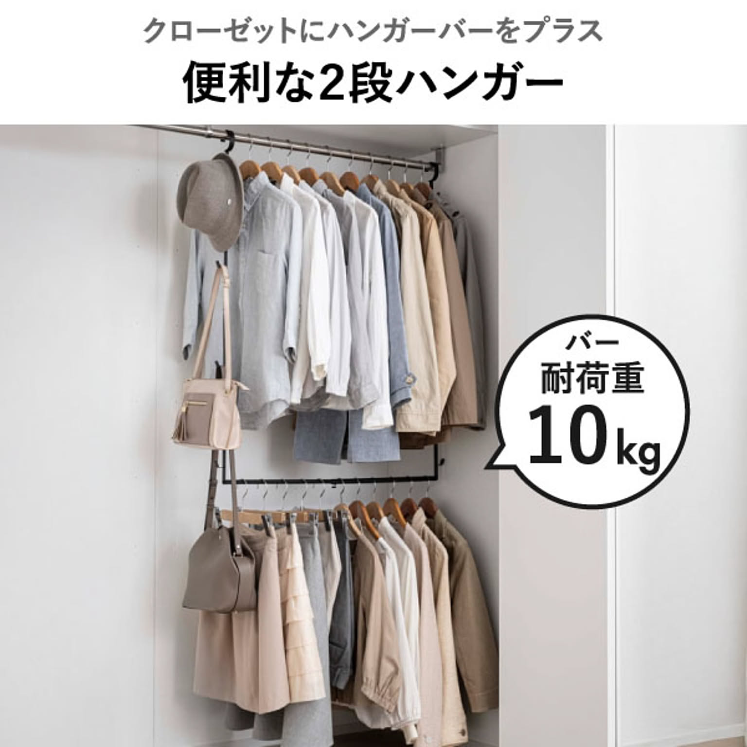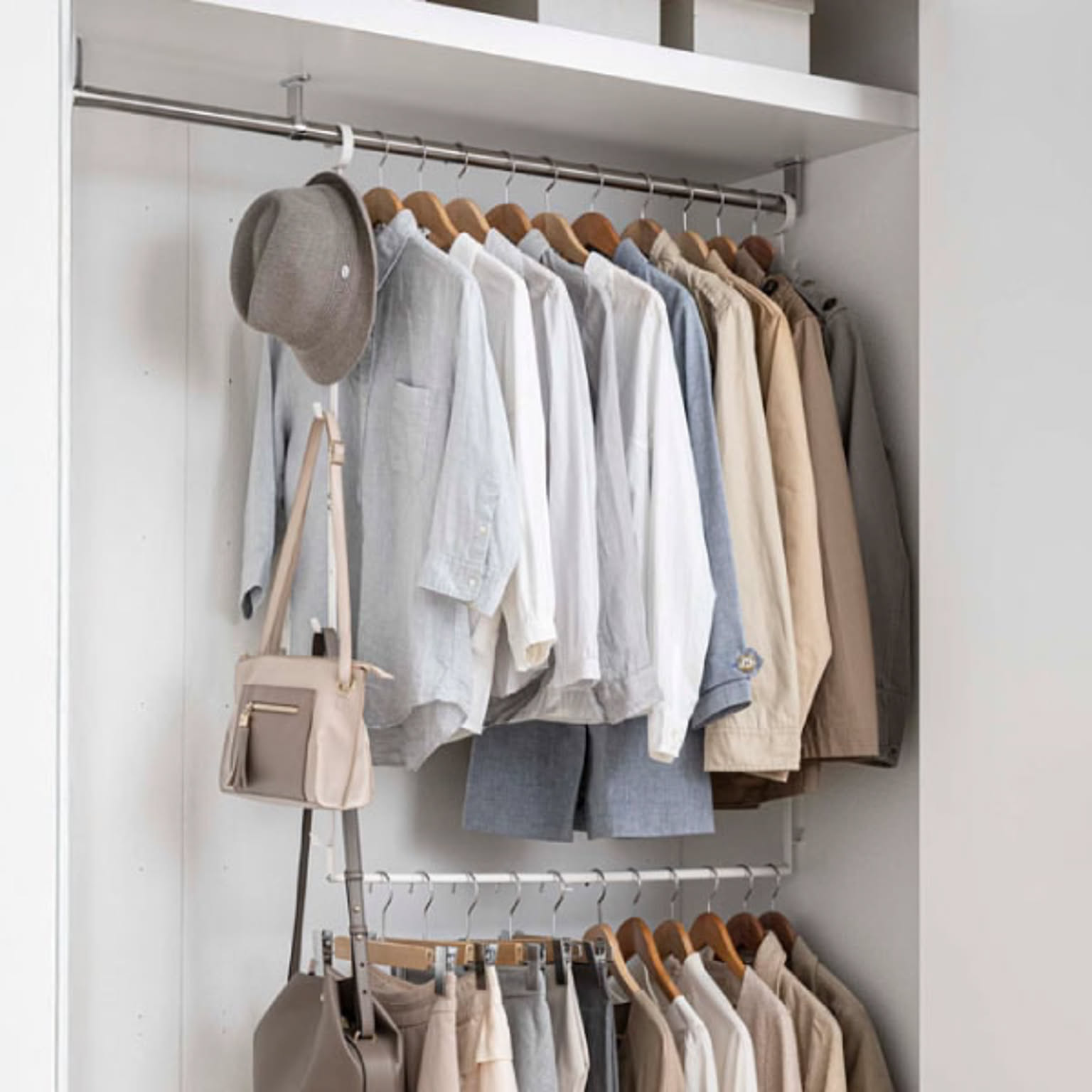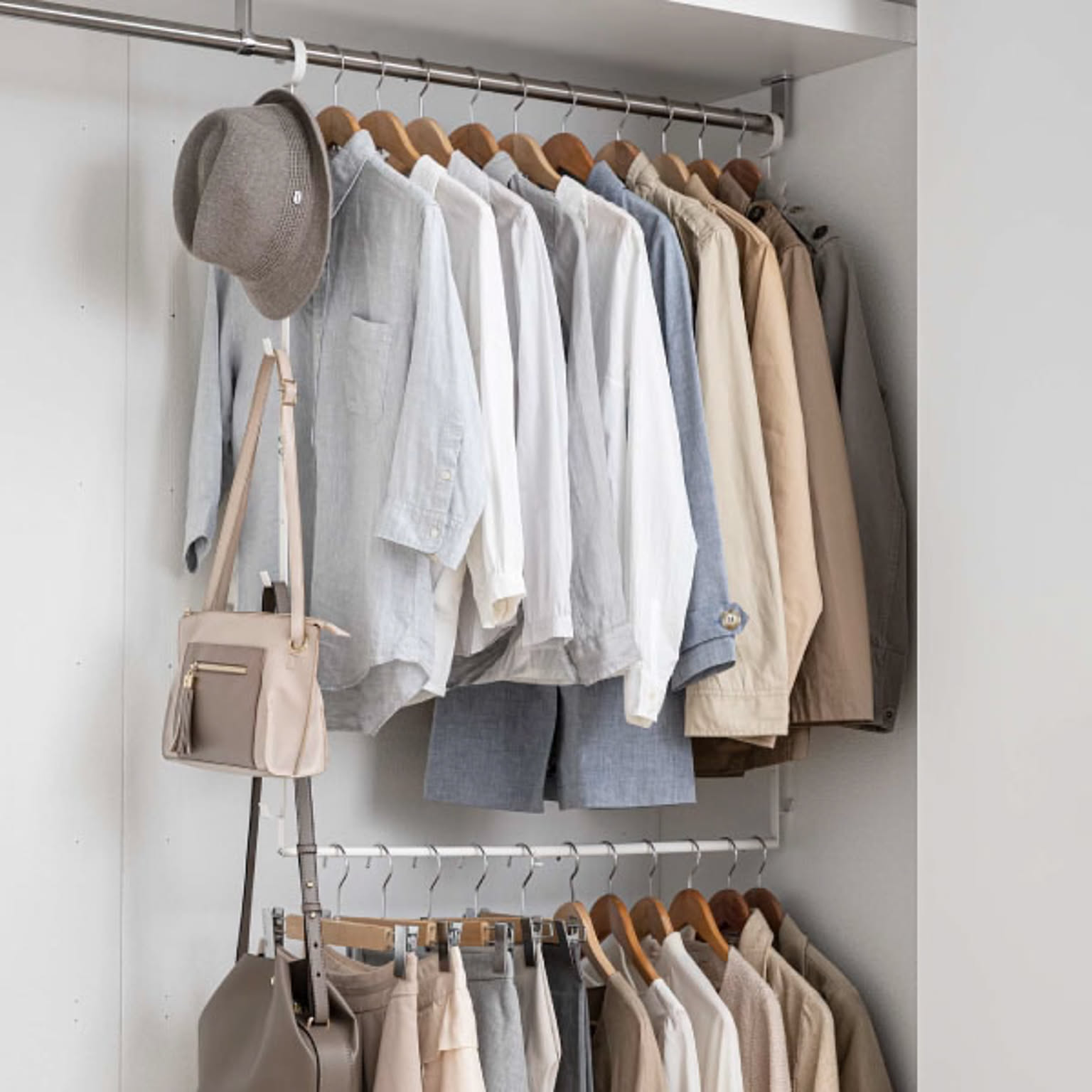 上段にトップス、下段にボトムスなど、種類別に分けて掛けられて便利。