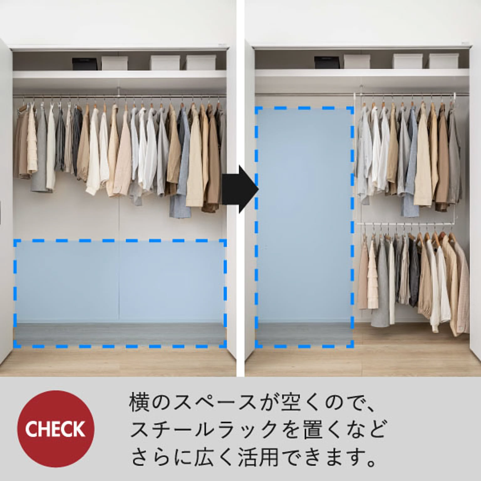 衣類下のデッドスペースを活かして、さらに吊り下げ収納スペースをプラス。