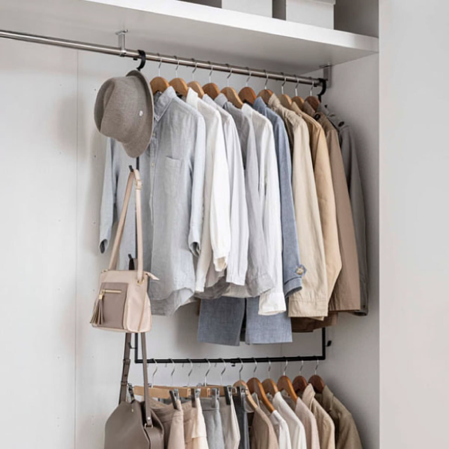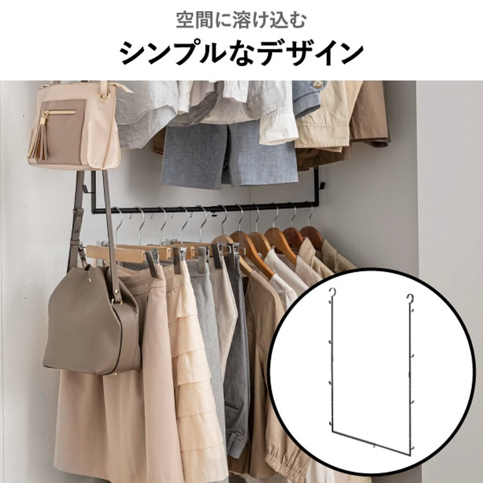 無駄のないシンプルな吊り下げ収納二段ハンガーなので、空間にそっと溶け込みます。
