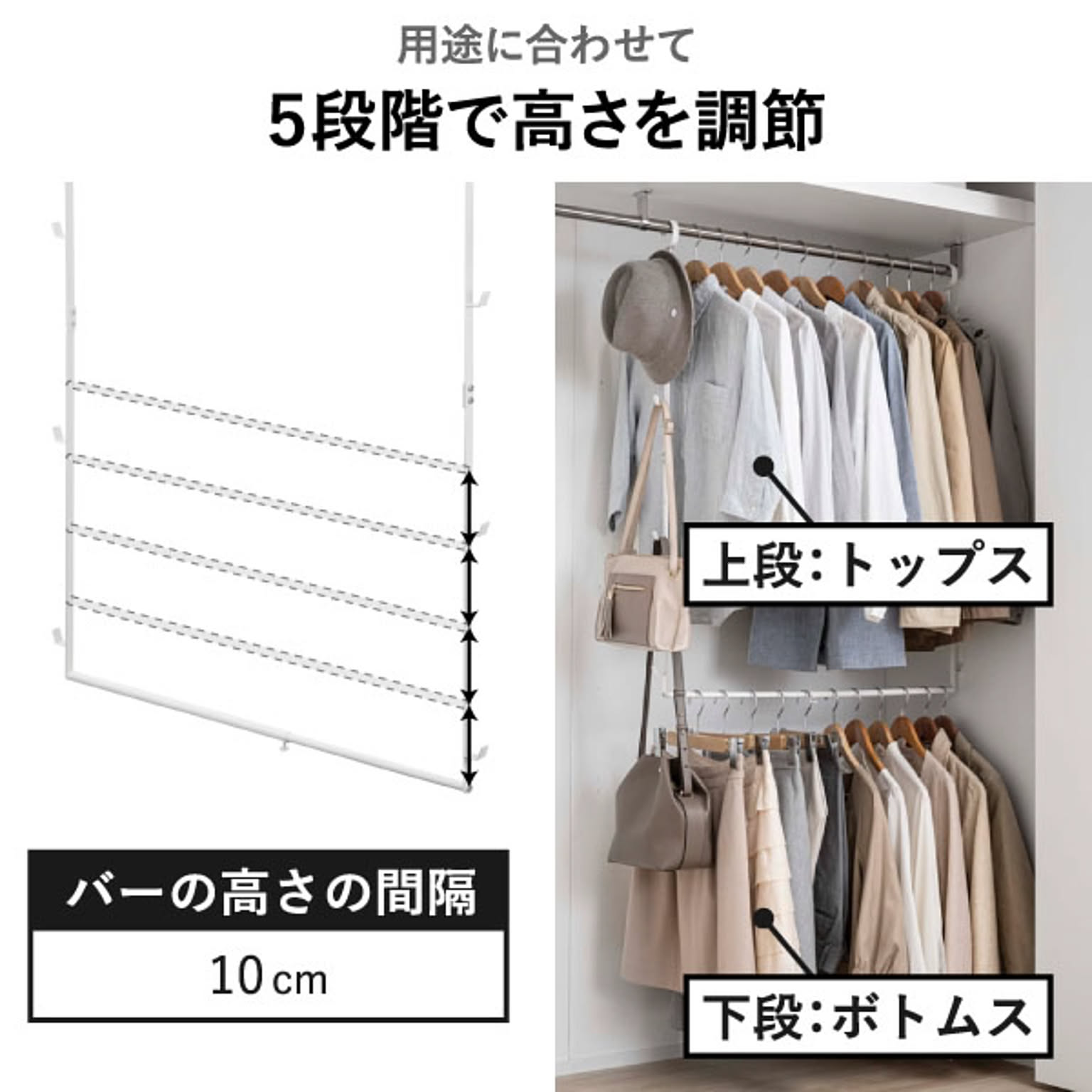 掛けたい衣類の種類に合わせて、二段ハンガーのバーの高さを、5段階で変更できます。