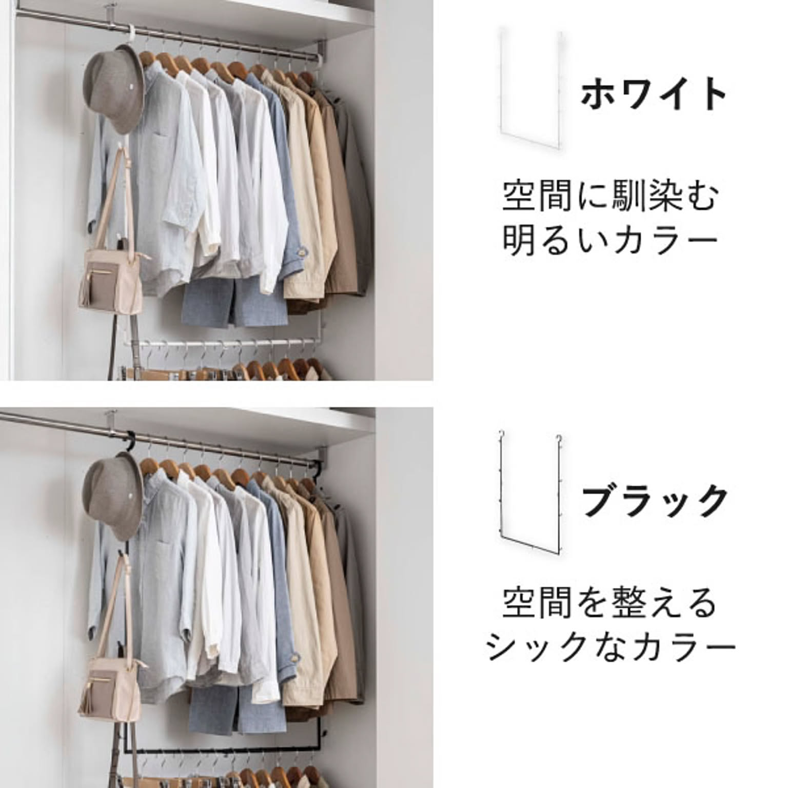 クローゼット二段ハンガーの色は、ホワイトとブラックの2色からお選びいただけます。