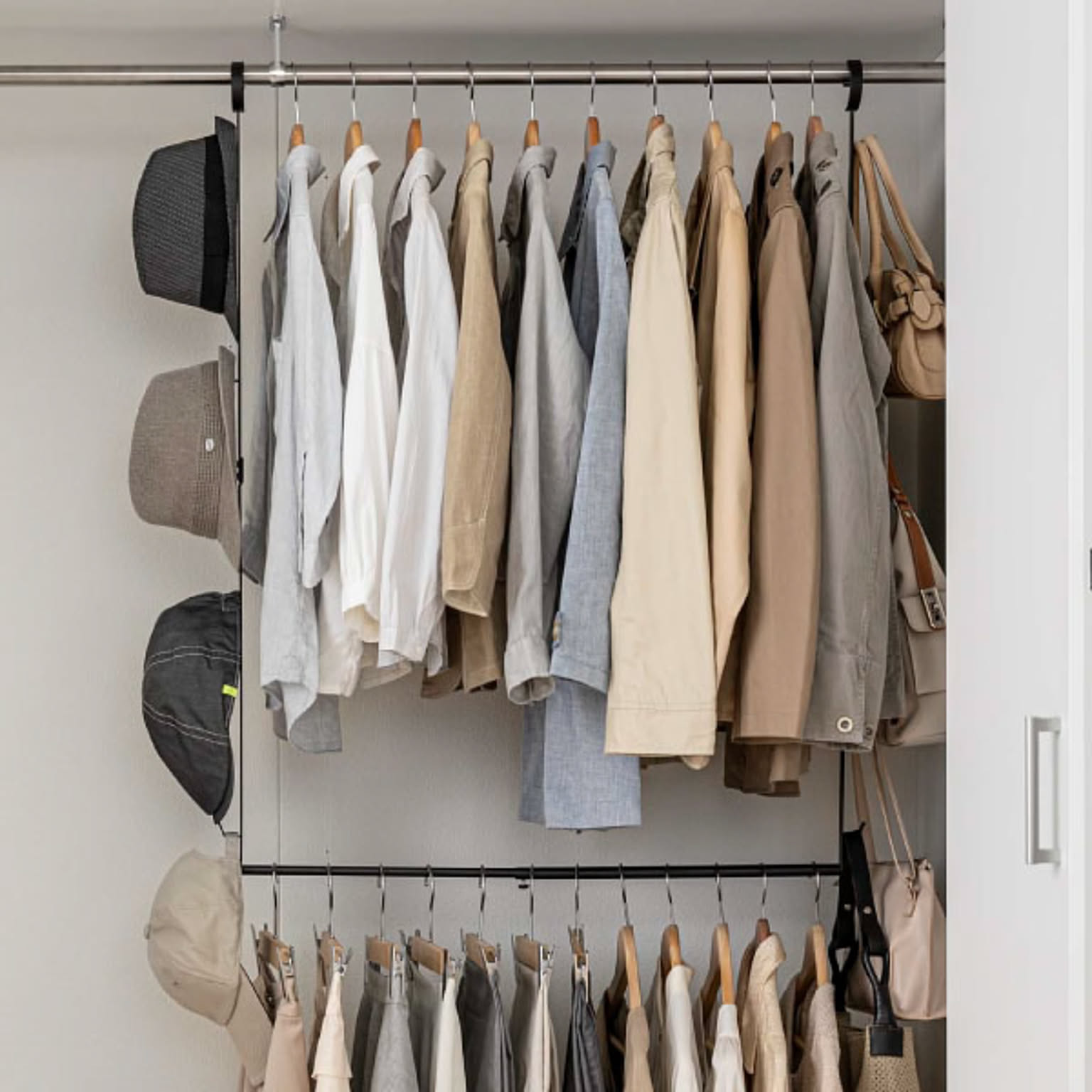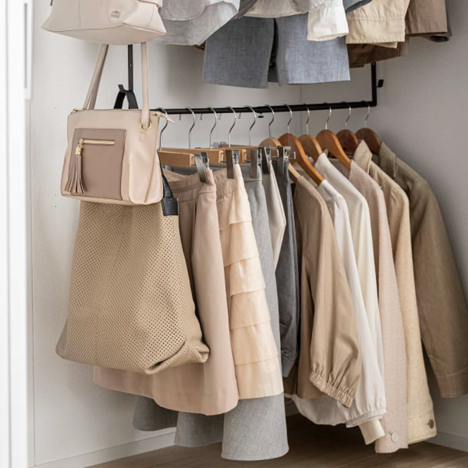 バッグや帽子、ベルトやスカーフなども衣類と一緒に収納できて便利です。