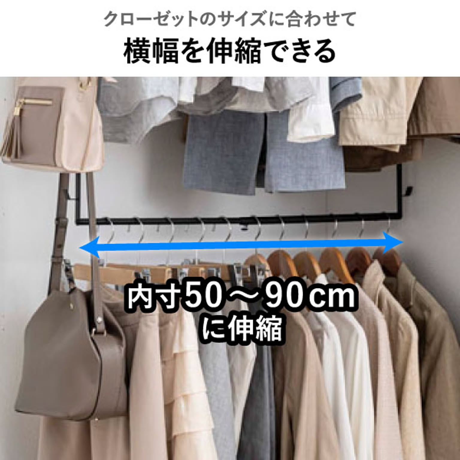 吊り下げ収納二段ハンガーは、横幅を調節できる伸縮式です。