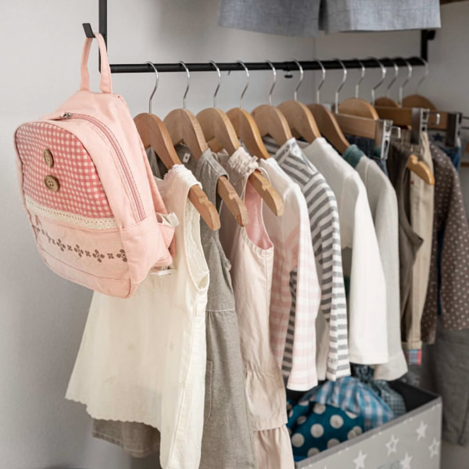 吊り下げ収納二段ハンガーのバーを低い位置にすることで、お子様が自分で取りやすい高さに。