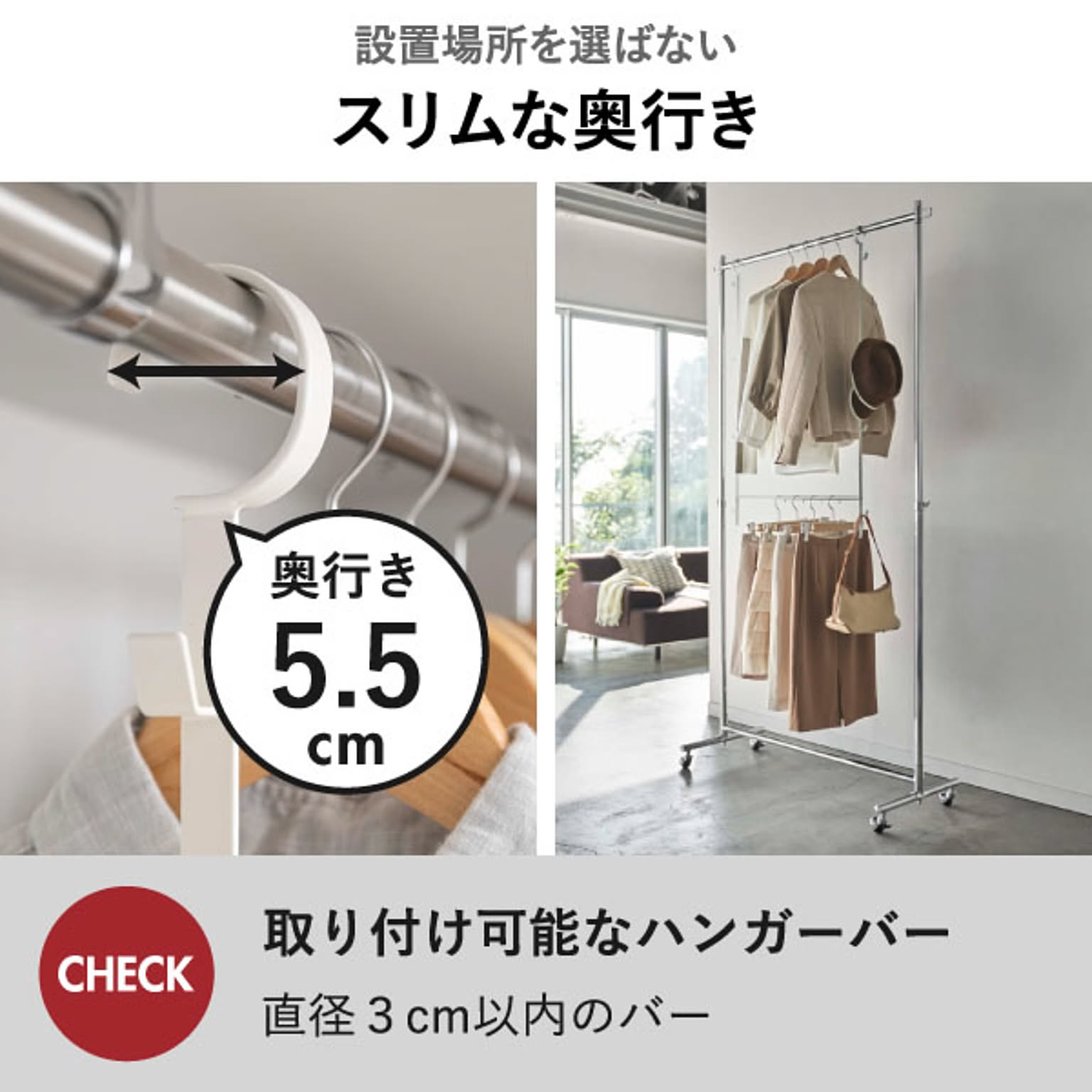 スリムな奥行きの二段ハンガーだから、置く場所を選びません。