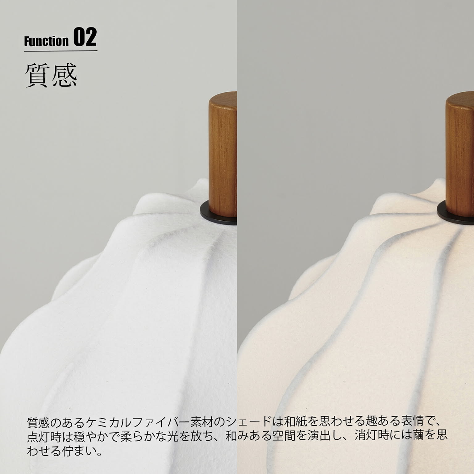 「和を感じられるフロアライト」をコンセプトにした、高級旅館を想起させる品のある佇まいが印象的。アールを各所に取り入れたやわらかなシルエットと行燈のように足元から灯る構造が様々なシーンにフィットします。質感のあるケミカルファイバー素材のシェードは和紙を思わせる趣ある表情で、点灯時は穏やかで柔らかな光を放ち、和みある空間を演出し、消灯時には繭を思わせる佇まいで、まるでオブジェのような存在感。ベースやトップに贅沢に削り出したアッシュ材を使用。上品な佇まいが和モダンな雰囲気を盛り上げます。