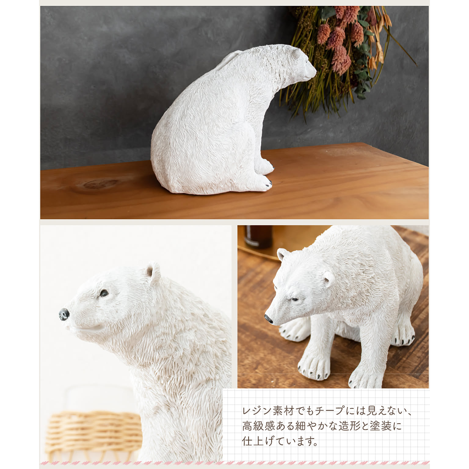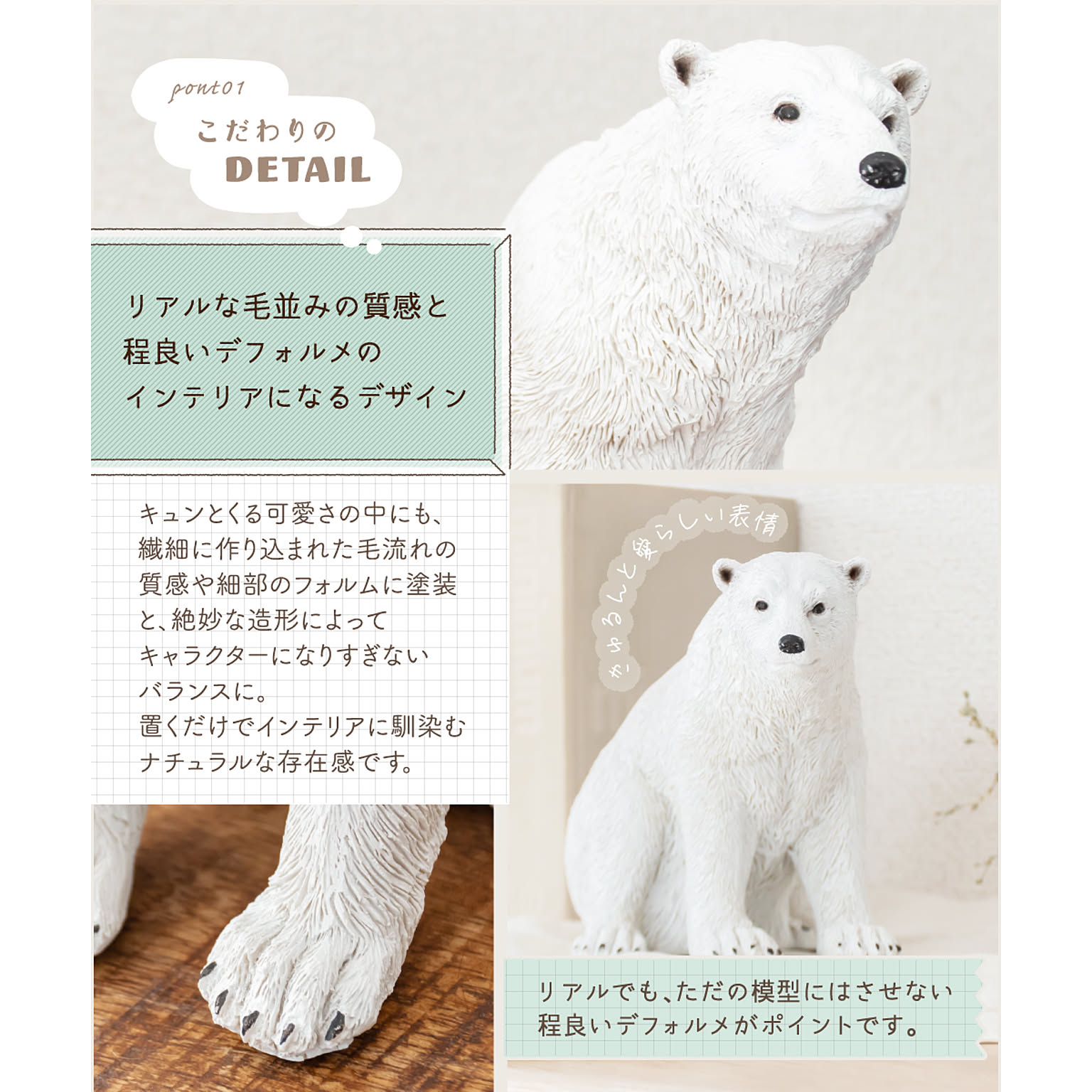 シロクマ好きならではの、繊細な毛並みやリアルなフォルムの中にも愛らしい表情を持った程良いデフォルメが魅力です。
