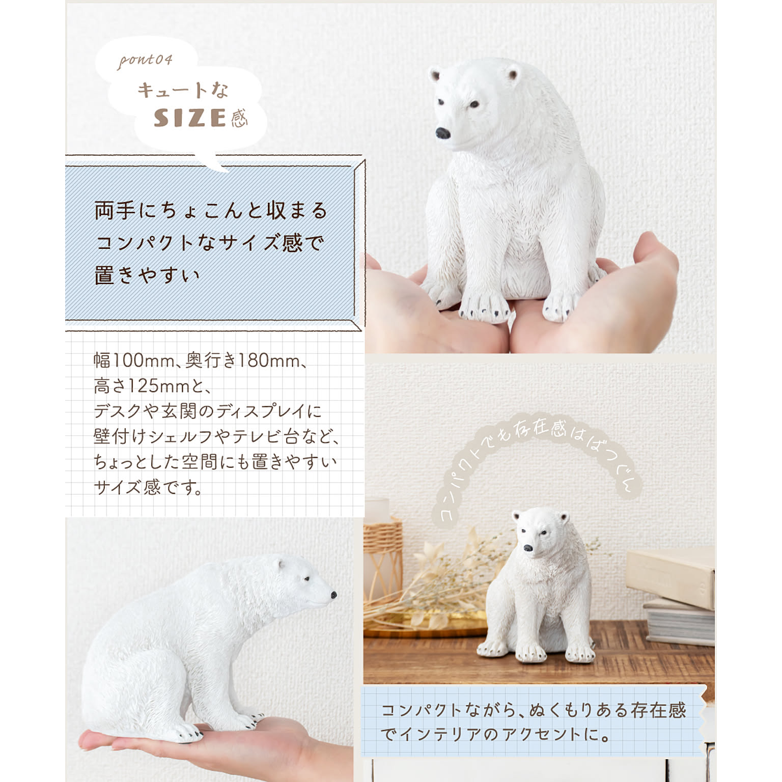 両手にちょこんと収まるコンパクトさで、ちょっとした空間にも飾りやすいサイズ感です。