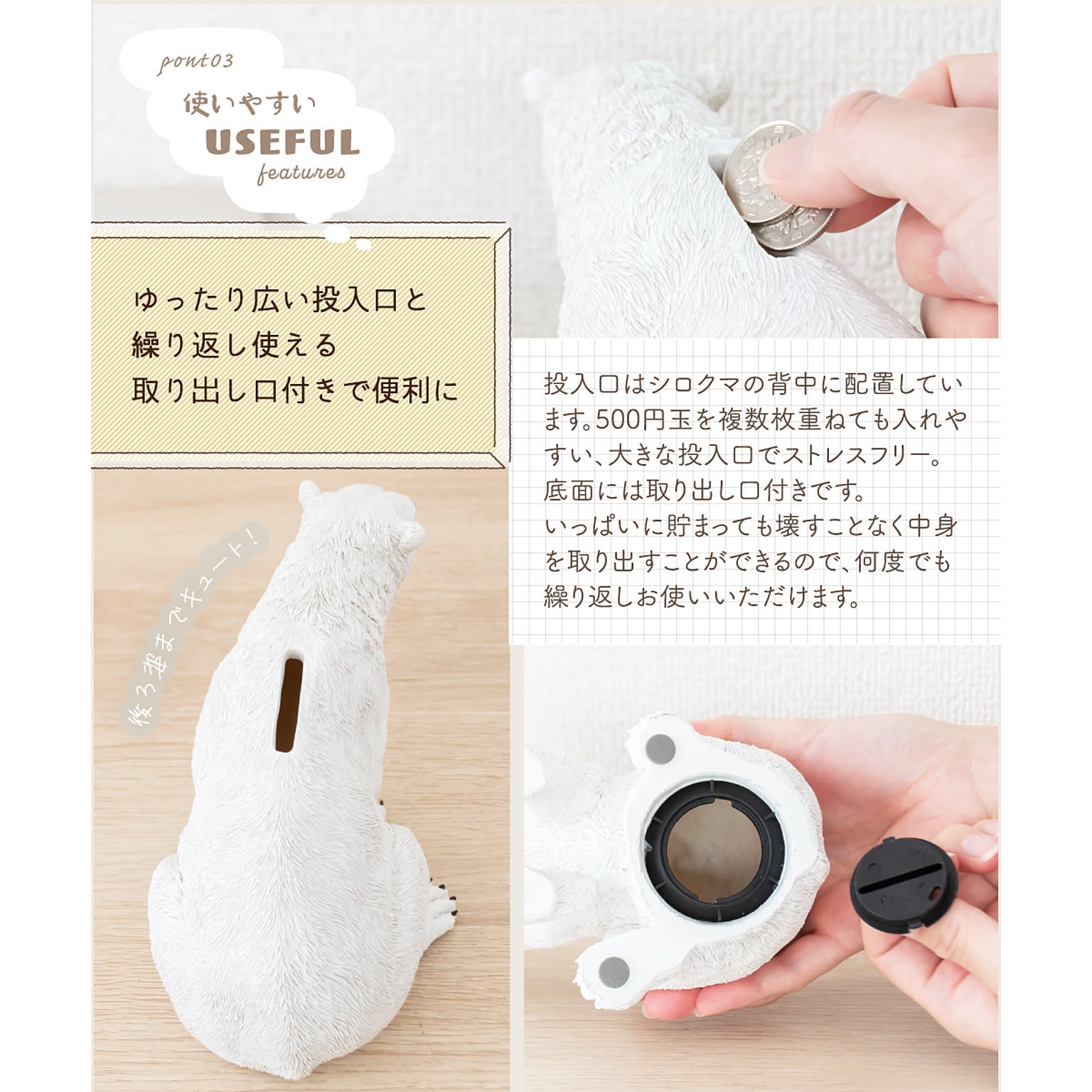 500円玉を重ねても入れやすい広い投入口に、壊さず中身を取り出せる取り出し口付きと使いやすさにもこだわっています。