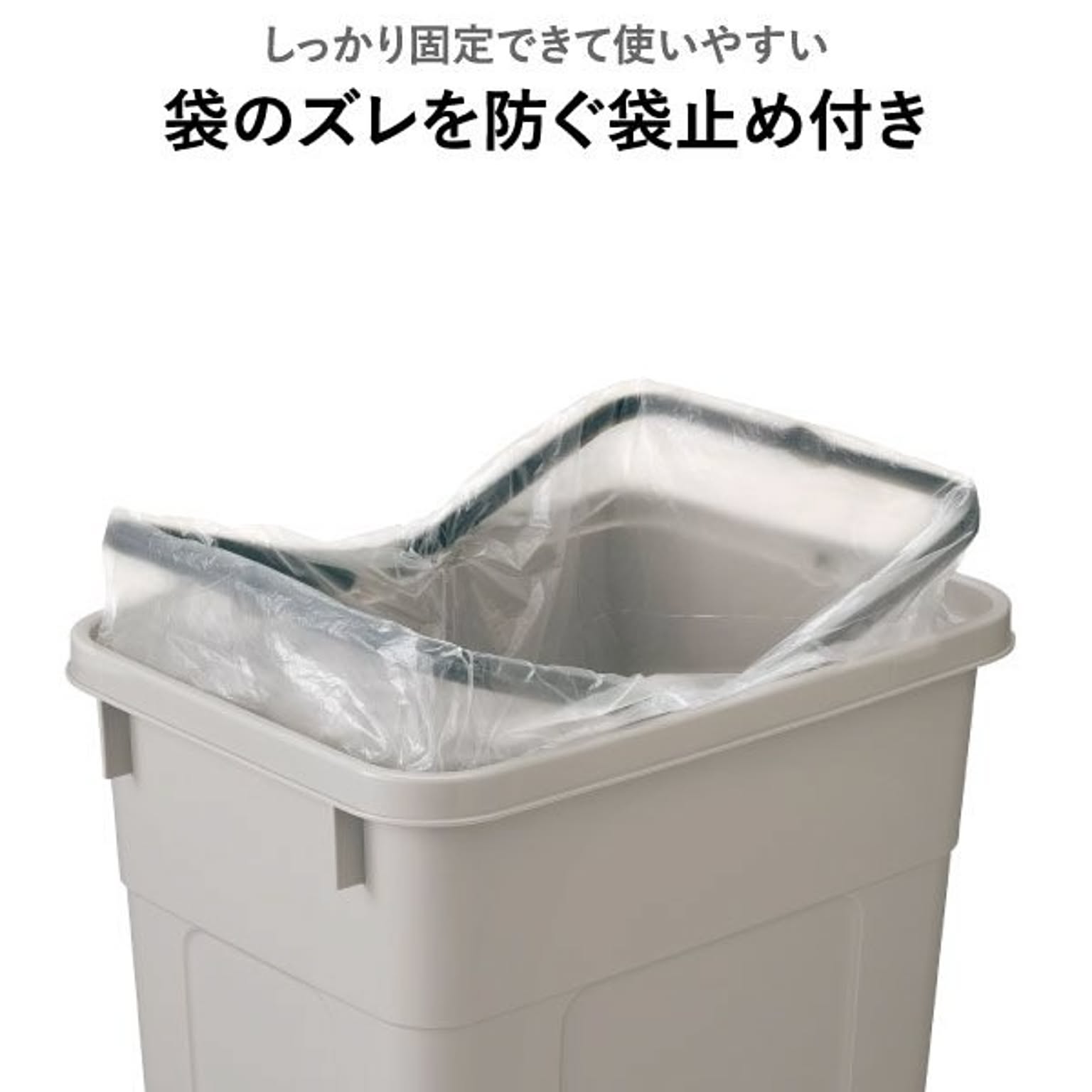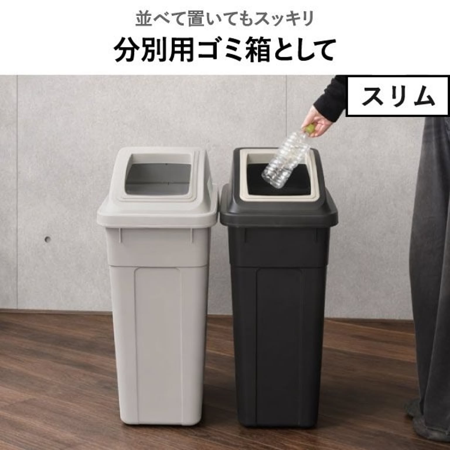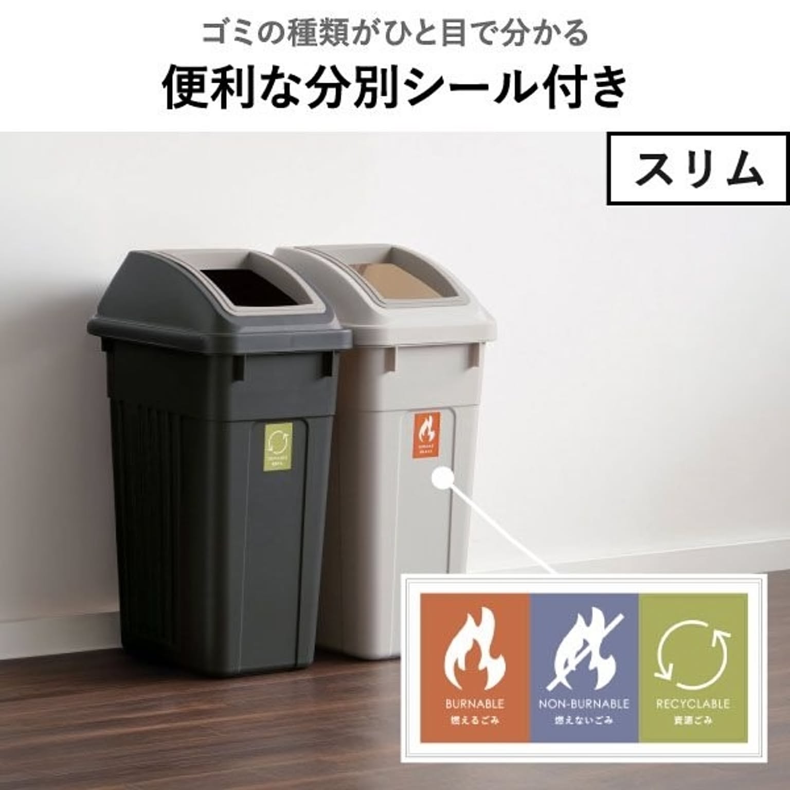 おしゃれで落ち着いたカラーが魅力の45リットルゴミ袋対応の分別ゴミ箱。シンプルで無駄のないデザインのゴミ箱は、キッチンやリビングのインテリアにも自然に馴染みます。45リットルゴミ袋対応のゴミ箱は、たっぷり捨てられて見た目もスマートな使いやすい仕様です。広い開口部のゴミ箱で、大きなゴミも片手でサッと捨てられます。キッチンでの調理中でもストレスなく使えます。設置場所に合わせて「スリム」・「ワイド」の2タイプからお選びいただけます。スリムタイプのゴミ箱はキッチンの隙間に置きやすいコンパクト設計で、調理中でも手軽にゴミを捨てられます。ワイドタイプは、ゴミをたっぷり入れても倒れにくく安定感抜群。キッチンやオフィスでも使いやすいゴミ箱です。45Lゴミ袋対応のゴミ箱は、複数並べても圧迫感のないすっきりとしたフォルムで、キッチンの分別用ゴミ箱としてもおすすめです。また、分別シール付きのゴミ箱なので、キッチンでの分別もスムーズ。袋止め付きでズレを防げるゴミ箱は、袋が外から見えにくく、すっきりとした見た目を保てます。45Lゴミ袋対応のゴミ箱は、市場回収リサイクルPP材を一部に使用し、資源を無駄なく活用しています。環境に配慮したサステナブルな素材です。
