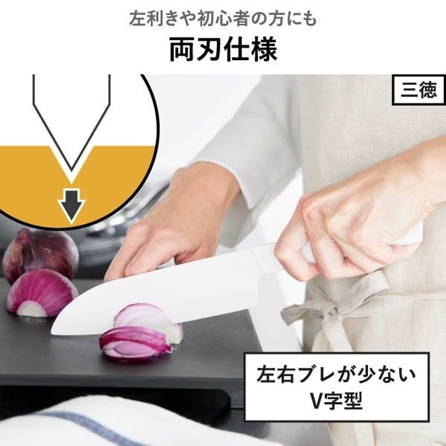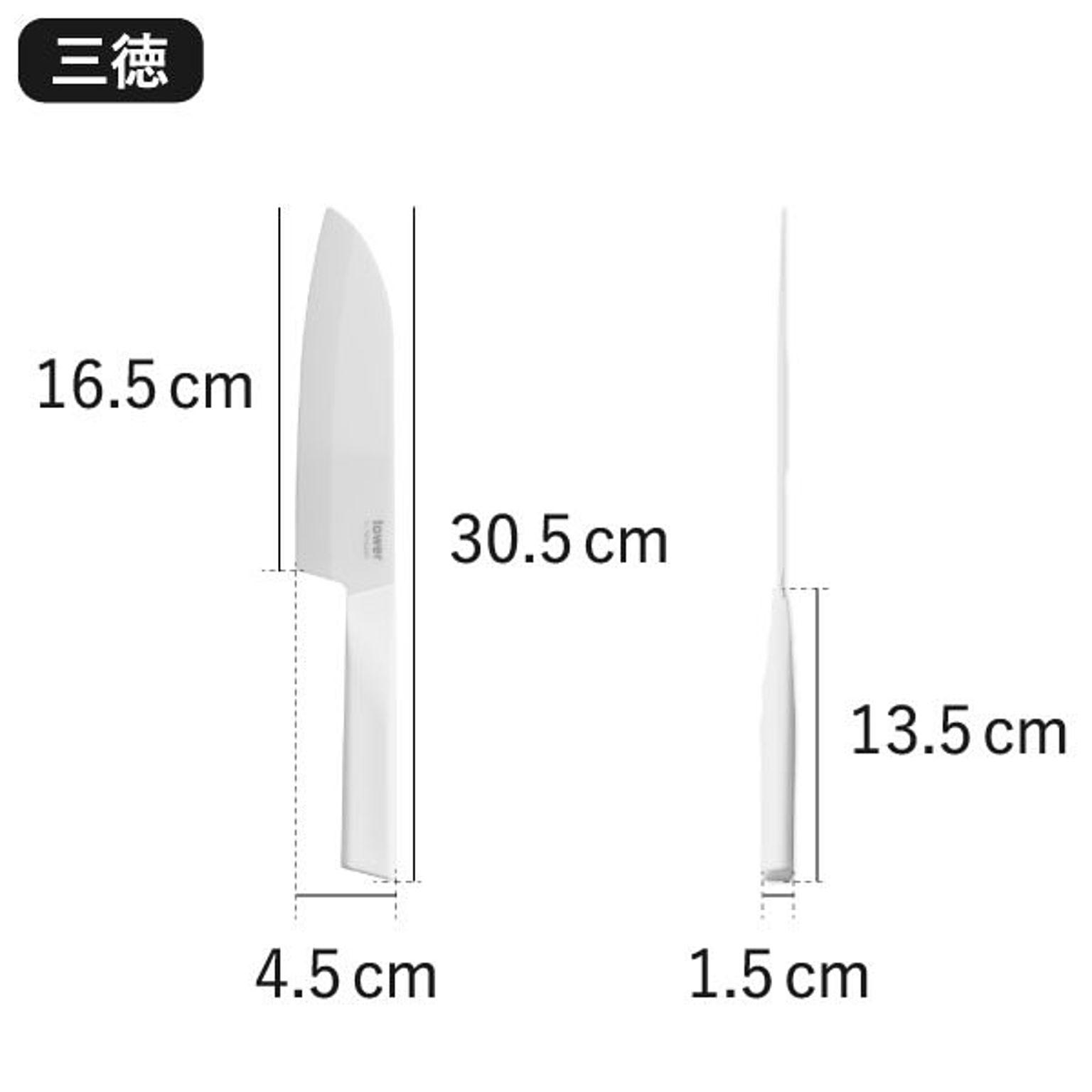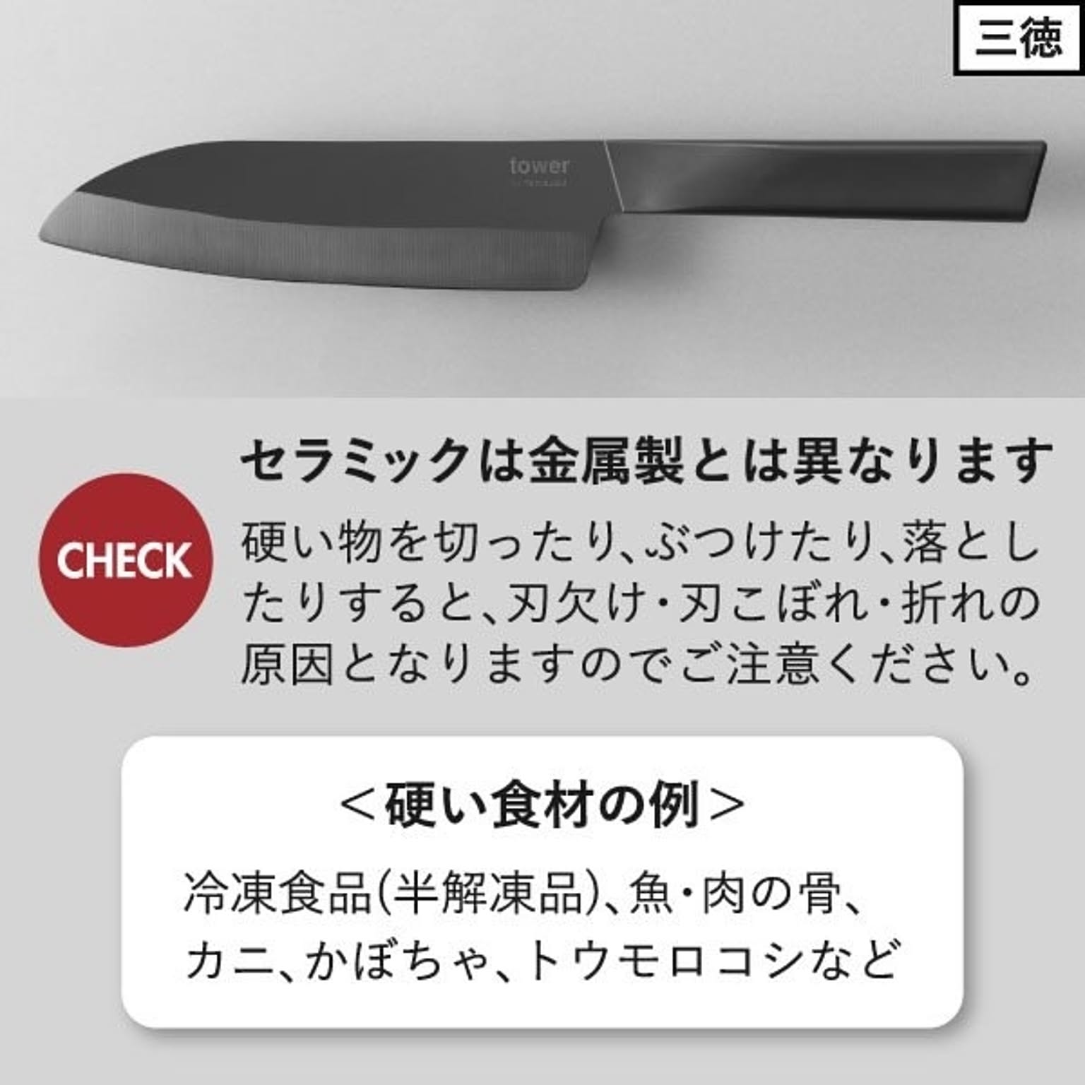 幅広い食材に使用できる、towerの便利な三徳包丁ブラックです。 セラミック製の三徳包丁ブラックなので、 「サビない」「軽い」「切れ味長続き」と、金属製にはないメリットがたくさん。 三徳包丁ブラックは、日本の家庭で最も一般的で、肉・魚・野菜に対応できる万能な包丁です。 日常的な料理の9割以上を、この1本でカバーできます。三徳包丁ブラックは、日本の職人ならではの技術と高い品質管理のもと 製造されており、1本1本手作業で丁寧に刃付けがなされています。 刃からハンドルまで、モノトーンカラーで統一されたデザインの三徳包丁ブラック。三徳包丁ブラックはセラミック製なので、変色やニオイ移りの心配がありません。 刃の形状はV字型の両刃だから、左利きの方にもおすすめです。 刃が左右対称に研がれていることで左右にブレず、料理初心者にも◎。 三徳包丁ブラックのハンドル部分は、手に馴染みやすいプラスチック製です。 三徳包丁ブラックは、食洗機対応なので日々のお手入れも楽々。 暮らしにペティナイフや三徳包丁ブラックを取り入れて、快適な料理ライフを。