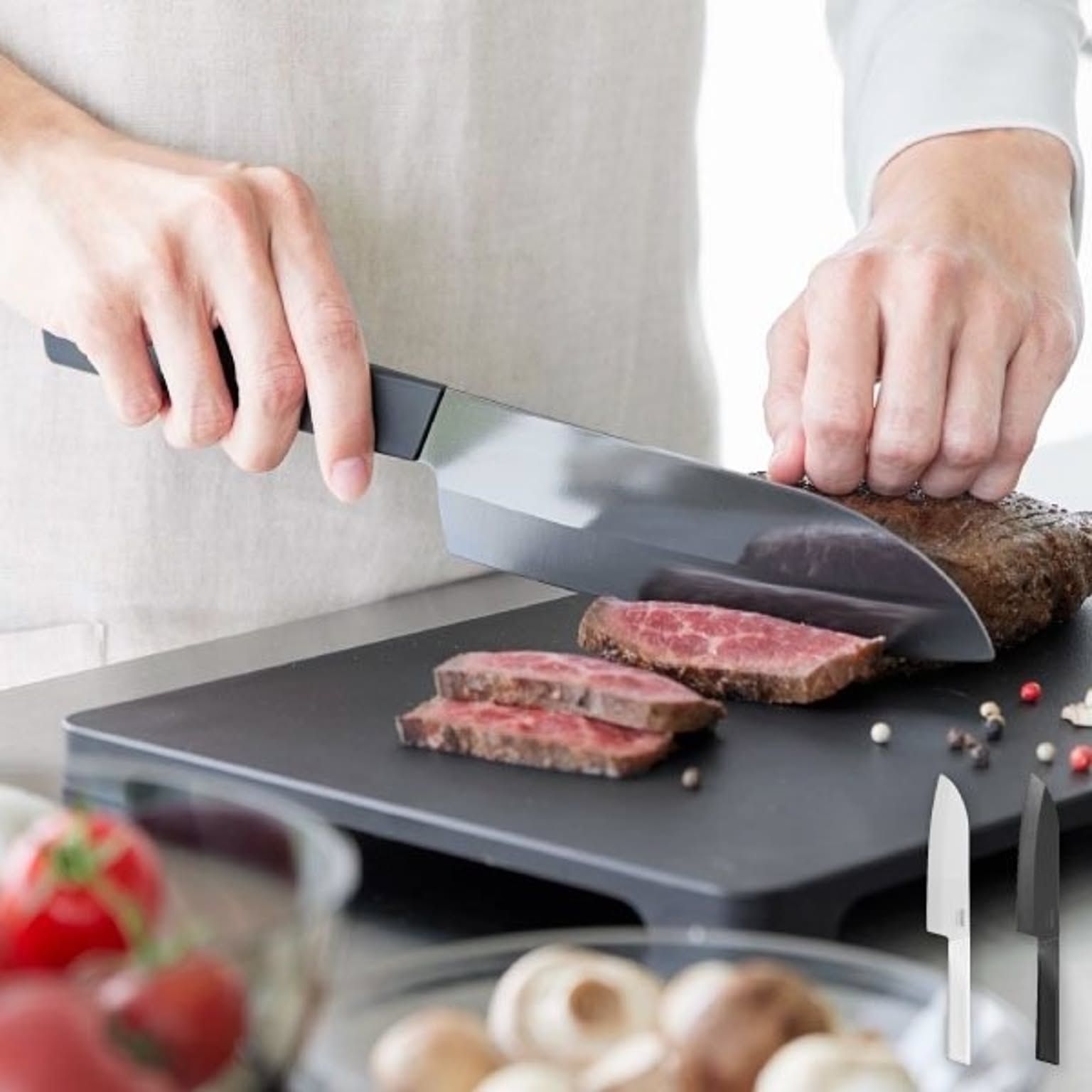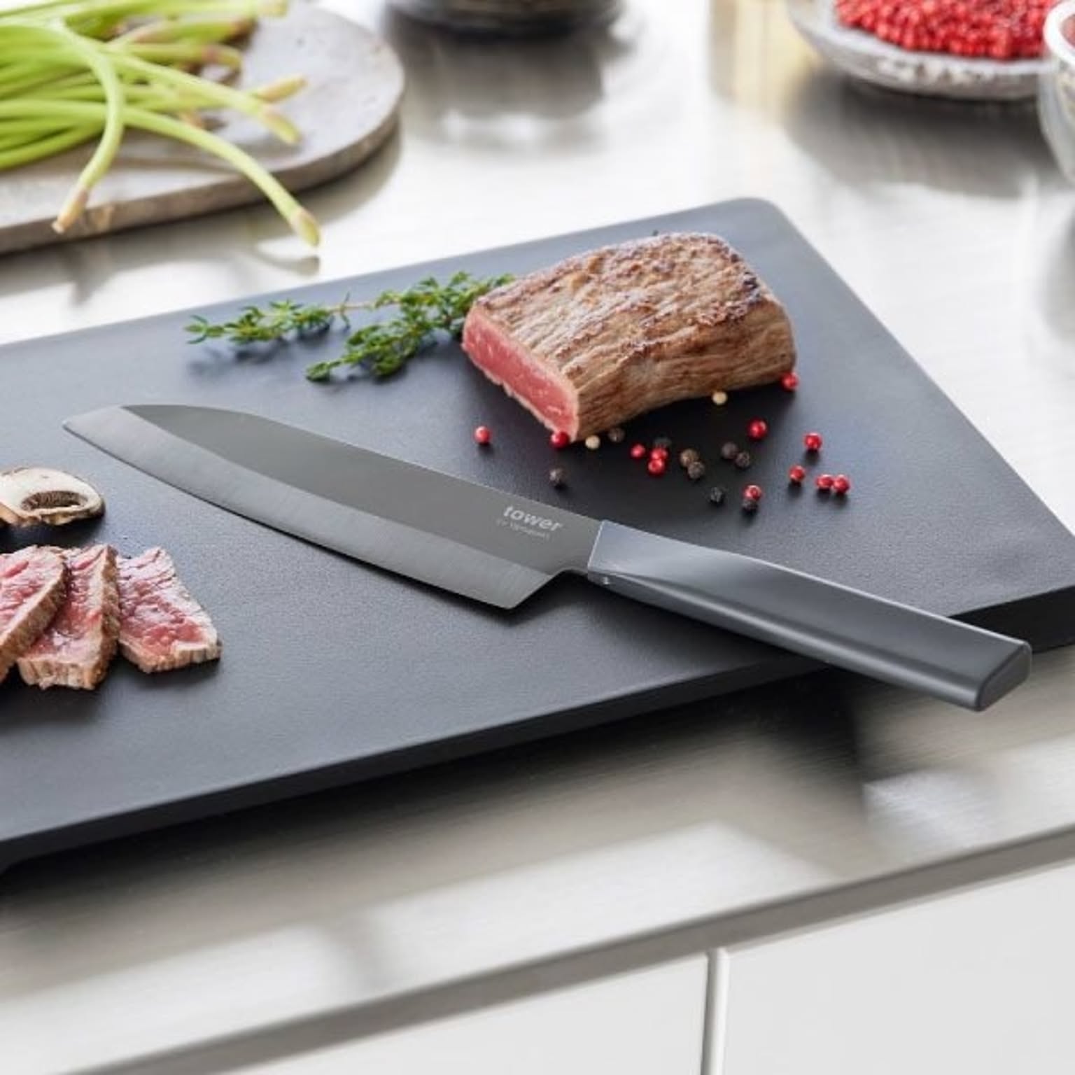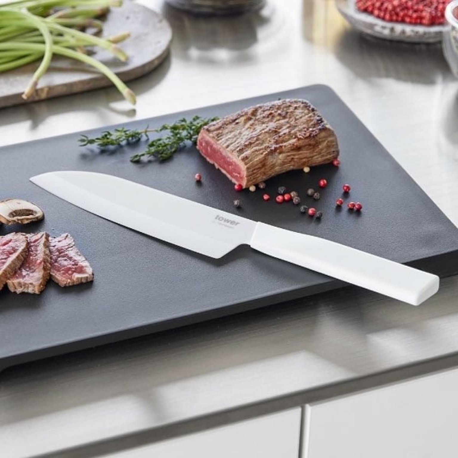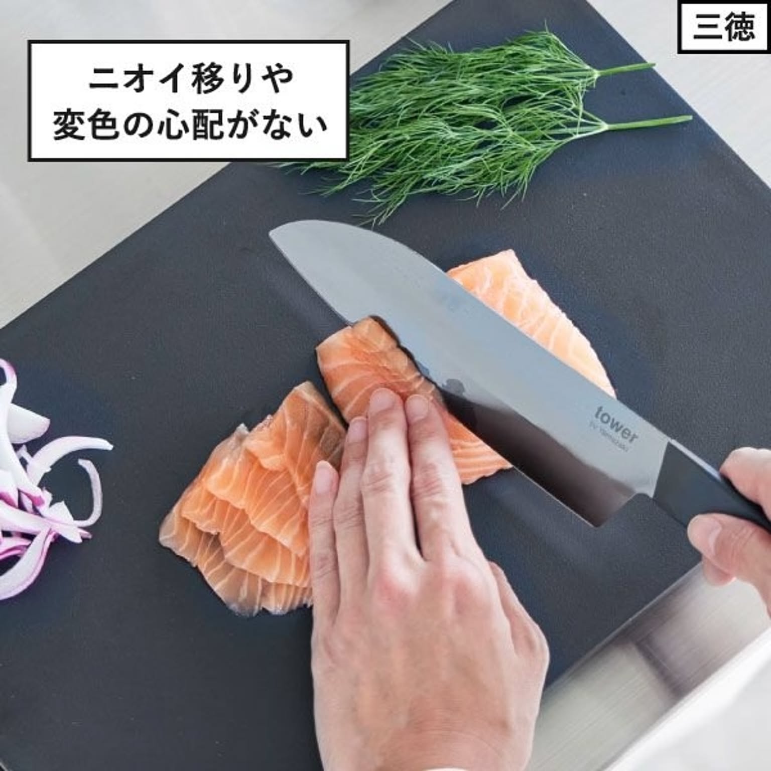幅広い食材に使用できる、towerの便利な三徳包丁ブラックです。 セラミック製の三徳包丁ブラックなので、 「サビない」「軽い」「切れ味長続き」と、金属製にはないメリットがたくさん。 三徳包丁ブラックは、日本の家庭で最も一般的で、肉・魚・野菜に対応できる万能な包丁です。 日常的な料理の9割以上を、この1本でカバーできます。三徳包丁ブラックは、日本の職人ならではの技術と高い品質管理のもと 製造されており、1本1本手作業で丁寧に刃付けがなされています。 刃からハンドルまで、モノトーンカラーで統一されたデザインの三徳包丁ブラック。三徳包丁ブラックはセラミック製なので、変色やニオイ移りの心配がありません。 刃の形状はV字型の両刃だから、左利きの方にもおすすめです。 刃が左右対称に研がれていることで左右にブレず、料理初心者にも◎。 三徳包丁ブラックのハンドル部分は、手に馴染みやすいプラスチック製です。 三徳包丁ブラックは、食洗機対応なので日々のお手入れも楽々。 暮らしにペティナイフや三徳包丁ブラックを取り入れて、快適な料理ライフを。