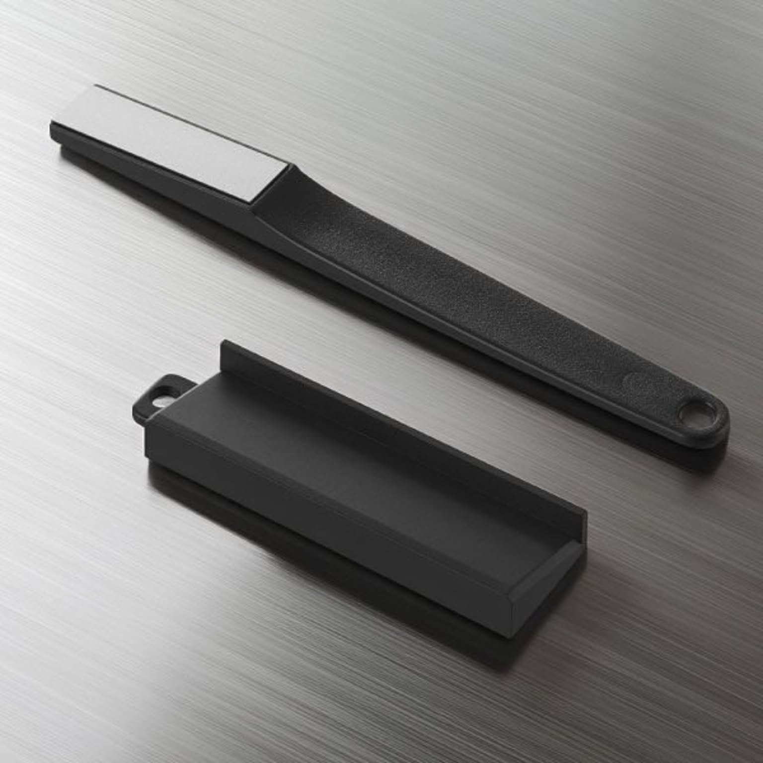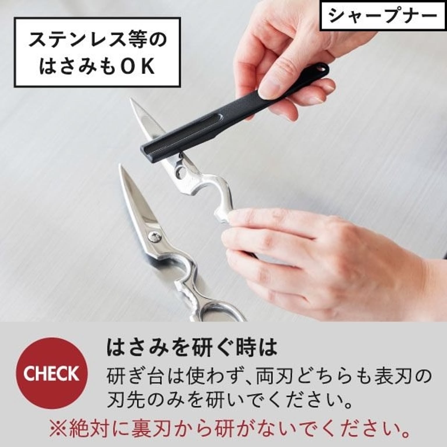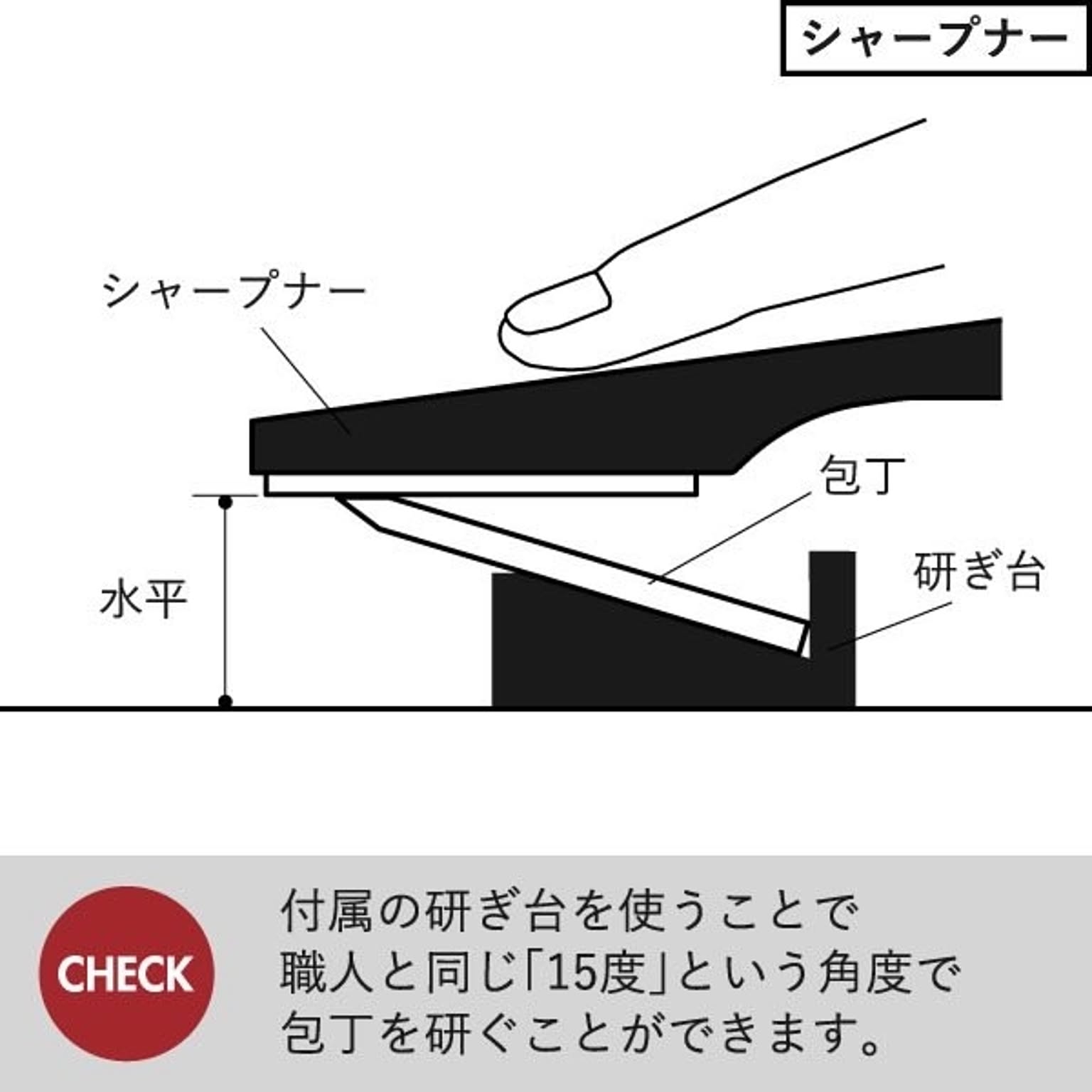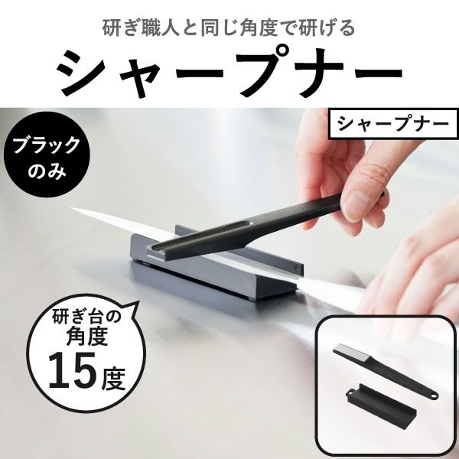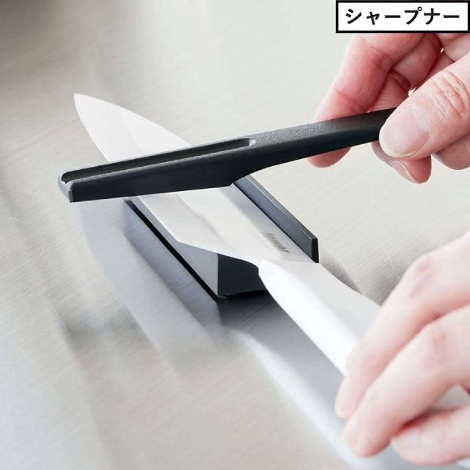セラミック製のペティナイフ・三徳包丁ブラックを研ぐのに便利な、シャープナーもご用意しました。 付属の研ぎ台に置いて軽く研ぐだけで、ペティナイフ・三徳包丁ブラックの切れ味が簡単に復活。 刃物の研ぎ職人と同じ「15度」という角度で、包丁を研ぐことができます。 研ぎ台:約15g 耐熱耐冷温度 シャープナー・研ぎ台:約100℃ ※シャープナー:食洗機不可