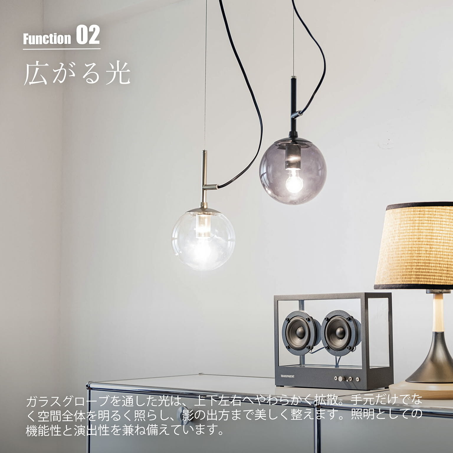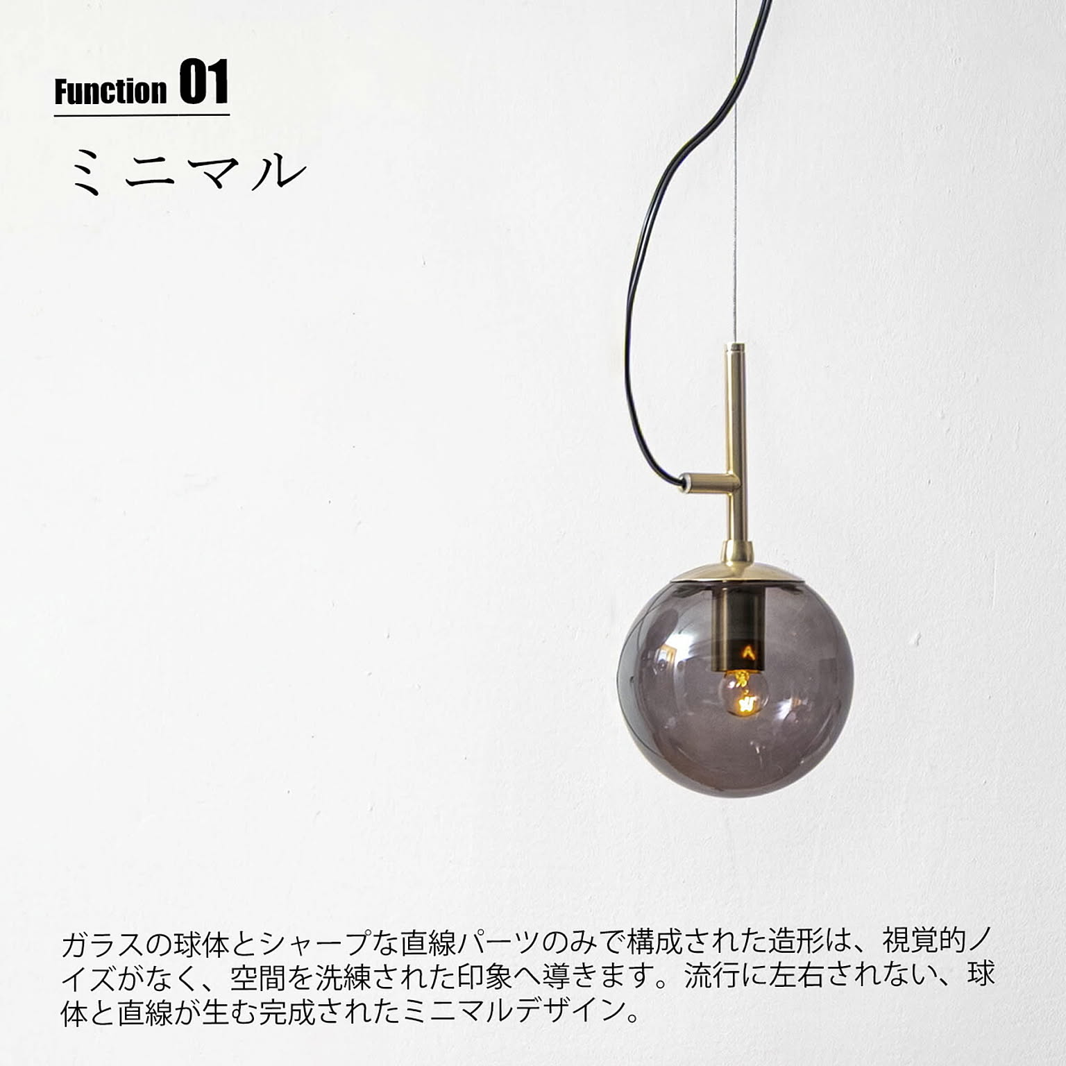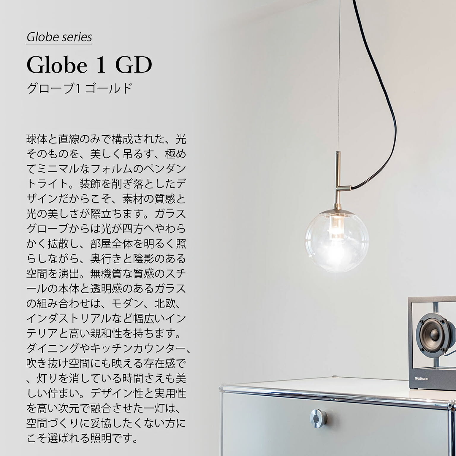 球体と直線のみで構成された、光そのものを、美しく吊るす、極めてミニマルなフォルムのペンダントライト。装飾を削ぎ落としたデザインだからこそ、素材の質感と光の美しさが際立ちます。ガラスグローブからは光が四方へやわらかく拡散し、部屋全体を明るく照らしながら、奥行きと陰影のある空間を演出。無機質な質感のスチールの本体と透明感のあるガラスの組み合わせは、モダン、北欧、インダストリアルなど幅広いインテリアと高い親和性を持ちます。ダイニングやキッチンカウンター、吹き抜け空間にも映える存在感で、灯りを消している時間さえも美しい佇まい。デザイン性と実用性を高い次元で融合させた一灯は、空間づくりに妥協したくない方にこそ選ばれる照明です。