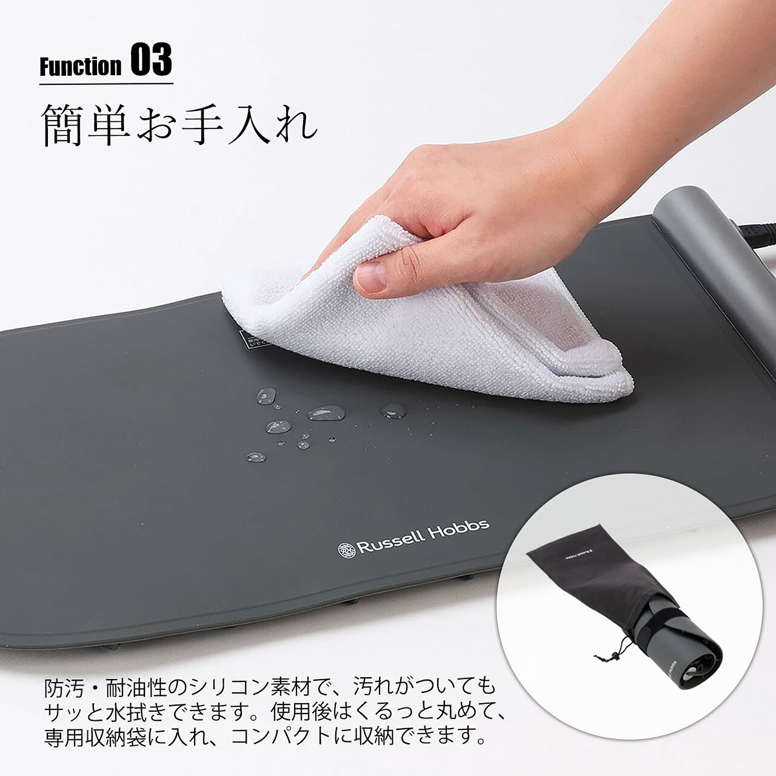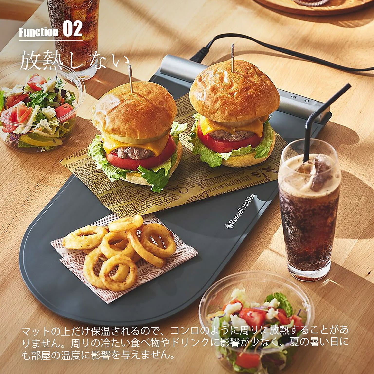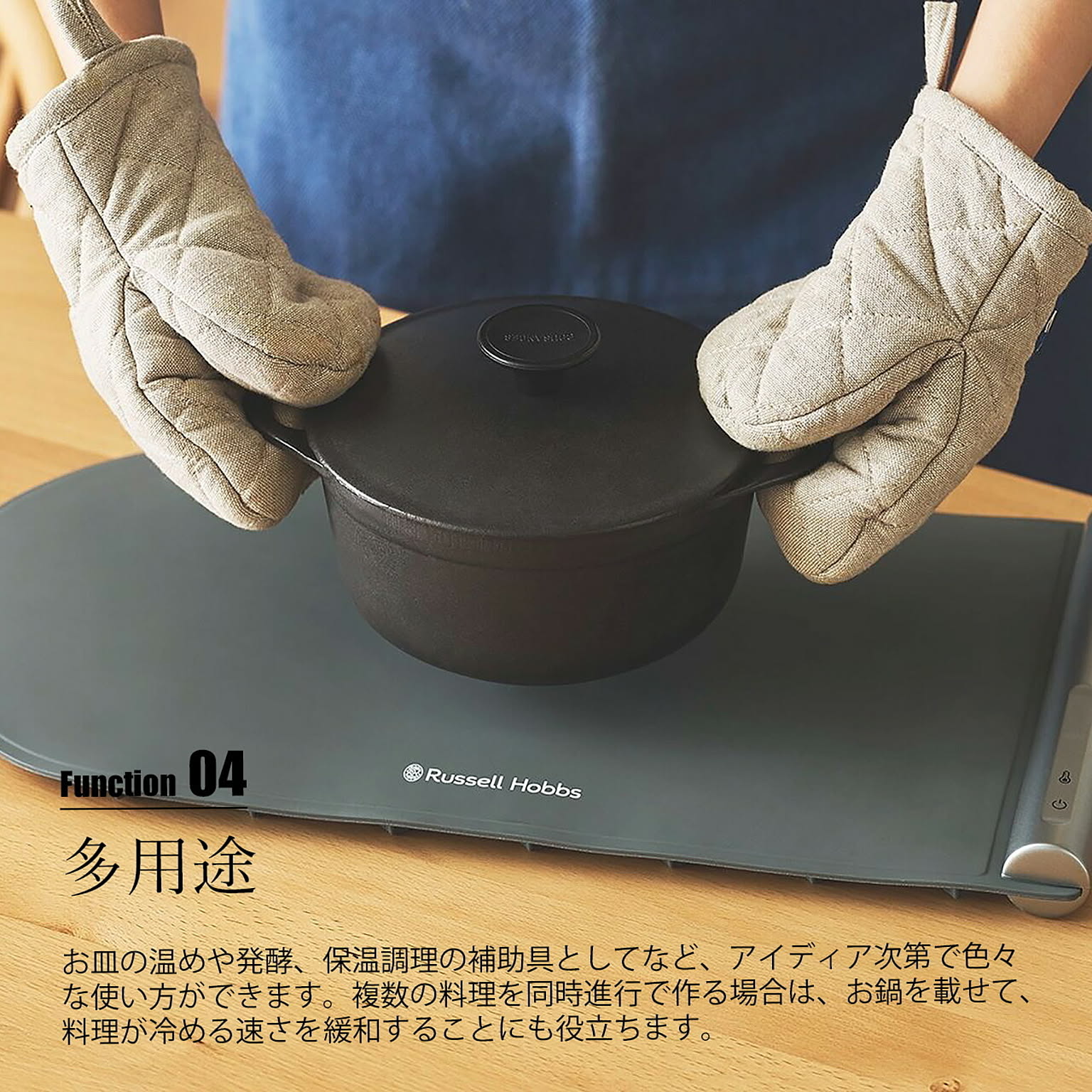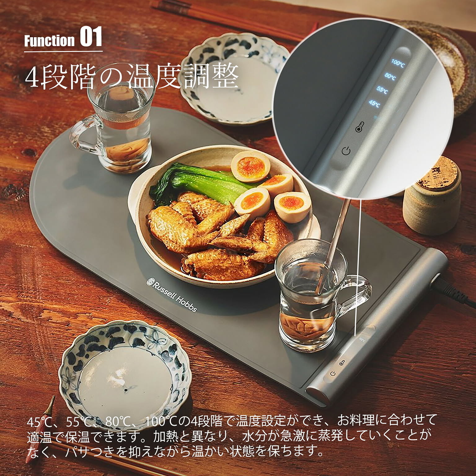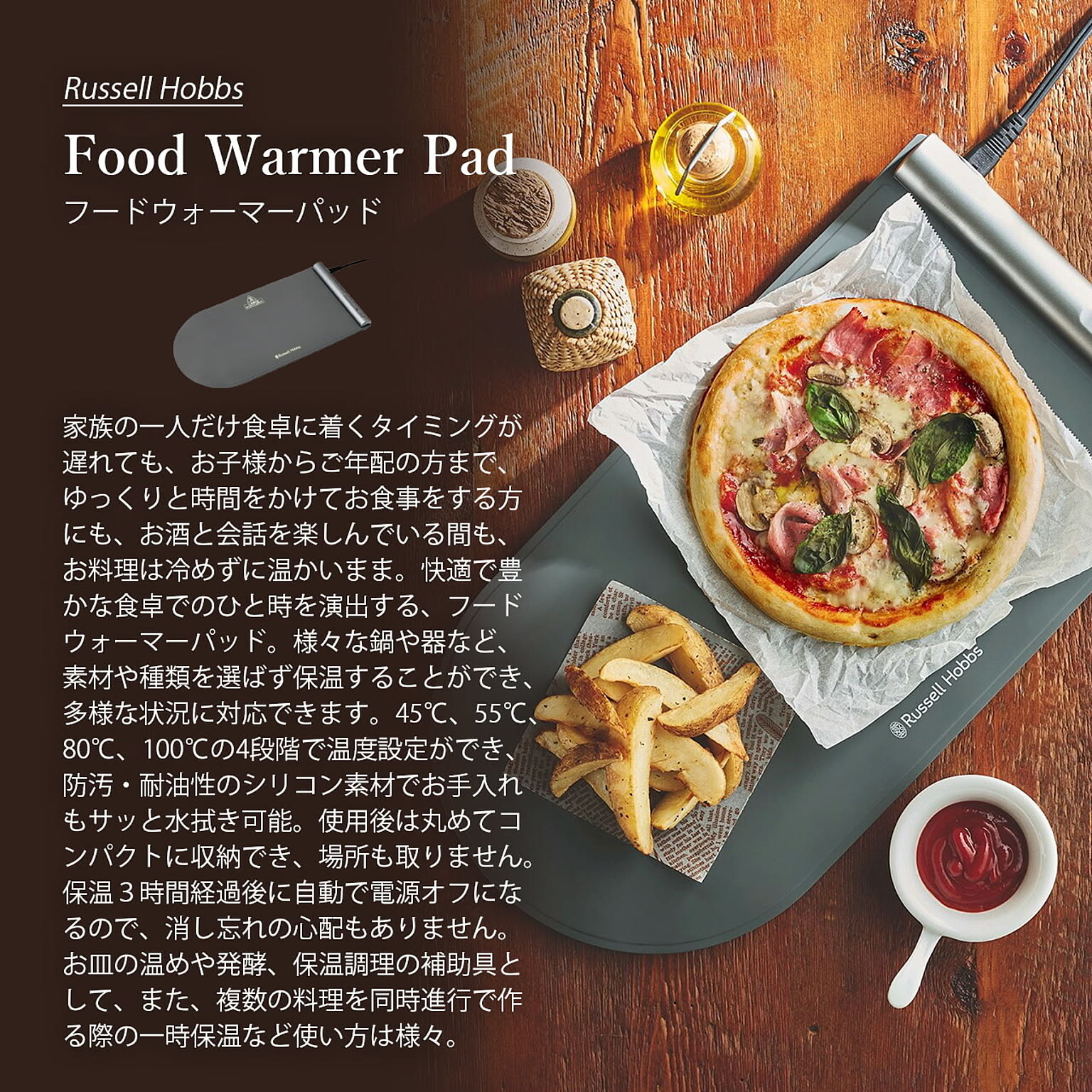 家族の一人だけ食卓に着くタイミングが遅れても、お子様からご年配の方まで、ゆっくりと時間をかけてお食事をする方にも、お酒と会話を楽しんでいる間も、お料理は冷めずに温かいまま。快適で豊かな食卓でのひと時を演出する、フードウォーマーパッド。様々な鍋や器など、素材や種類を選ばず保温することができ、多様な状況に対応できます。45℃、55℃、80℃、100℃の4段階で温度設定ができ、防汚・耐油性のシリコン素材でお手入れもサッと水拭き可能。使用後は丸めてコンパクトに収納でき、場所も取りません。保温3時間経過後に自動で電源オフになるので、消し忘れの心配もありません。お皿の温めや発酵、保温調理の補助具として、また、複数の料理を同時進行で作る際の一時保温など使い方は様々。