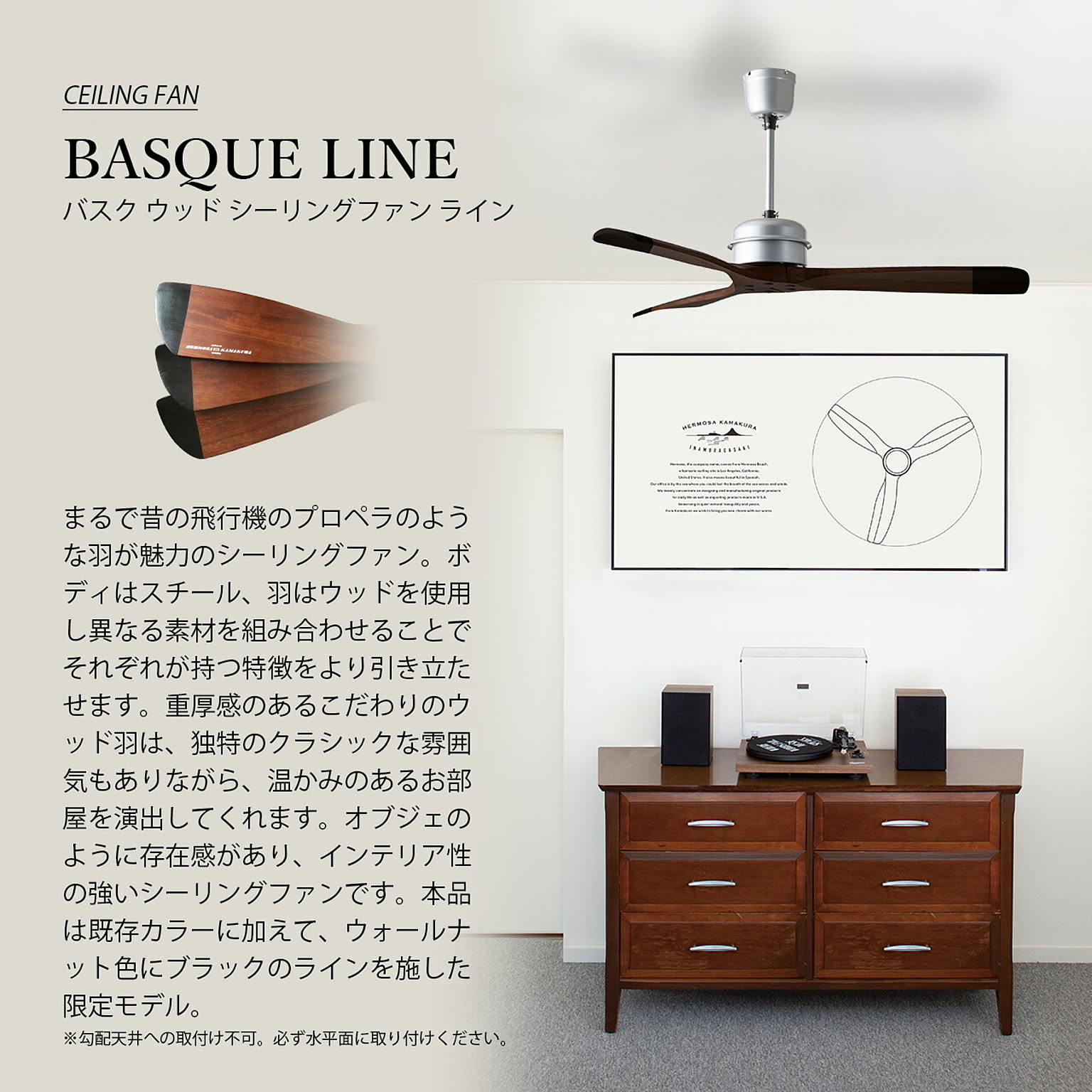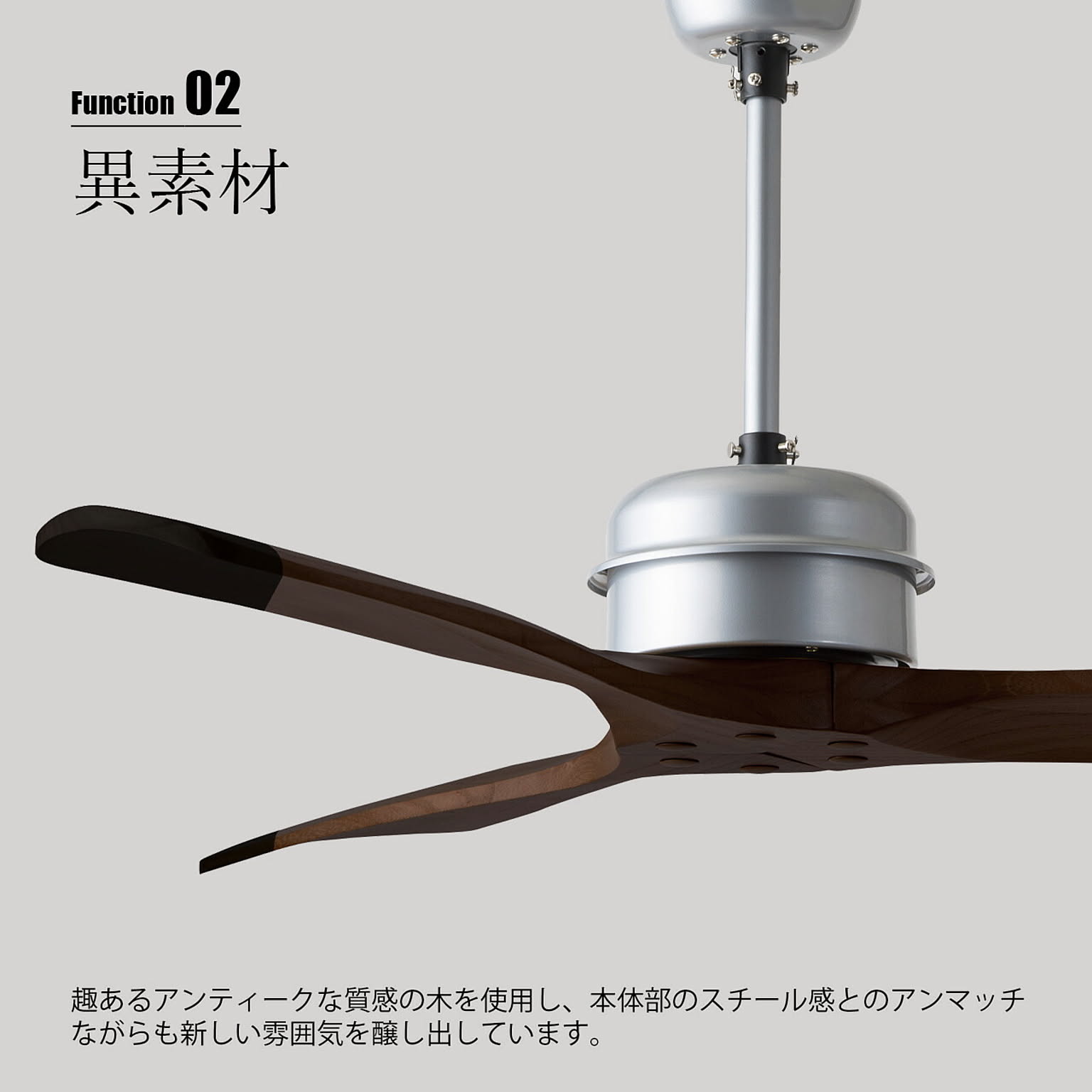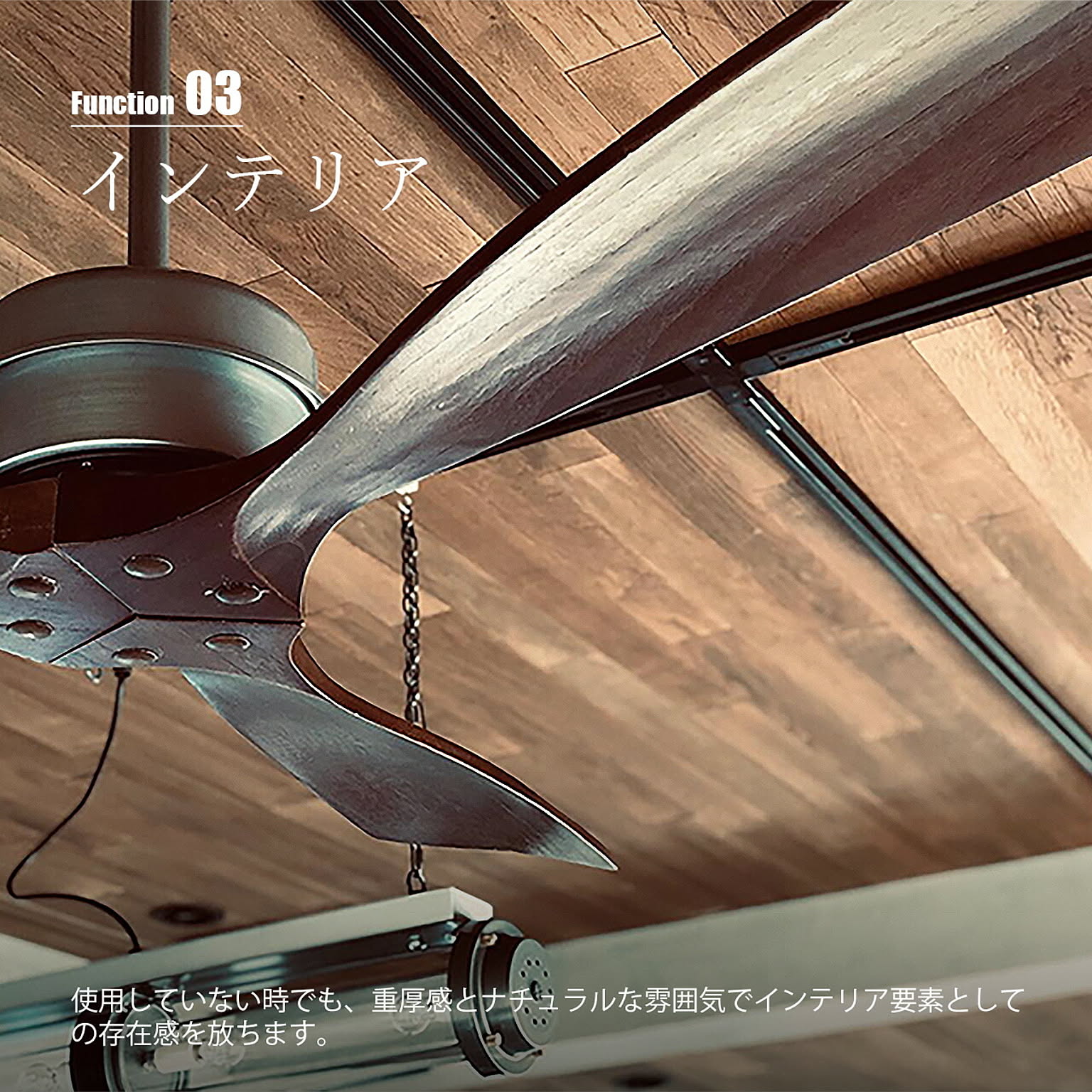 まるで昔の飛行機のプロペラのような羽が魅力のシーリングファン。ボディはスチール、羽はウッドを使用し異なる素材を組み合わせることでそれぞれが持つ特徴をより引き立たせます。重厚感のあるこだわりのウッド羽は、独特のクラシックな雰囲気もありながら、温かみのあるお部屋を演出してくれます。オブジェのように存在感があり、インテリア性の強いシーリングファンです。ナチュラルは、存在感がありつつ、お部屋を明るく柔らかい印象にします。ウォールナットは、シックで高級感のあるデザインです。ブラックは、クールな印象でインテリアを引き立たせます。※勾配天井への取付けは不可