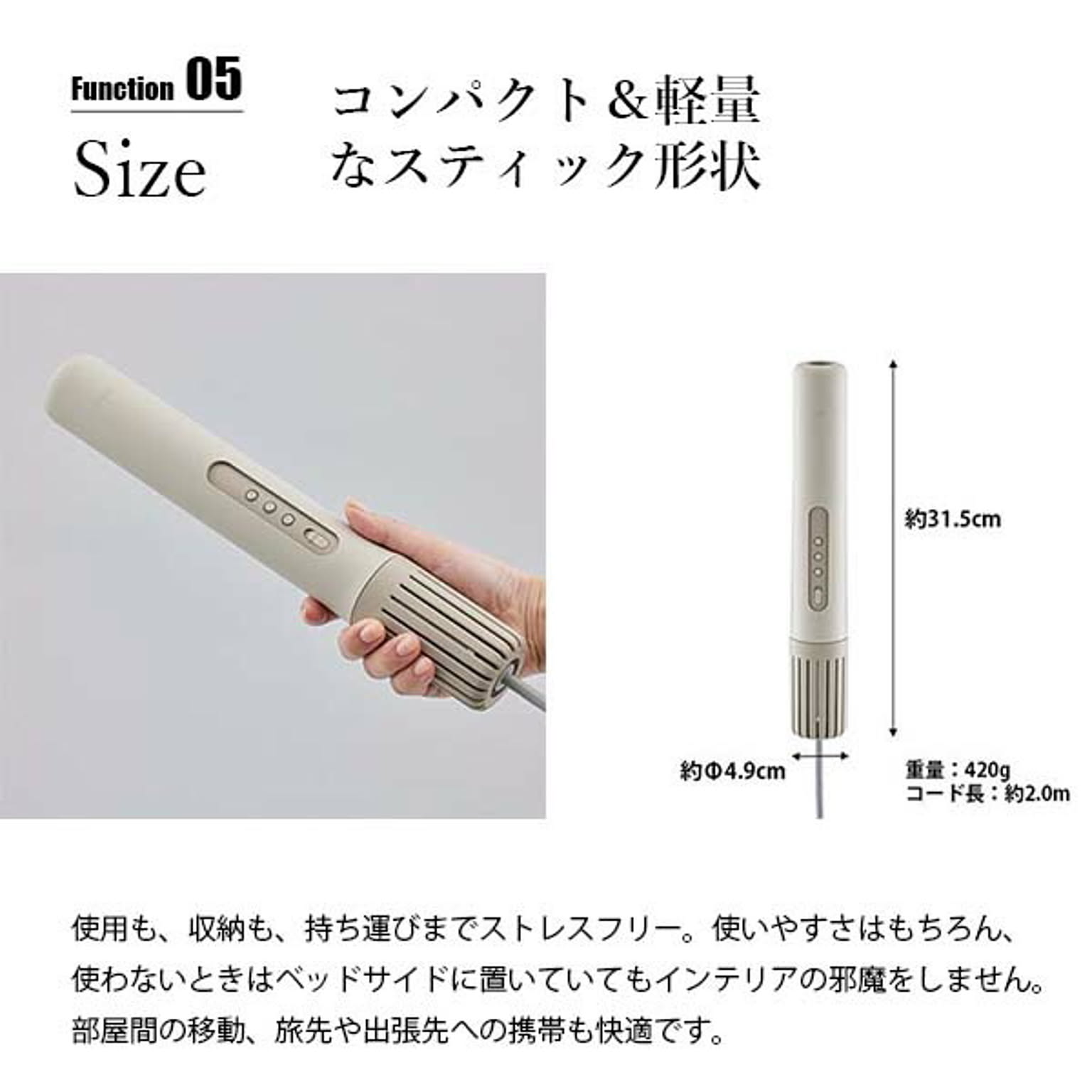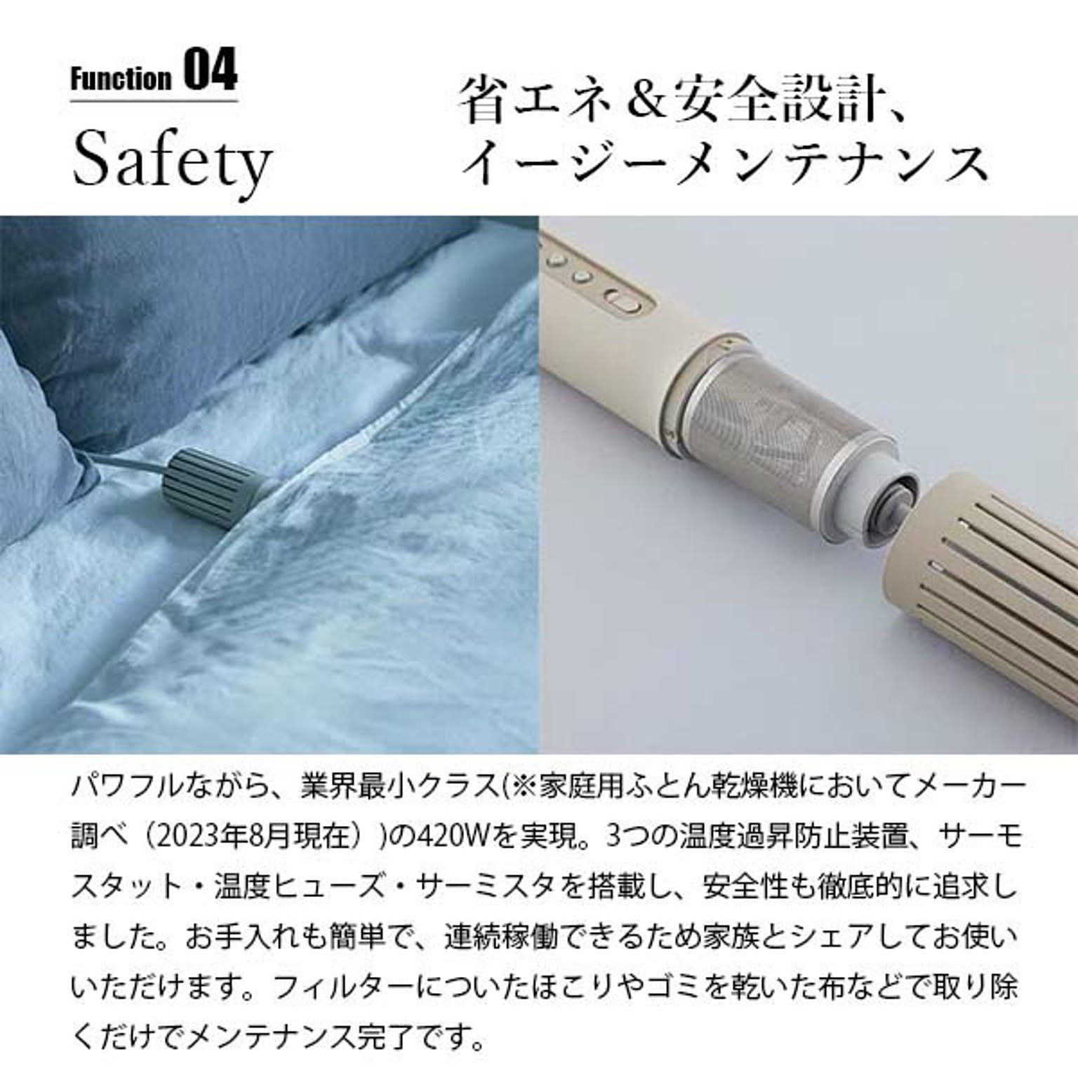 コンパクト&軽量なので使用も収納も手間いらず。お出かけまえに差し込んでベッドクリーニングとして、寝る前に差し込んでナイトルーティンとして。忙しい毎日の中でも習慣化しやすく、365日あなたのライフスタイルに寄り添って快適をサポートします。マットを広げる手間もなく、強力な風圧でダブるサイズの布団も隅々まであったか&ふっくら。低オゾン発生機能を搭載しニオイ・菌・ダニ・湿気を除去。花粉の気になる春、ジメジメした梅雨、寝汗のかきやすい夏、布団が冷たくて寝つきの悪い秋冬とオールシーズン活躍します。