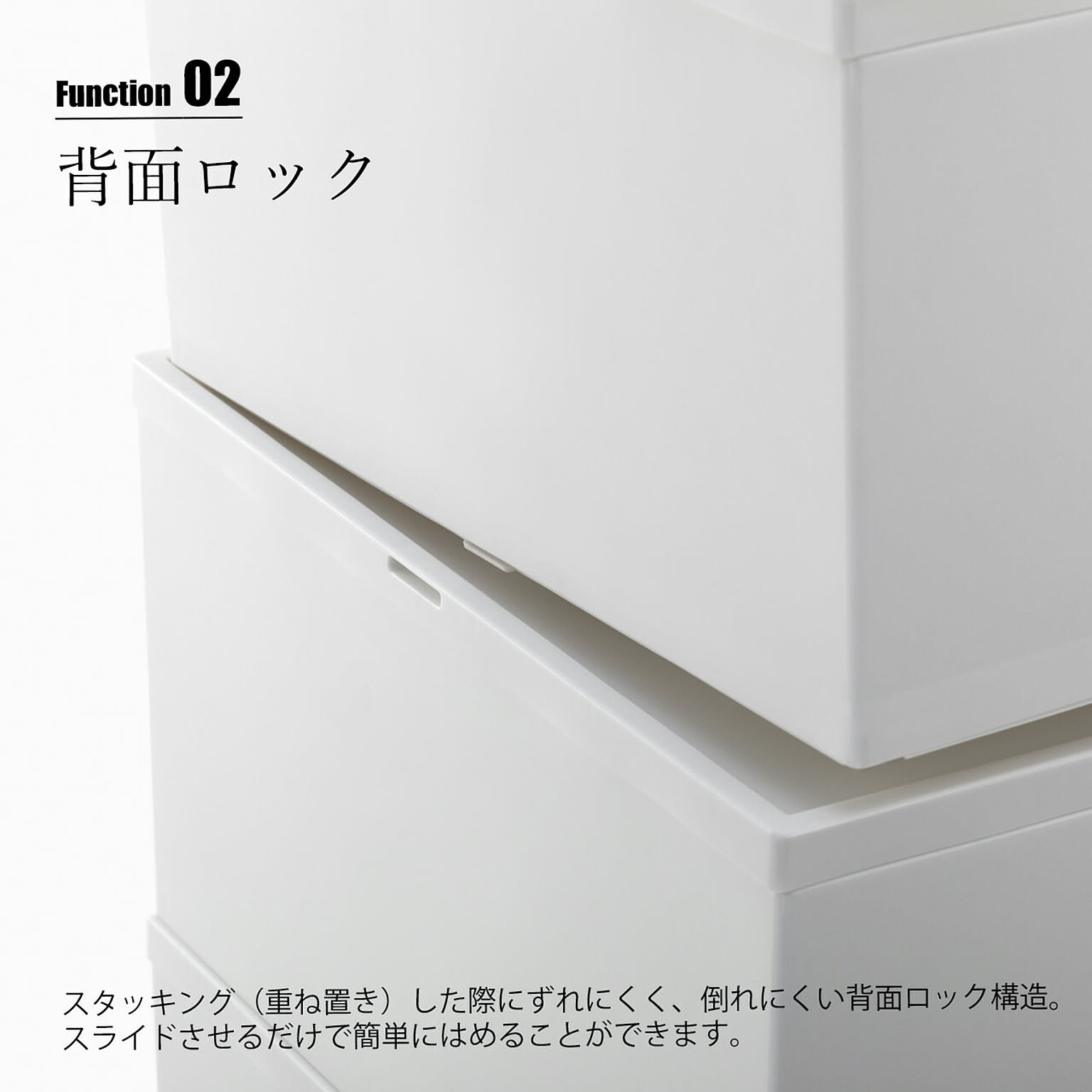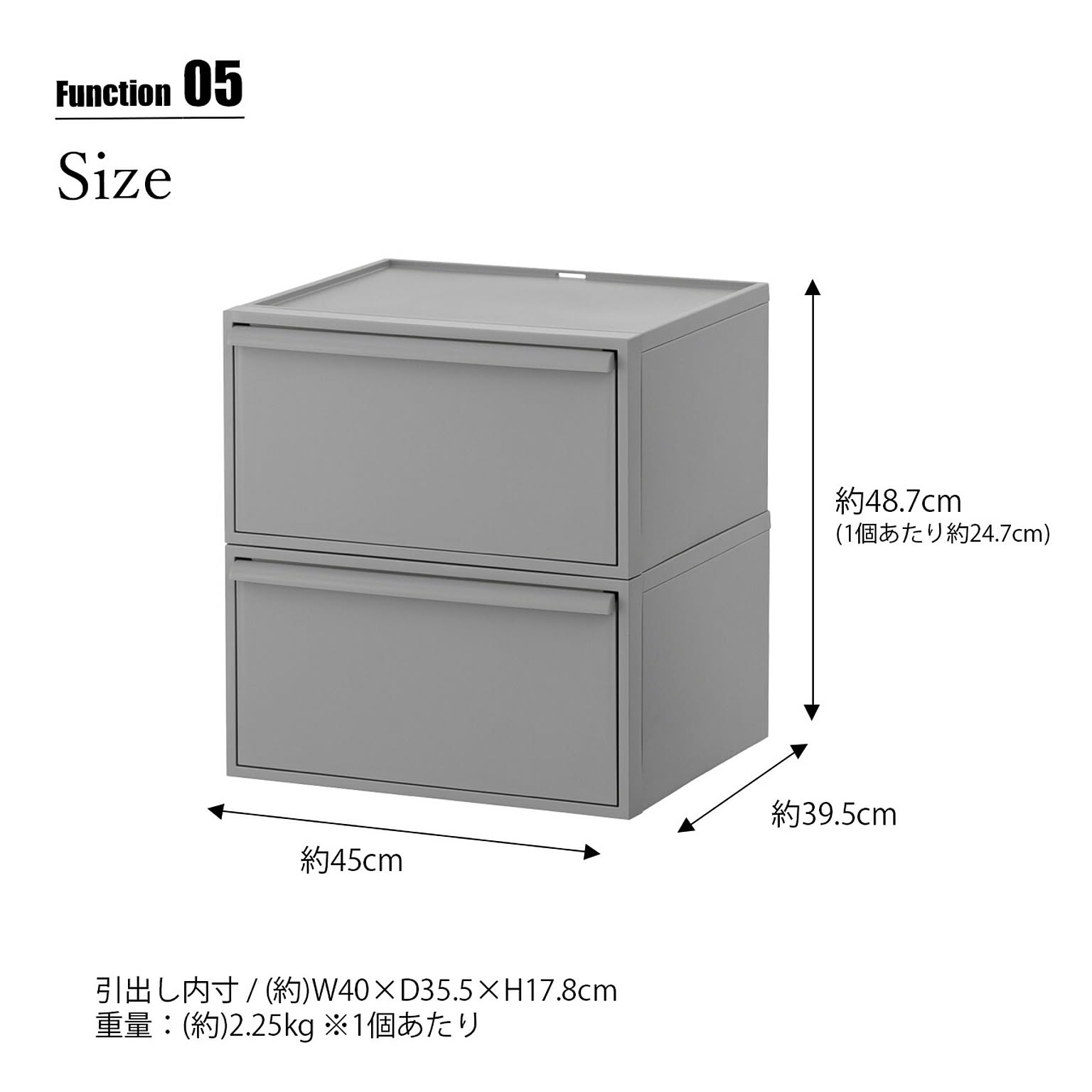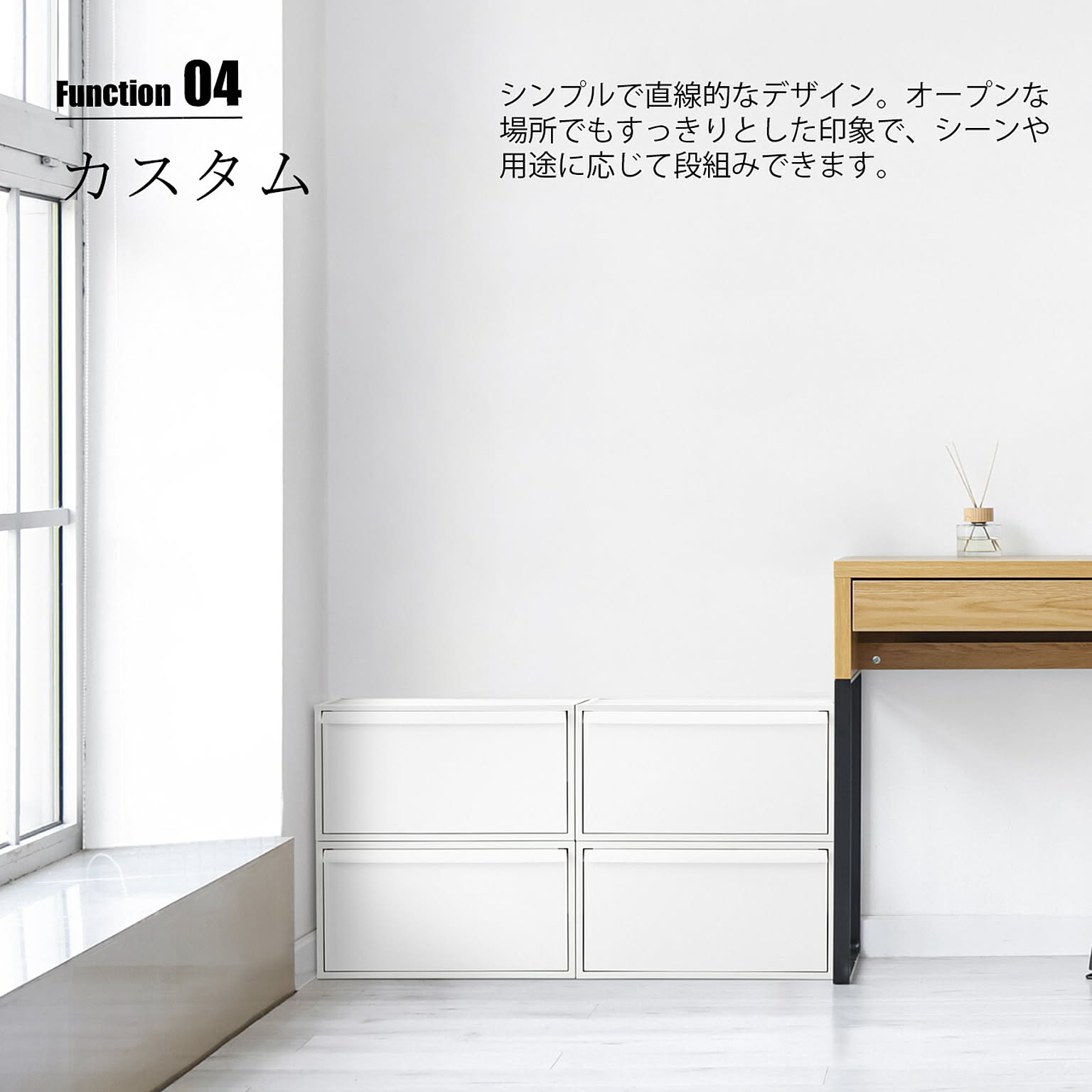【メーカー直送品】 一般的なクローゼット収納とは異なり、奥行を浅くしワイドにすることで収納力を高めた引き出し収納。そのためリビングや子ども部屋などをはじめ、多様なシーンで多段チェストとしてもご利用いただけ、キッチンパントリーの棚下などでは引き出し収納として消耗品や食材、小物収納として活躍します。最大4段まで積み重ね可能、シーンや用途に応じて段組みできます。背面ロック構造で積み重ね時もズレにくく、引き出しの抜け落ち防止機能など安全面も考慮。