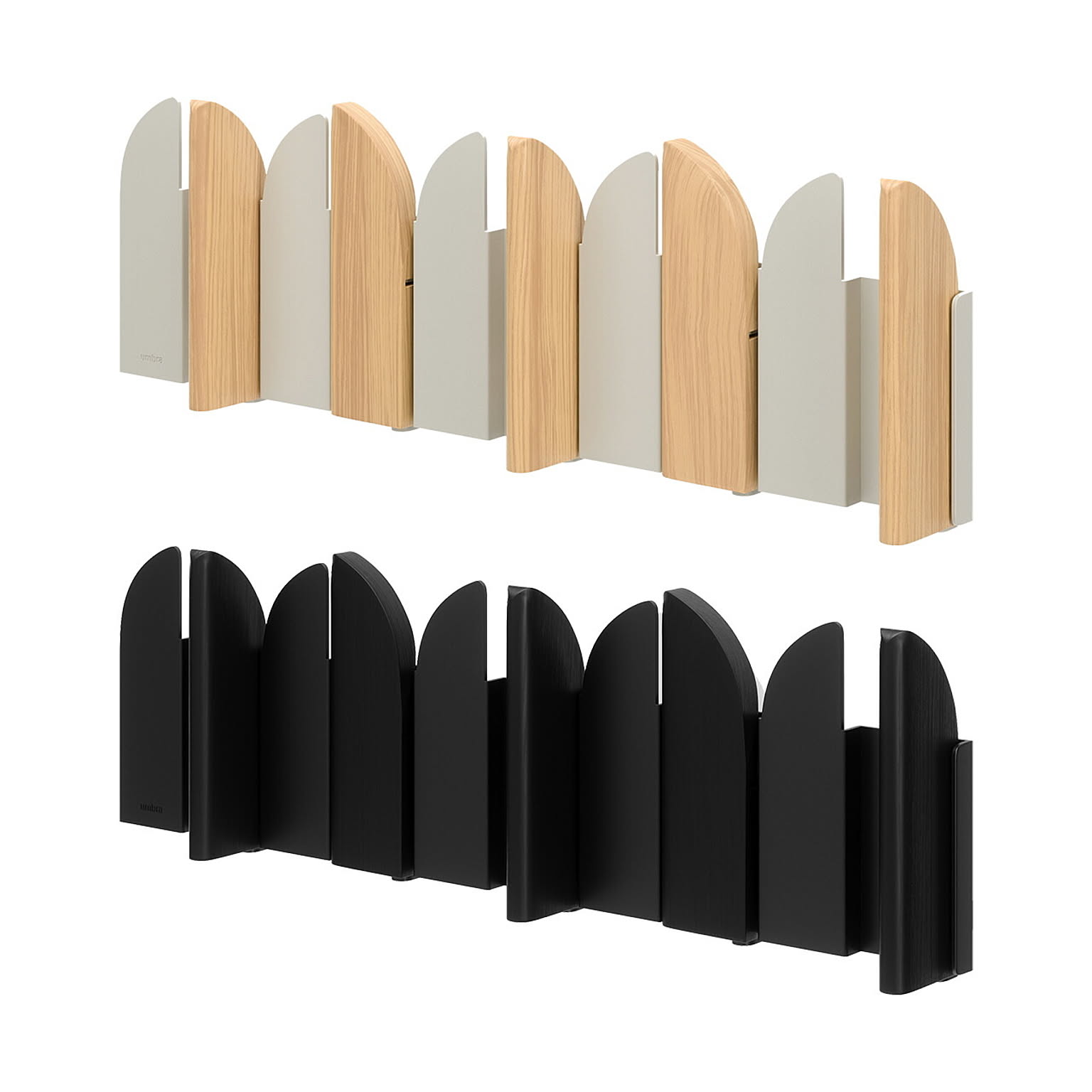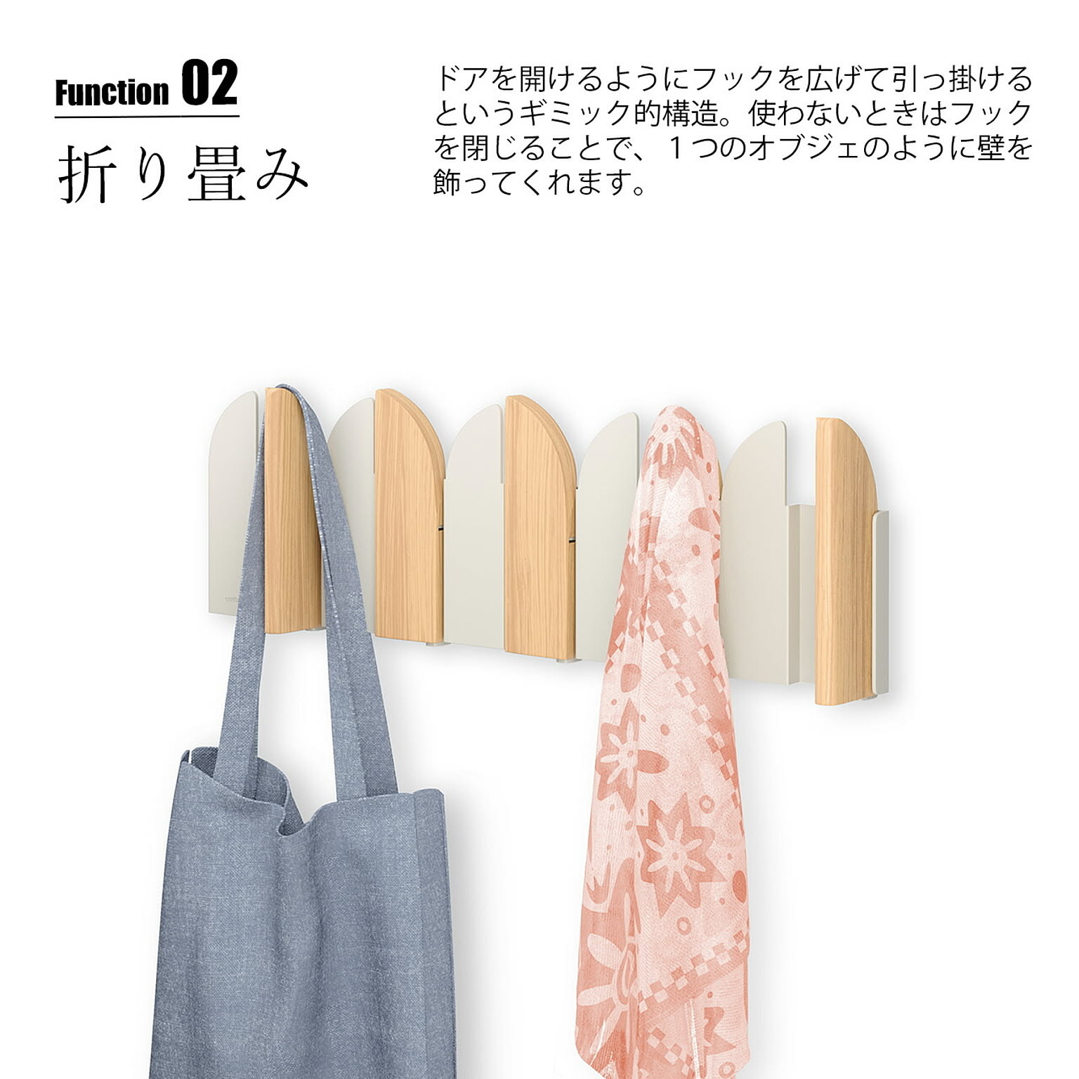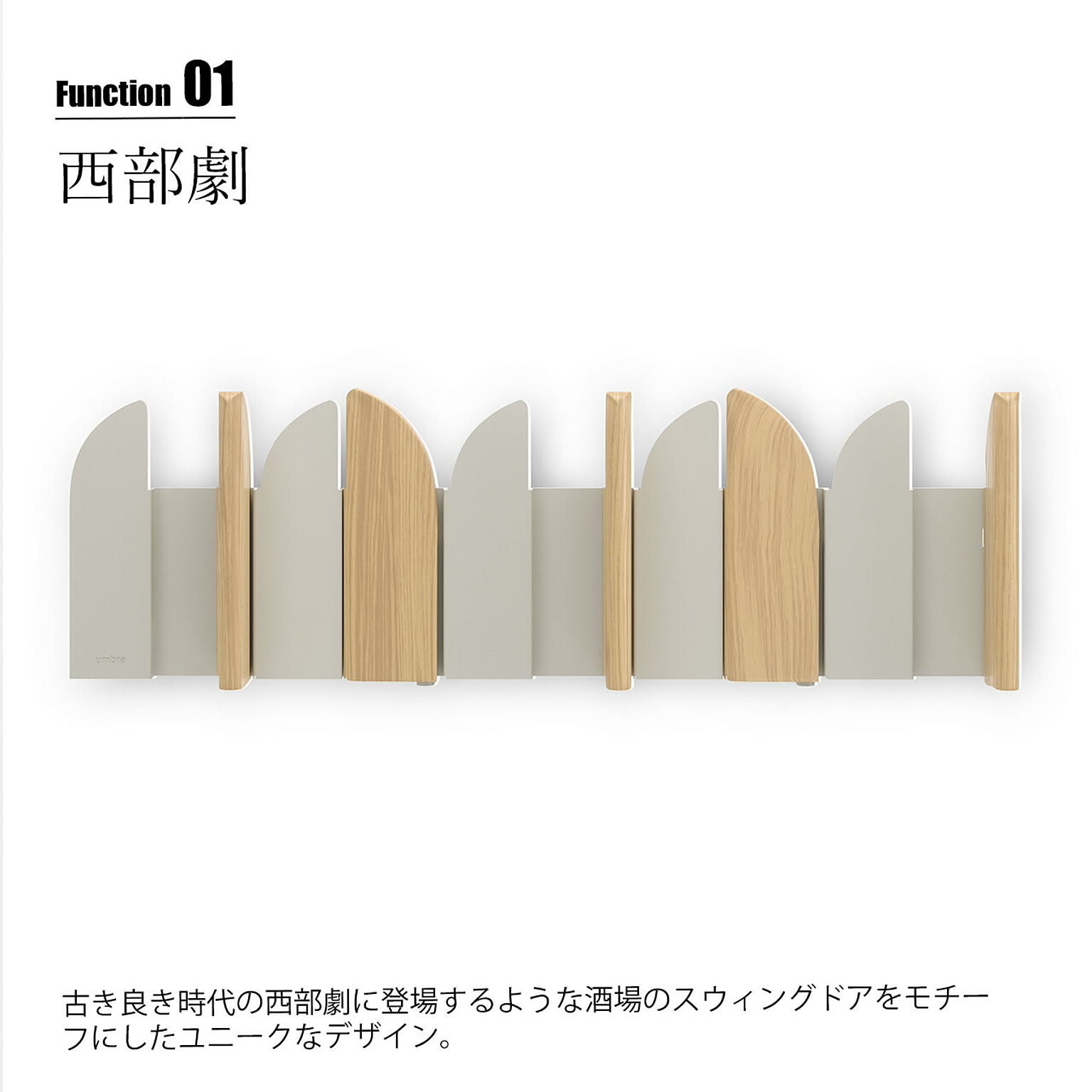 古き良き時代の酒場のスウィングドアをイメージして作られたフック。5つの折りたたみフックはそれぞれ最大2.3kgまで収納可能で、コートやバッグ、スカーフ、小物などをすっきり整理。使わないときはフックを閉じることで、1つのオブジェのように壁を飾ってくれます。玄関、寝室、オフィスなど、様々な空間で活躍するだけでなく、壁掛けアートとしても楽しめるのが魅力。付属のテンプレートで簡単に取り付けでき、ウッドと金属が交互に並ぶ本体は角度によって見え方が変わる動きのあるデザインです。