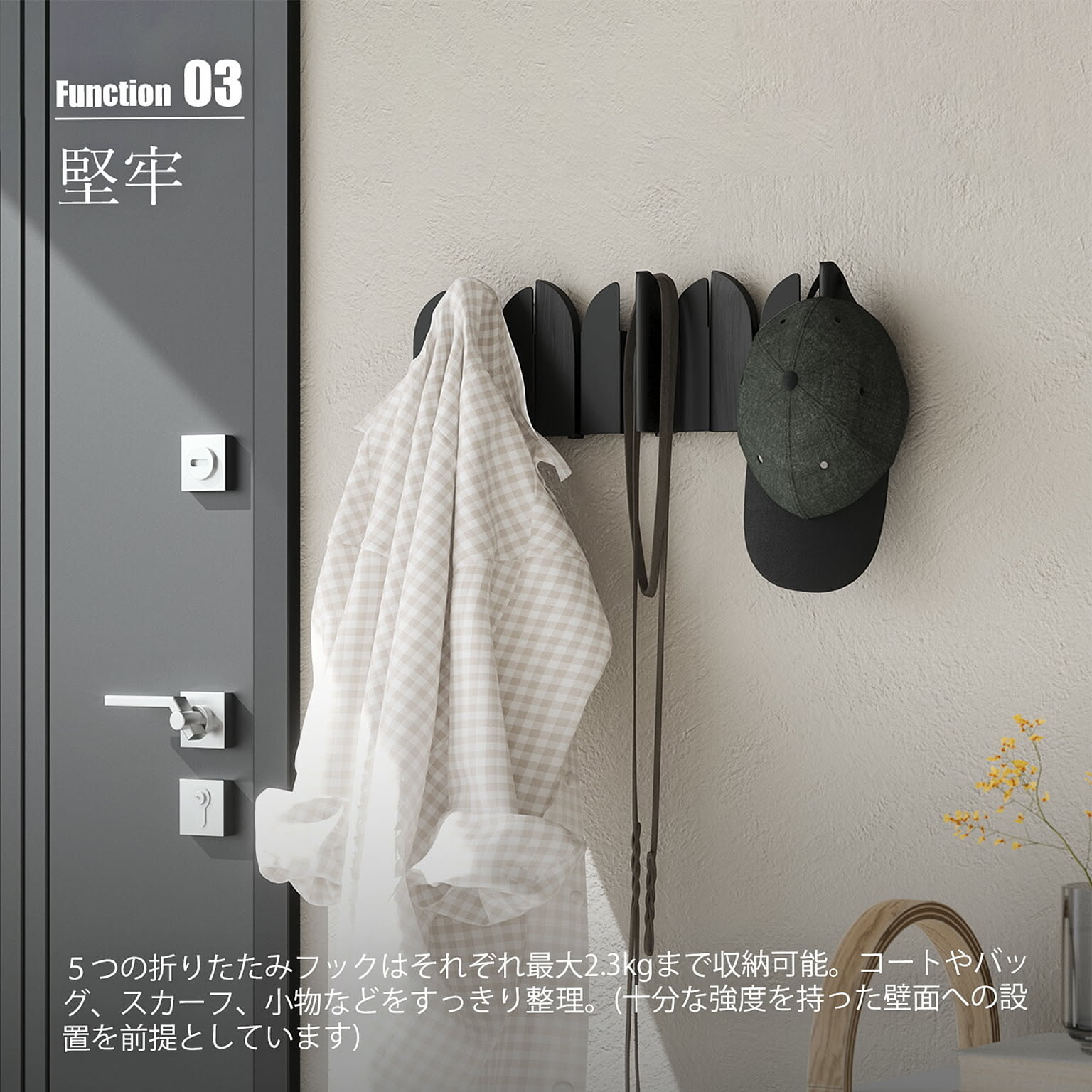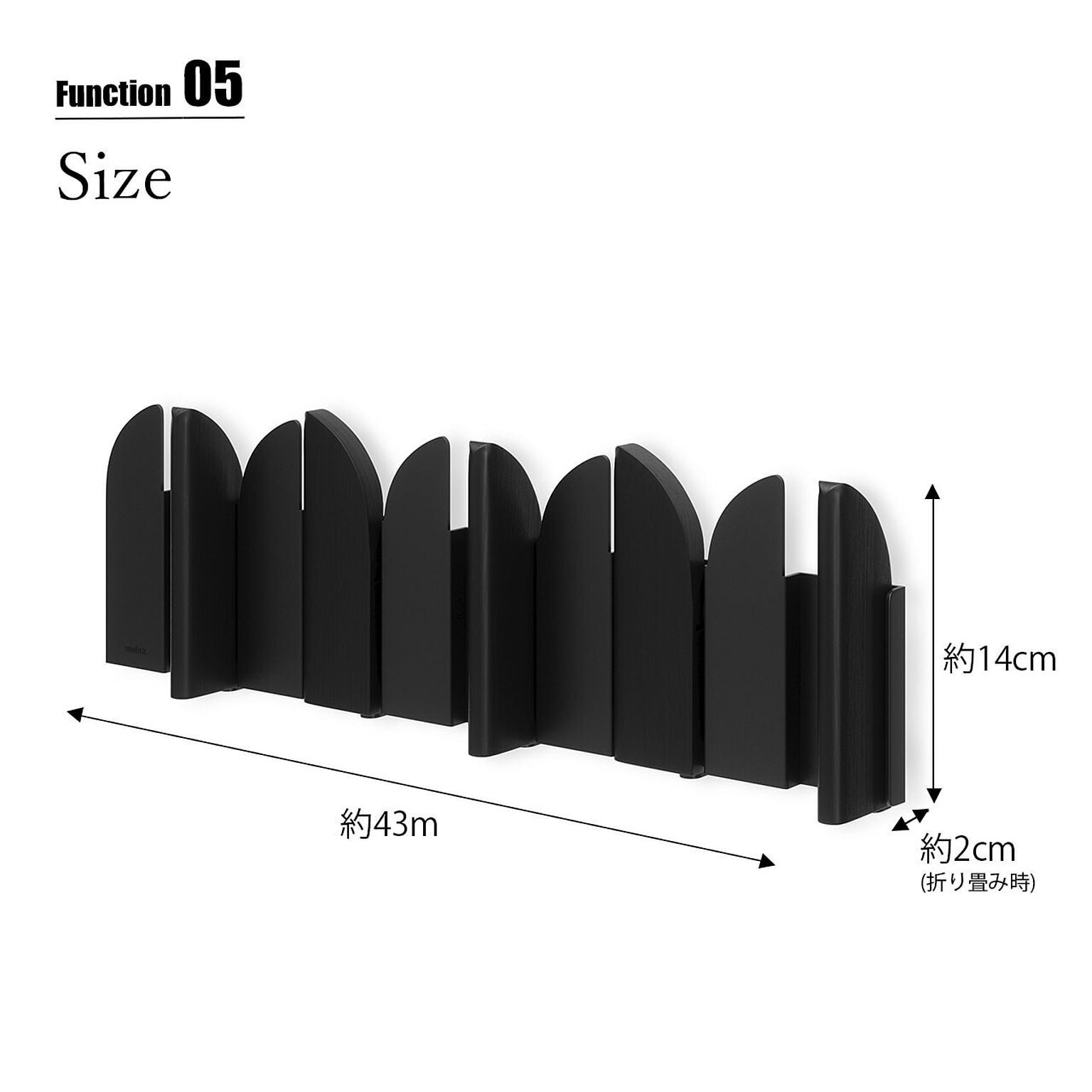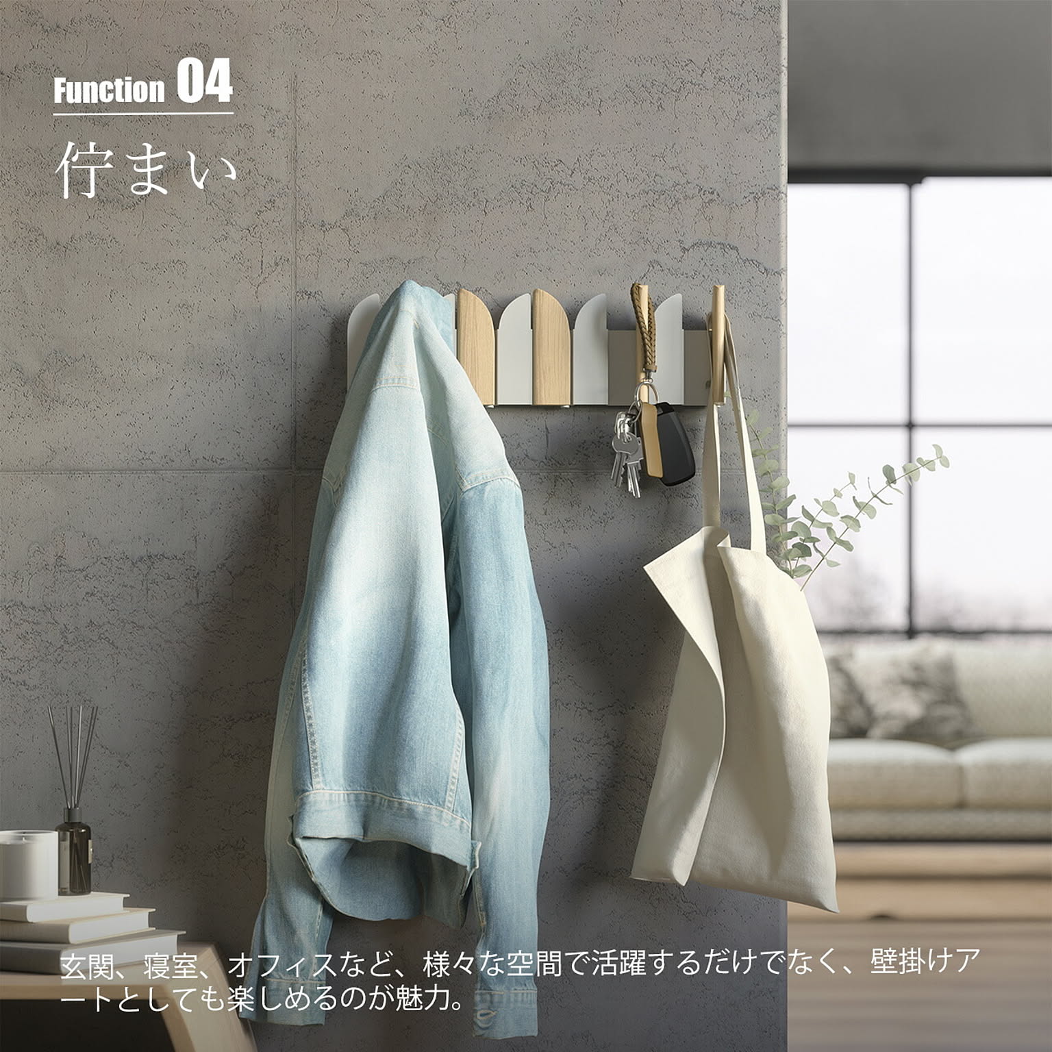 古き良き時代の酒場のスウィングドアをイメージして作られたフック。5つの折りたたみフックはそれぞれ最大2.3kgまで収納可能で、コートやバッグ、スカーフ、小物などをすっきり整理。使わないときはフックを閉じることで、1つのオブジェのように壁を飾ってくれます。玄関、寝室、オフィスなど、様々な空間で活躍するだけでなく、壁掛けアートとしても楽しめるのが魅力。付属のテンプレートで簡単に取り付けでき、ウッドと金属が交互に並ぶ本体は角度によって見え方が変わる動きのあるデザインです。