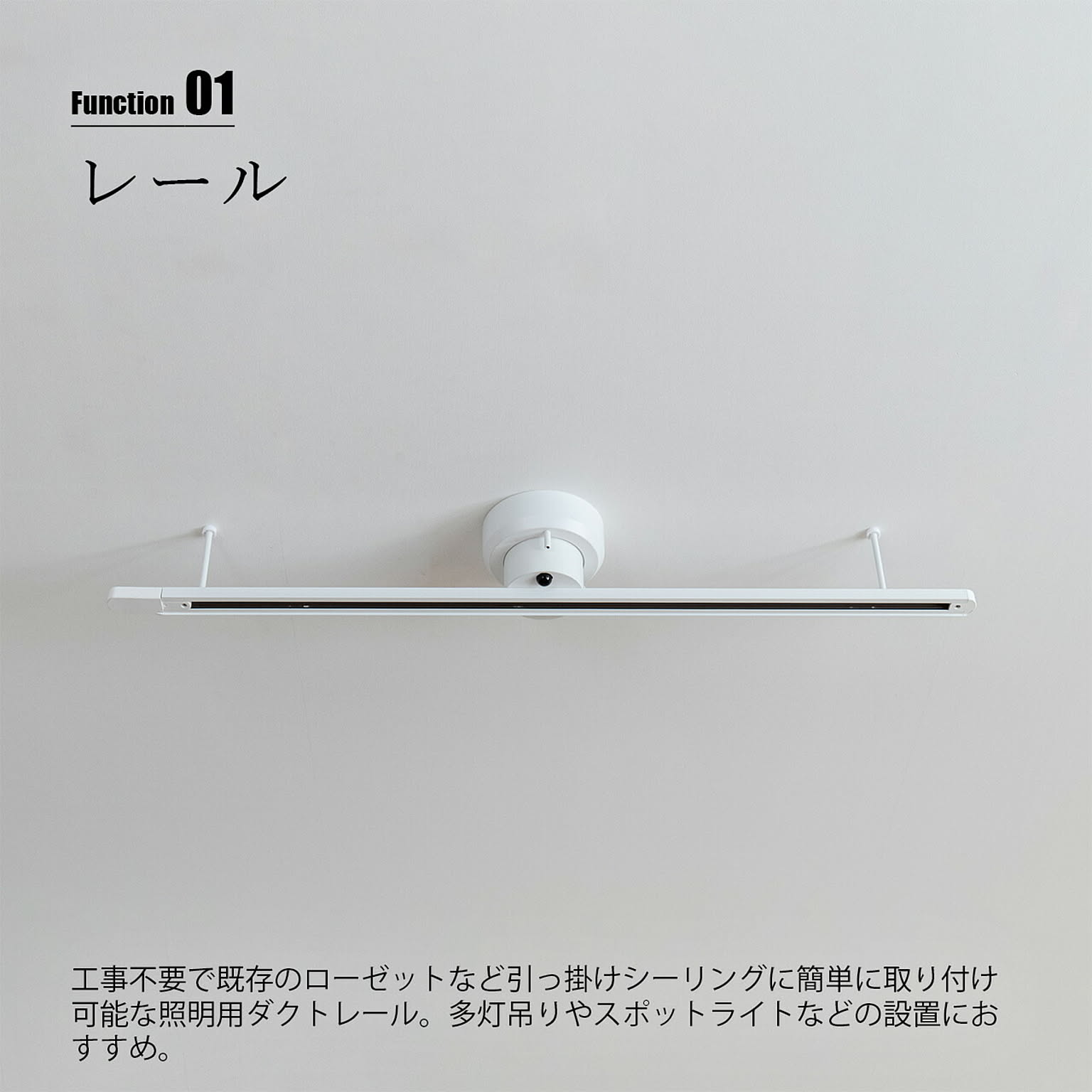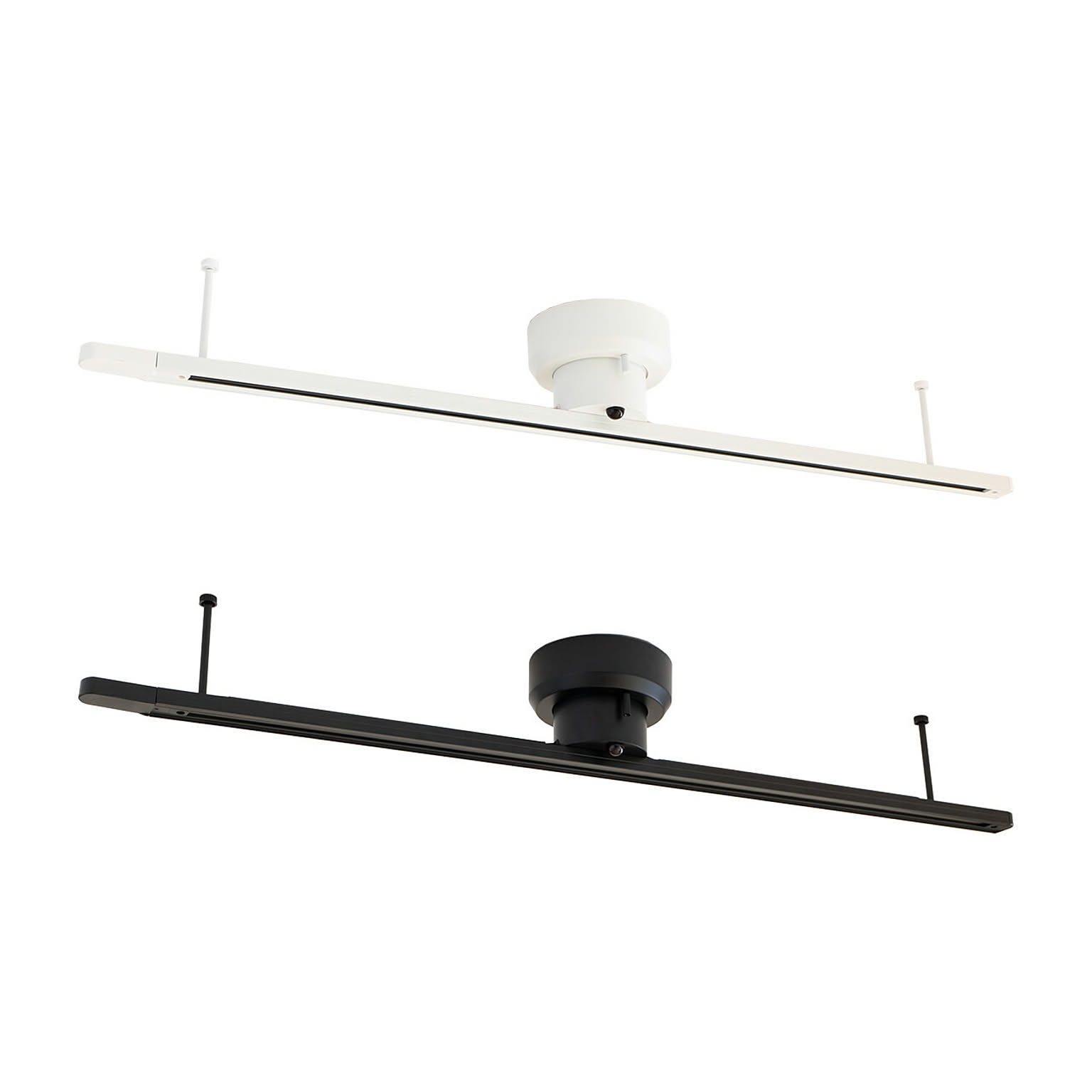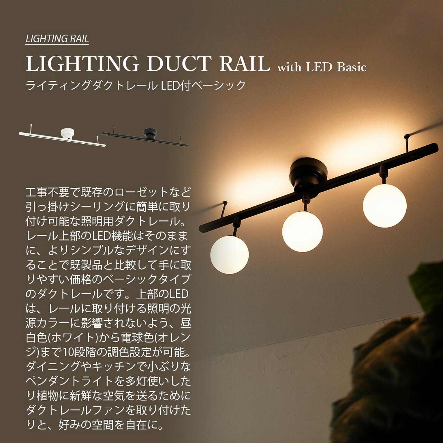 工事不要で既存のローゼットなど引っ掛けシーリングに簡単に取り付け可能な照明用ダクトレール。レール上部のLED機能はそのままに、よりシンプルなデザインにすることで既製品と比較して手に取りやすい価格のベーシックタイプのダクトレールです。上部のLEDは、レールに取り付ける照明の光源カラーに影響されないよう、昼白色(ホワイト)から電球色(オレンジ)まで10段階の調色設定が可能。ダイニングやキッチンで小ぶりなペンダントライトを多灯使いしたり植物に新鮮な空気を送るためにダクトレールファンを取り付けたりと、好みの空間を自在に作れます。