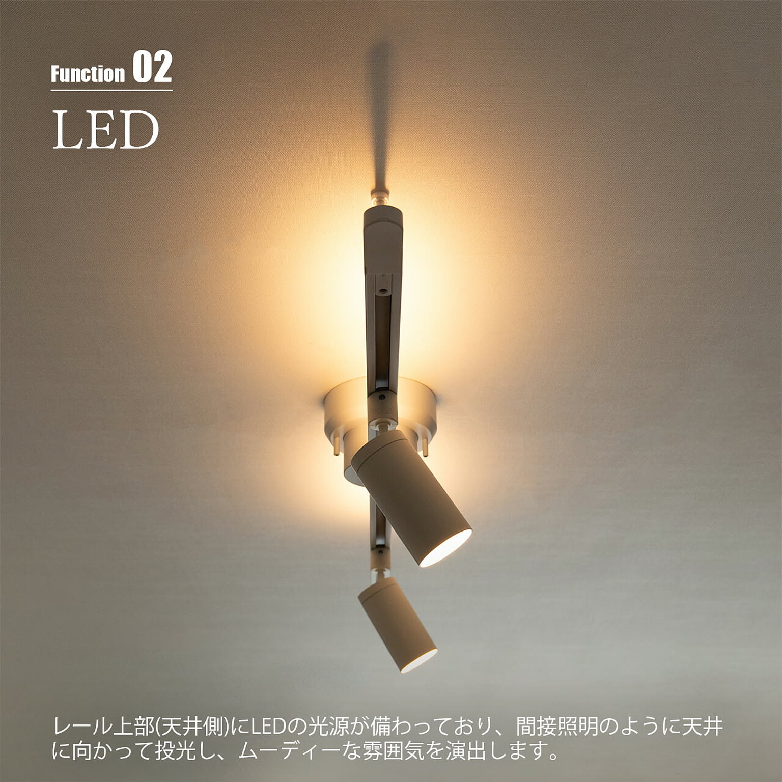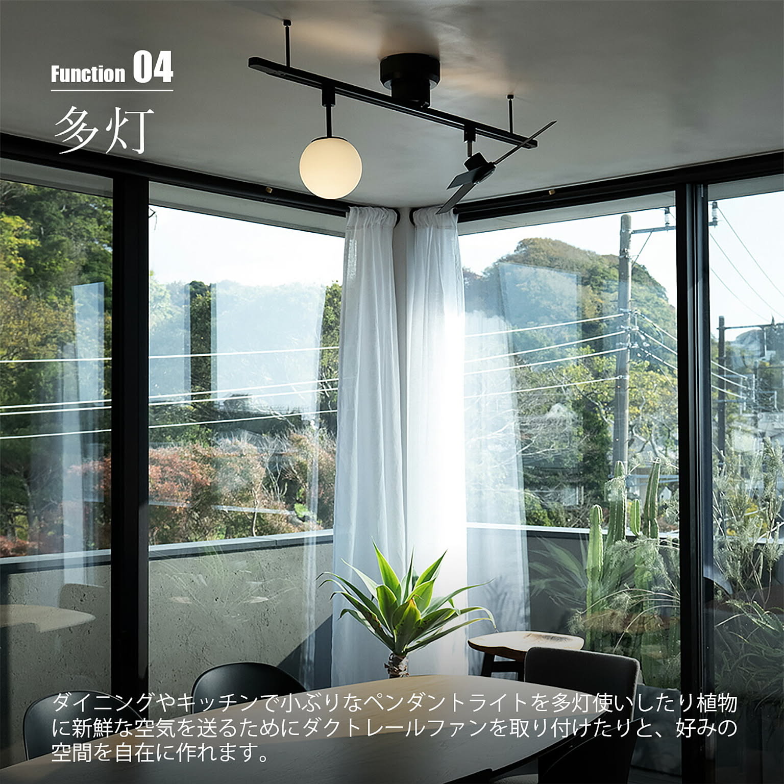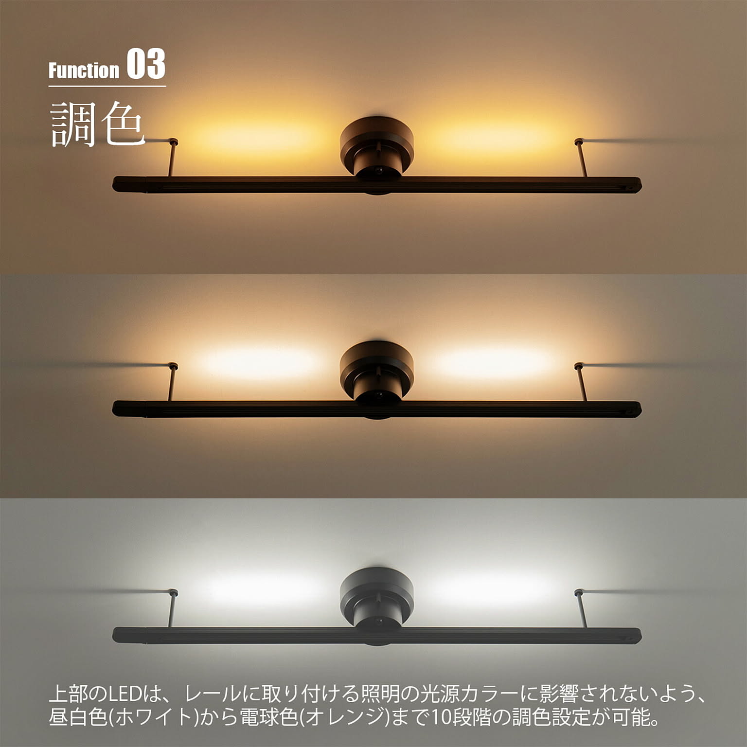 工事不要で既存のローゼットなど引っ掛けシーリングに簡単に取り付け可能な照明用ダクトレール。レール上部のLED機能はそのままに、よりシンプルなデザインにすることで既製品と比較して手に取りやすい価格のベーシックタイプのダクトレールです。上部のLEDは、レールに取り付ける照明の光源カラーに影響されないよう、昼白色(ホワイト)から電球色(オレンジ)まで10段階の調色設定が可能。ダイニングやキッチンで小ぶりなペンダントライトを多灯使いしたり植物に新鮮な空気を送るためにダクトレールファンを取り付けたりと、好みの空間を自在に作れます。