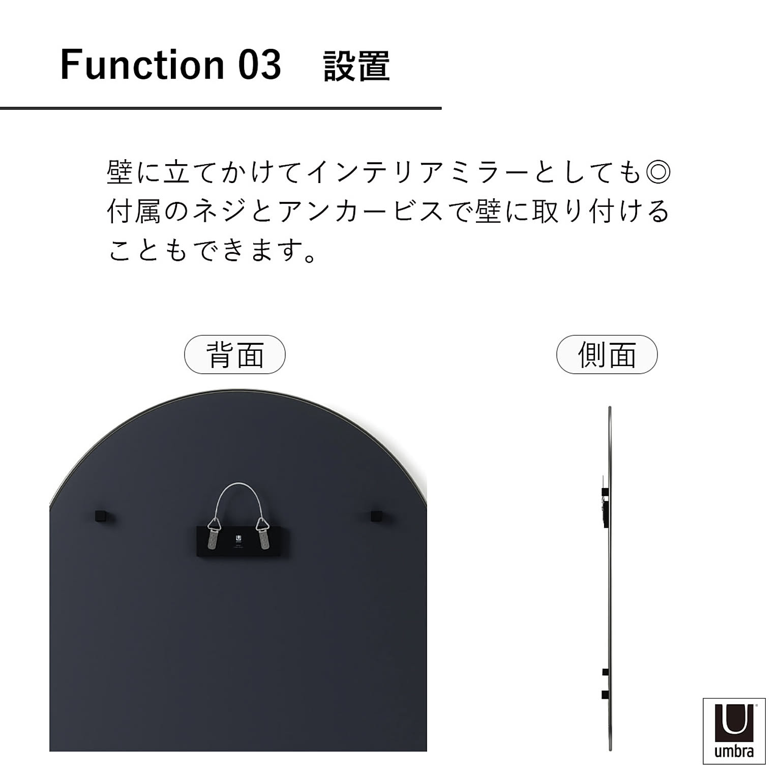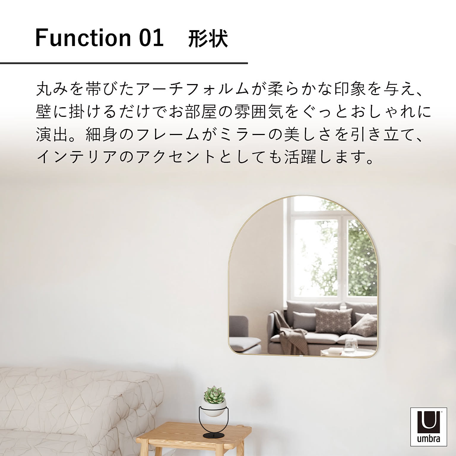 玄関やリビングの壁面装飾としてはもちろん、ベッドルームやドレッサー周りにもおすすめ。機能性とデザイン性を兼ね備えた、長く使えるウォールミラーです。やわらかな曲線を描くアーチフォルムは、空間にやさしい雰囲気をプラス。