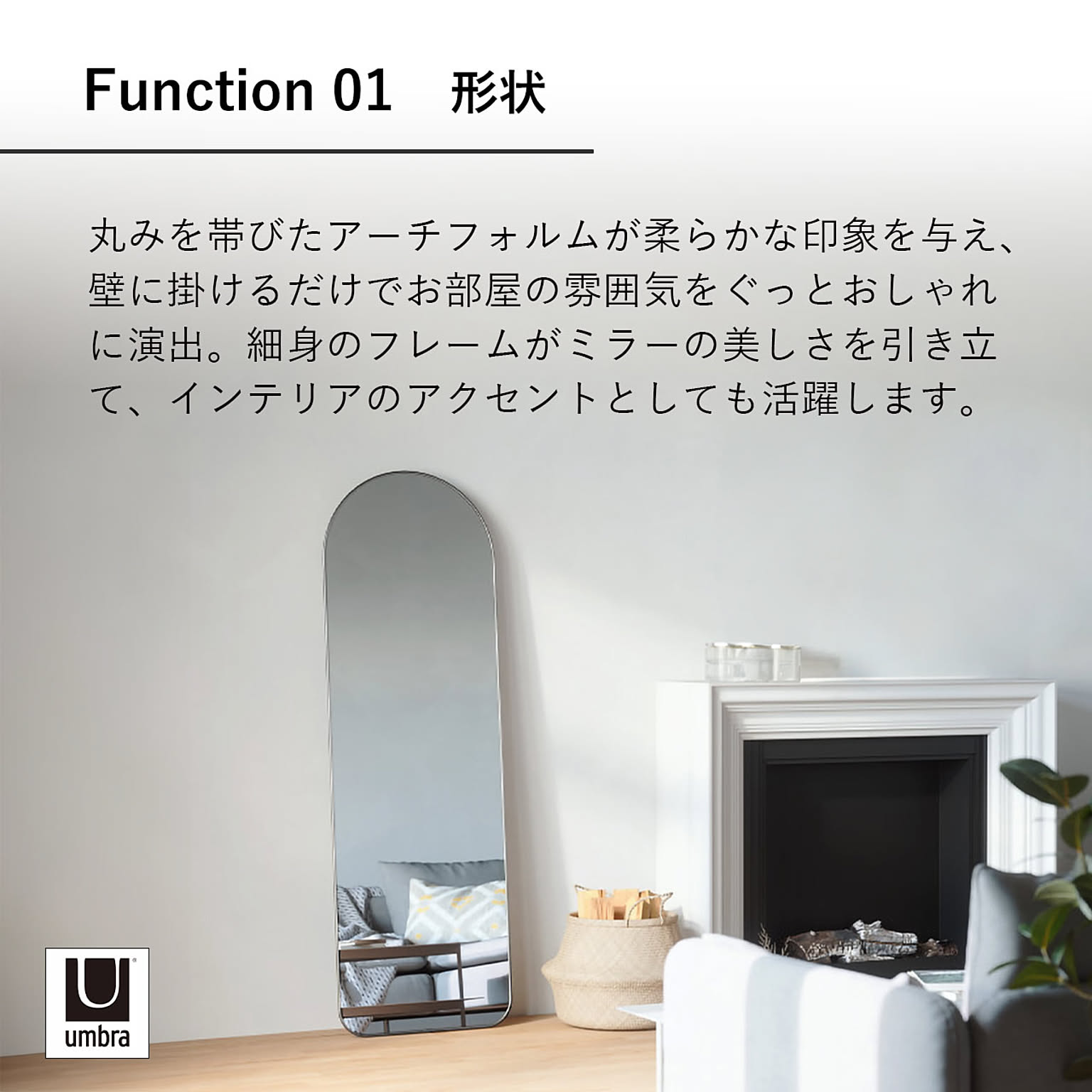美しいアーチフォルムが空間のアクセントになるリーニングミラー。機能性とデザイン性を兼ね備えた、長く使えるウォールミラーです。やわらかな曲線を描くアーチフォルムは、空間にやさしい雰囲気をプラス。