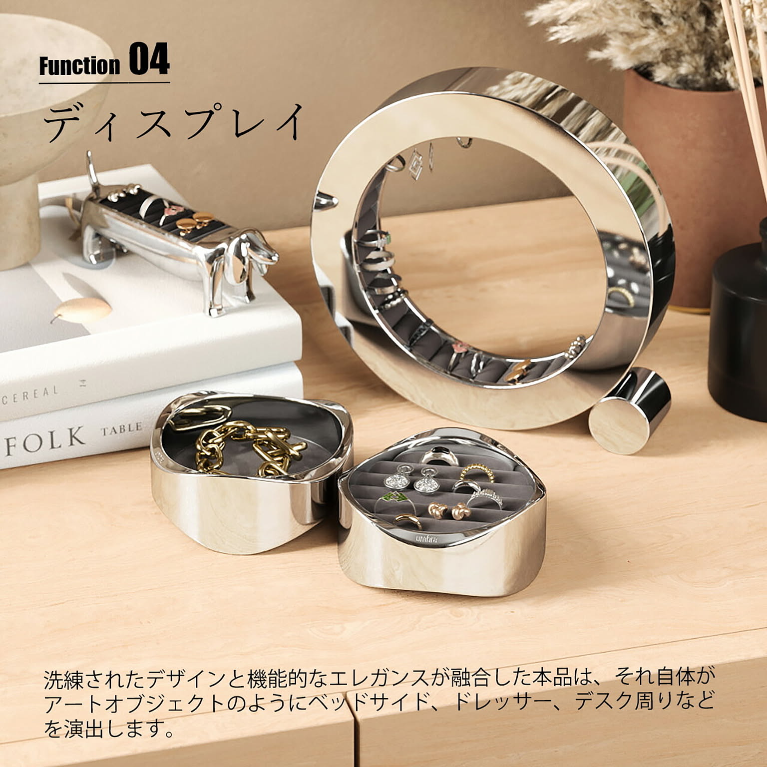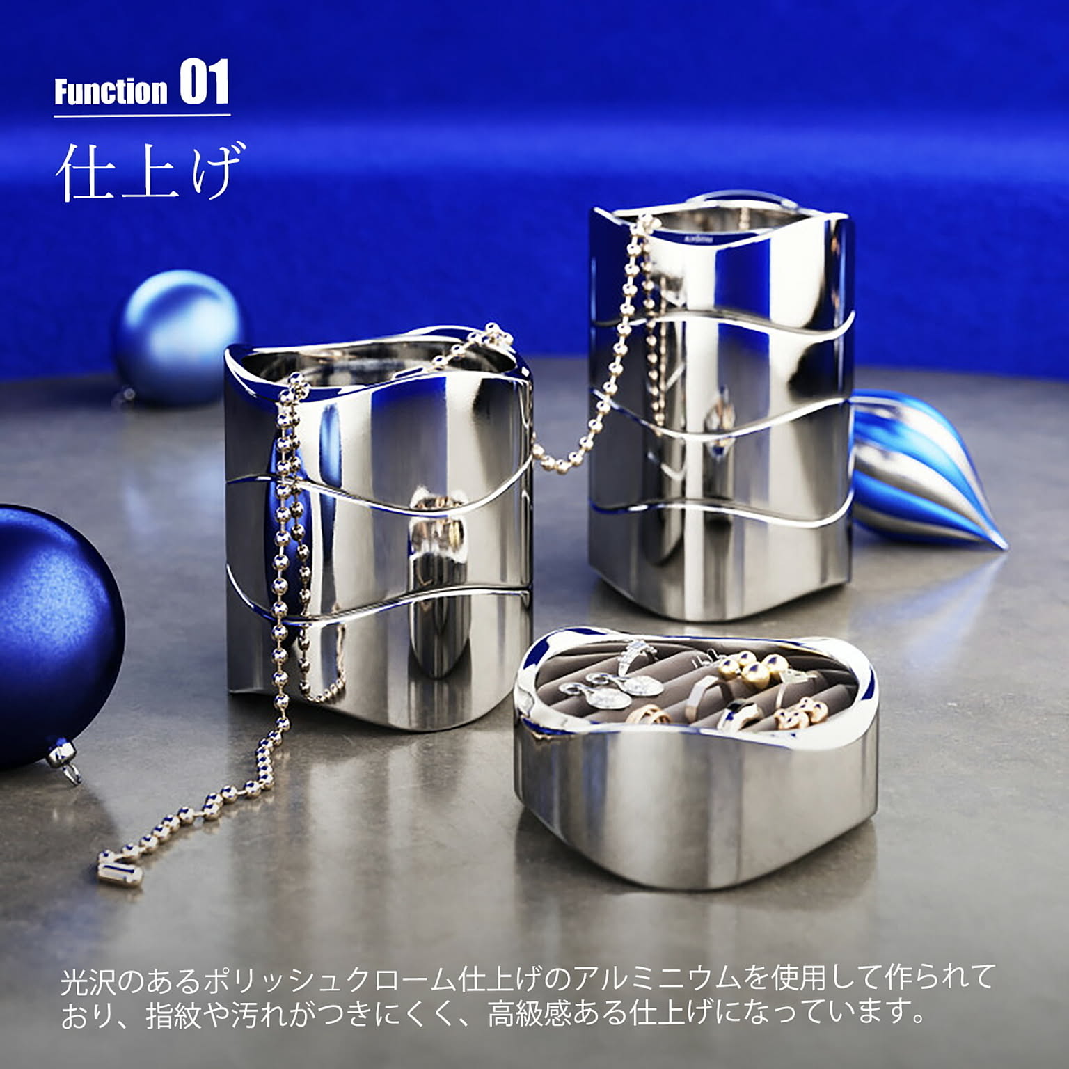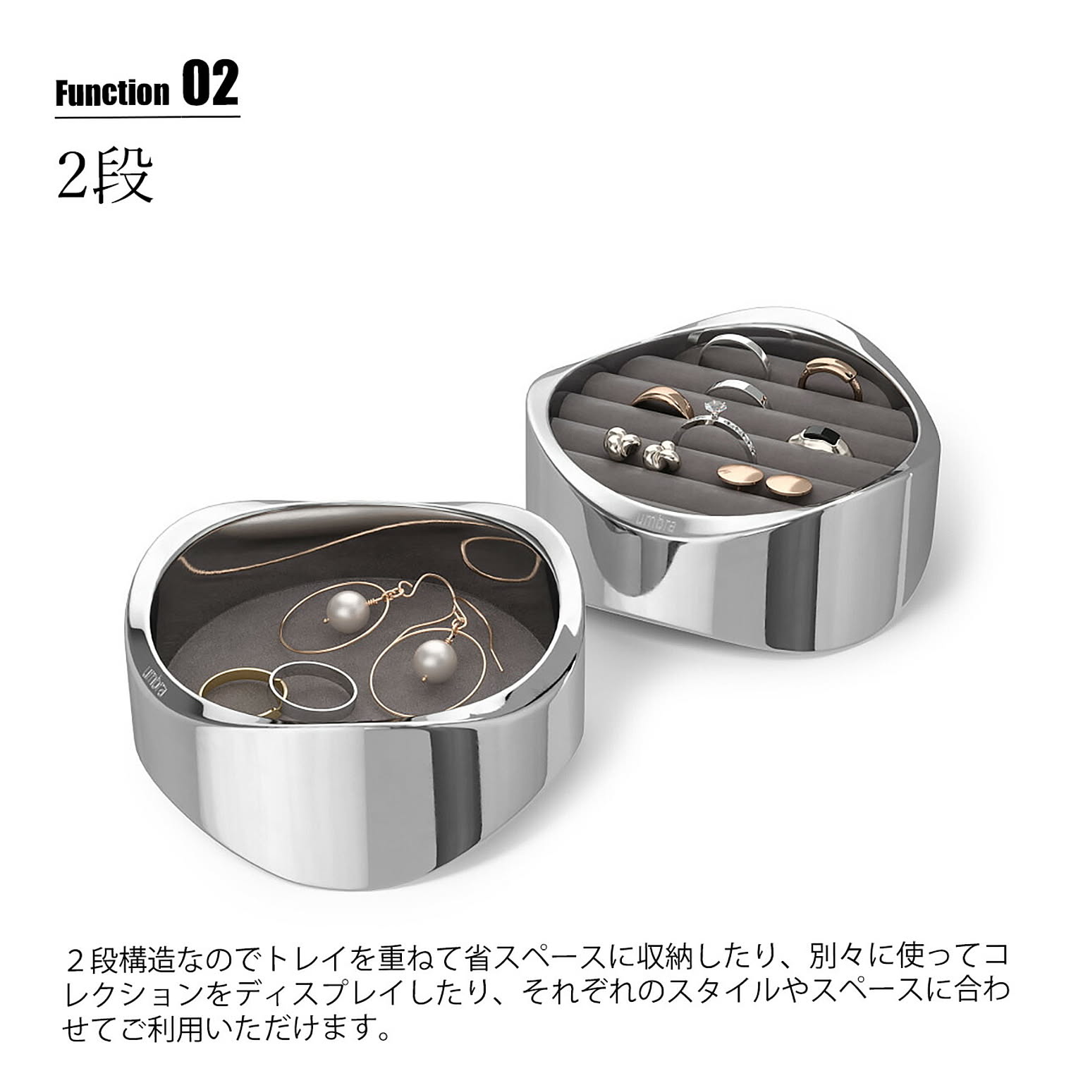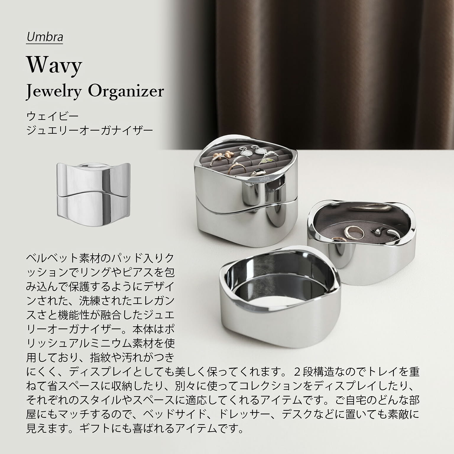 ベルベット素材のパッド入りクッションでリングやピアスを包み込んで保護するようにデザインされた、洗練されたエレガンスさと機能性が融合したジュエリーオーガナイザー。本体はポリッシュアルミニウム素材を使用しており、指紋や汚れがつきにくく、ディスプレイとしても美しく保ってくれます。2段構造なのでトレイを重ねて省スペースに収納したり、別々に使ってコレクションをディスプレイしたり、それぞれのスタイルやスペースに適応してくれるアイテムです。ご自宅のどんな部屋にもマッチするので、ベッドサイド、ドレッサー、デスクなどに置いても素敵に見えます。 男女問わずギフトにも喜ばれるアイテムです。