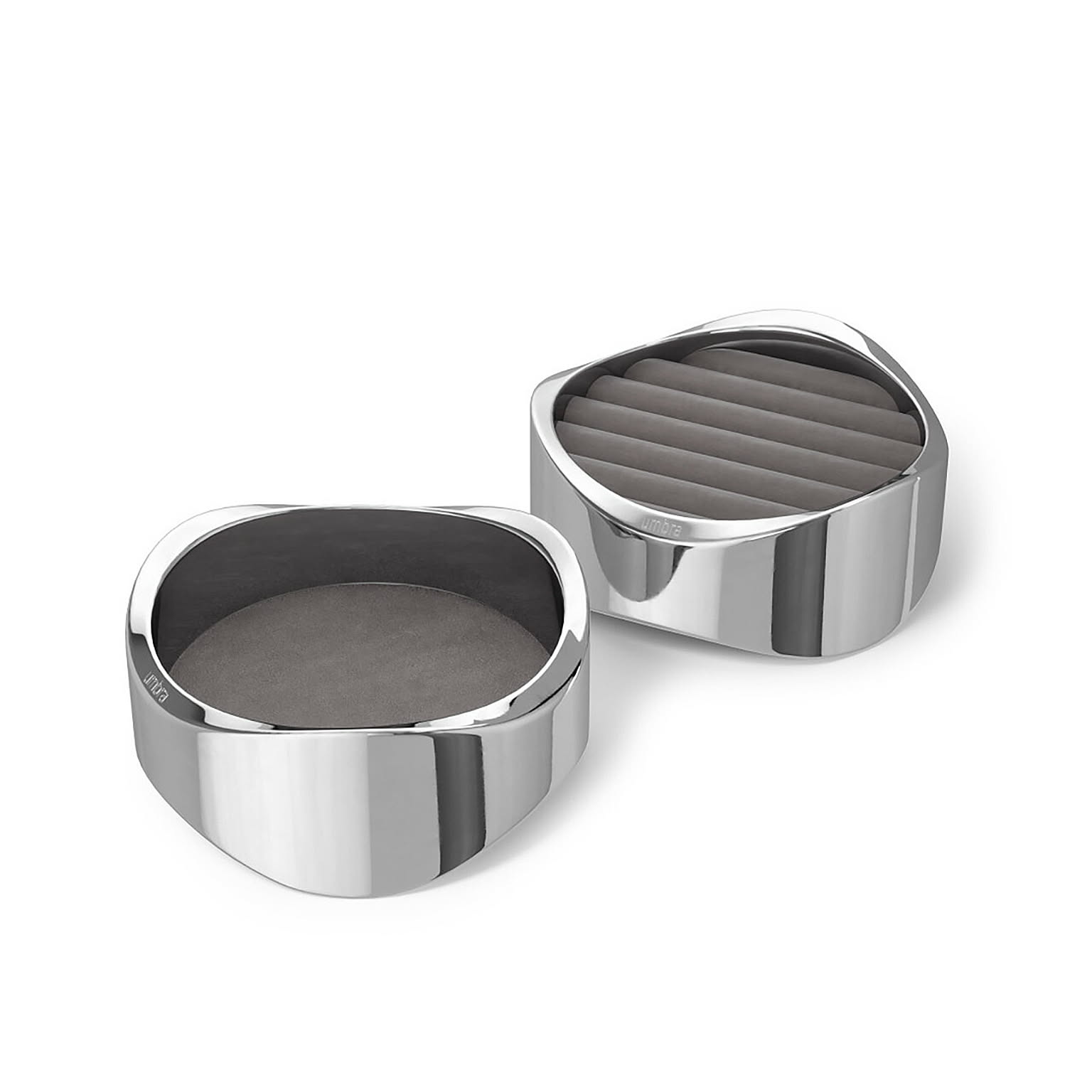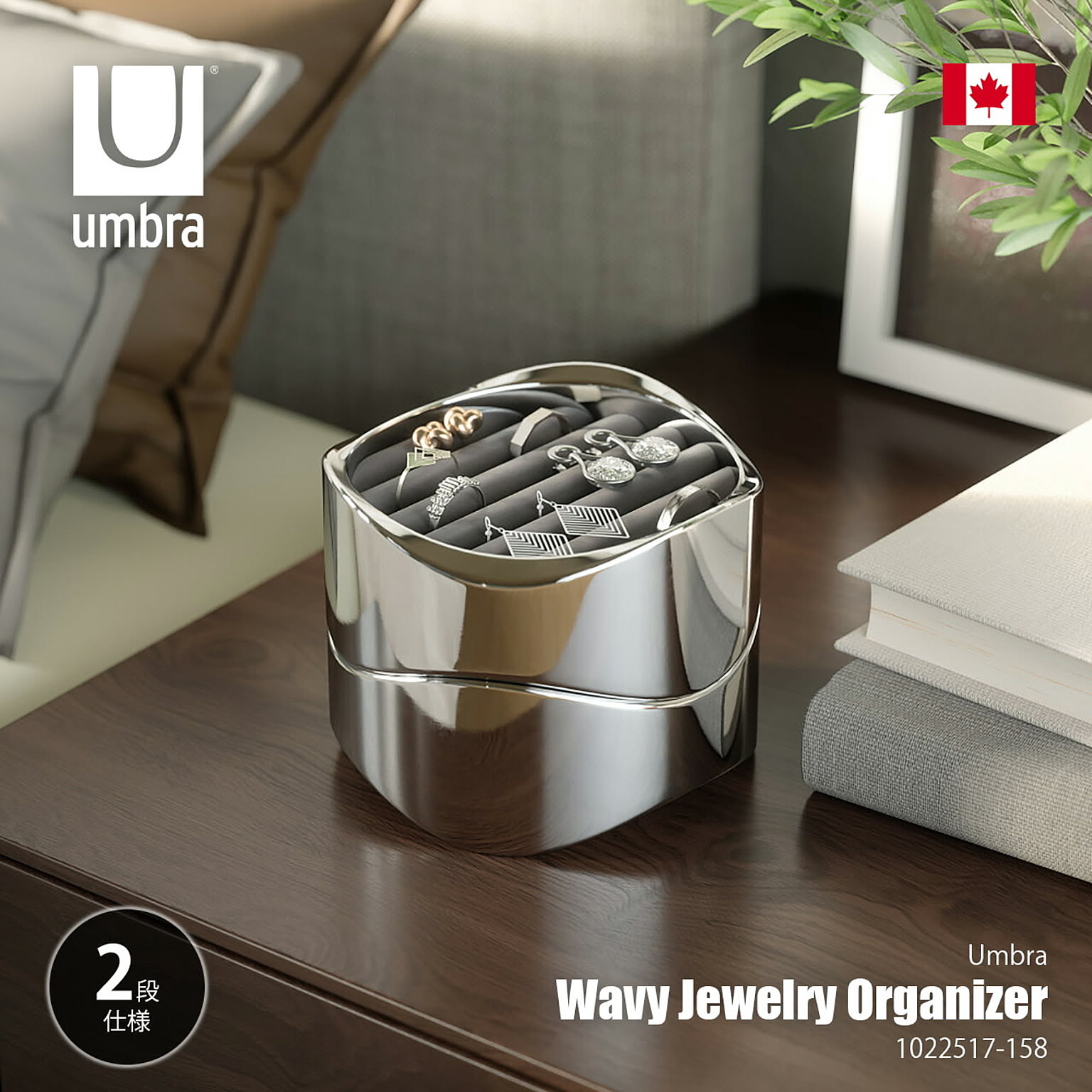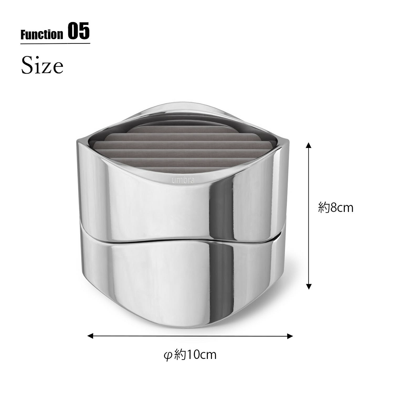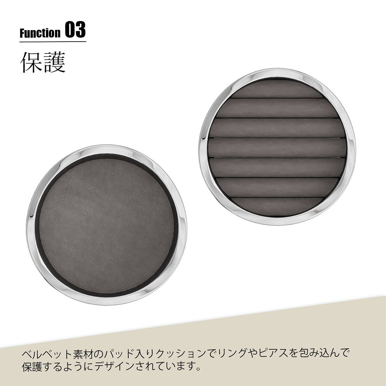 ベルベット素材のパッド入りクッションでリングやピアスを包み込んで保護するようにデザインされた、洗練されたエレガンスさと機能性が融合したジュエリーオーガナイザー。本体はポリッシュアルミニウム素材を使用しており、指紋や汚れがつきにくく、ディスプレイとしても美しく保ってくれます。2段構造なのでトレイを重ねて省スペースに収納したり、別々に使ってコレクションをディスプレイしたり、それぞれのスタイルやスペースに適応してくれるアイテムです。ご自宅のどんな部屋にもマッチするので、ベッドサイド、ドレッサー、デスクなどに置いても素敵に見えます。 男女問わずギフトにも喜ばれるアイテムです。