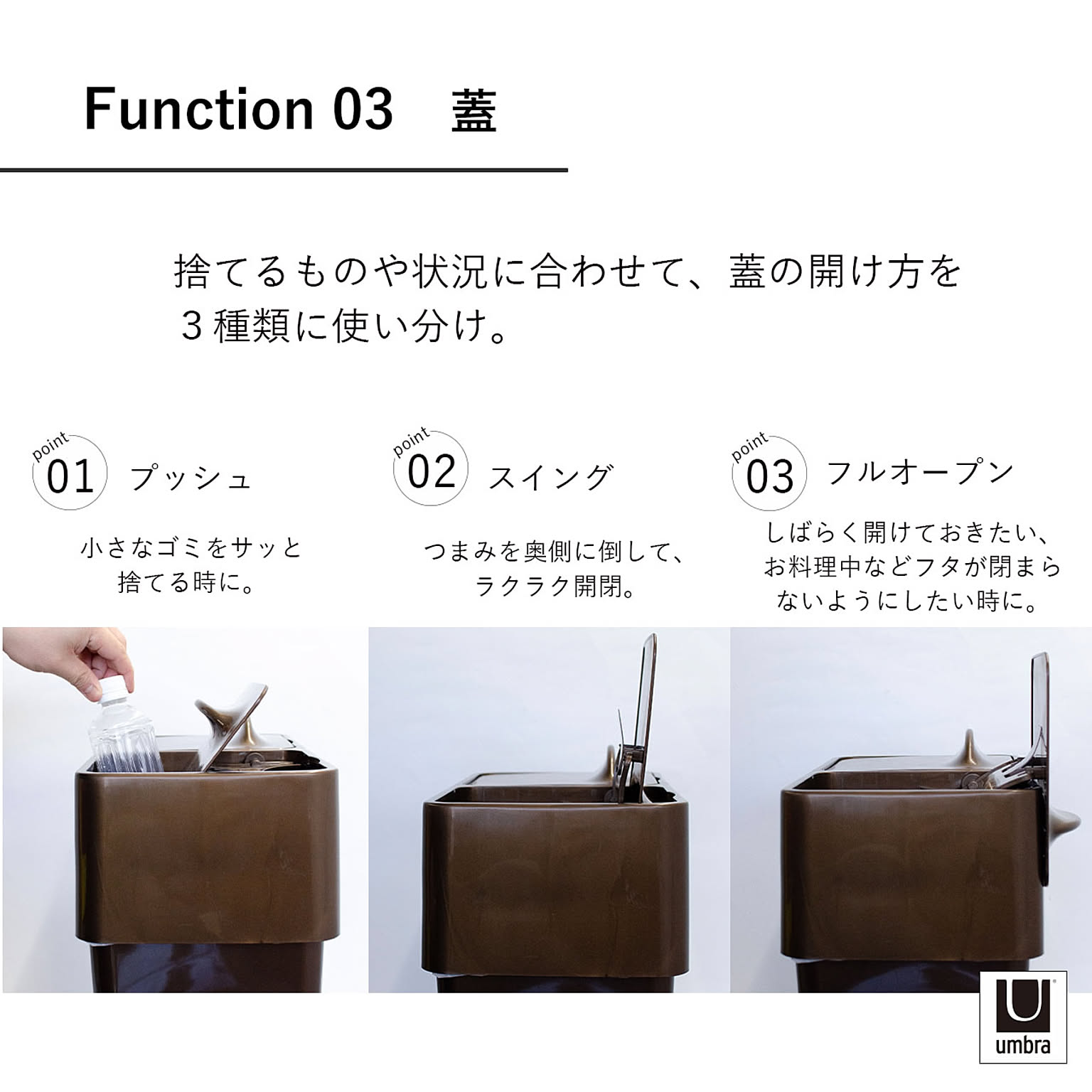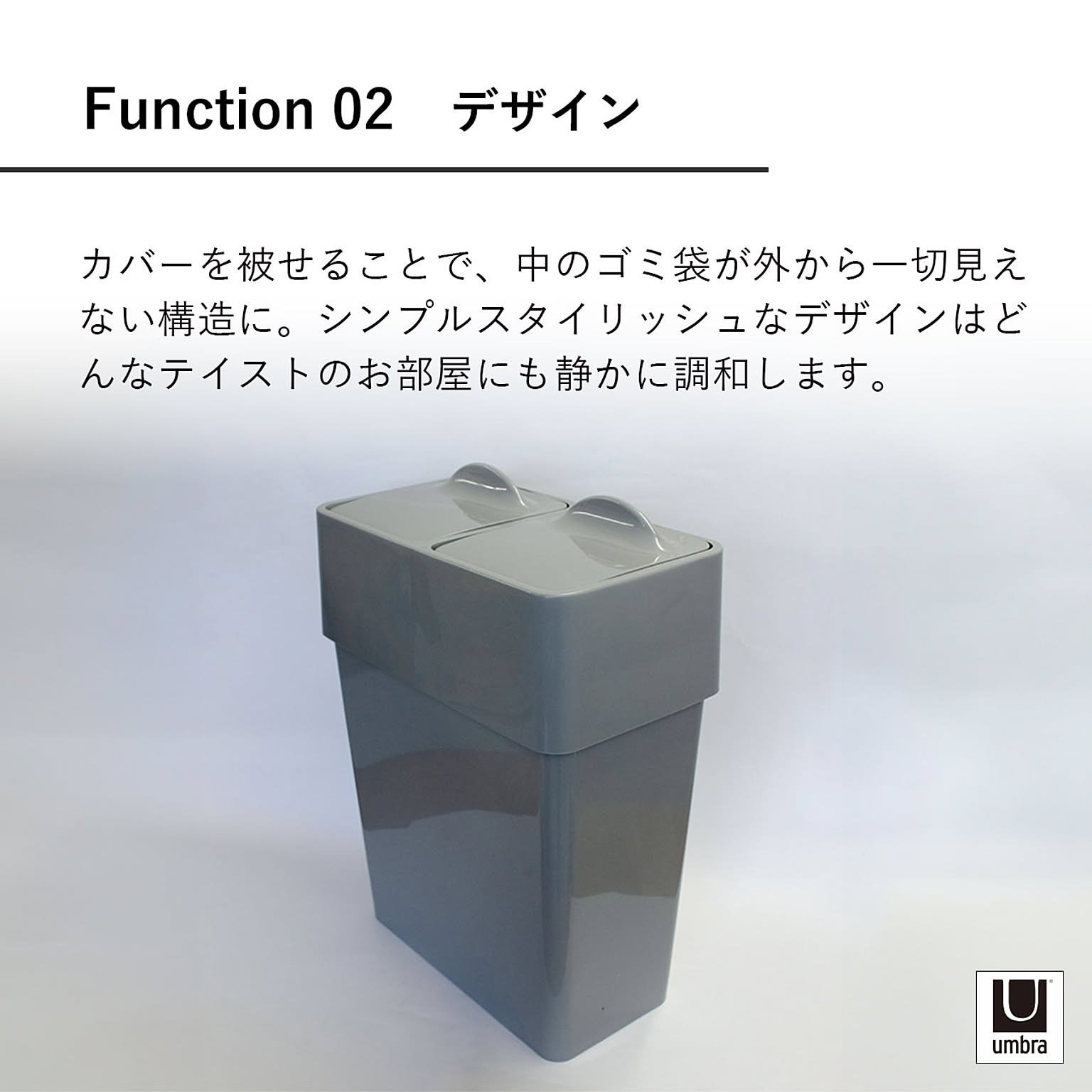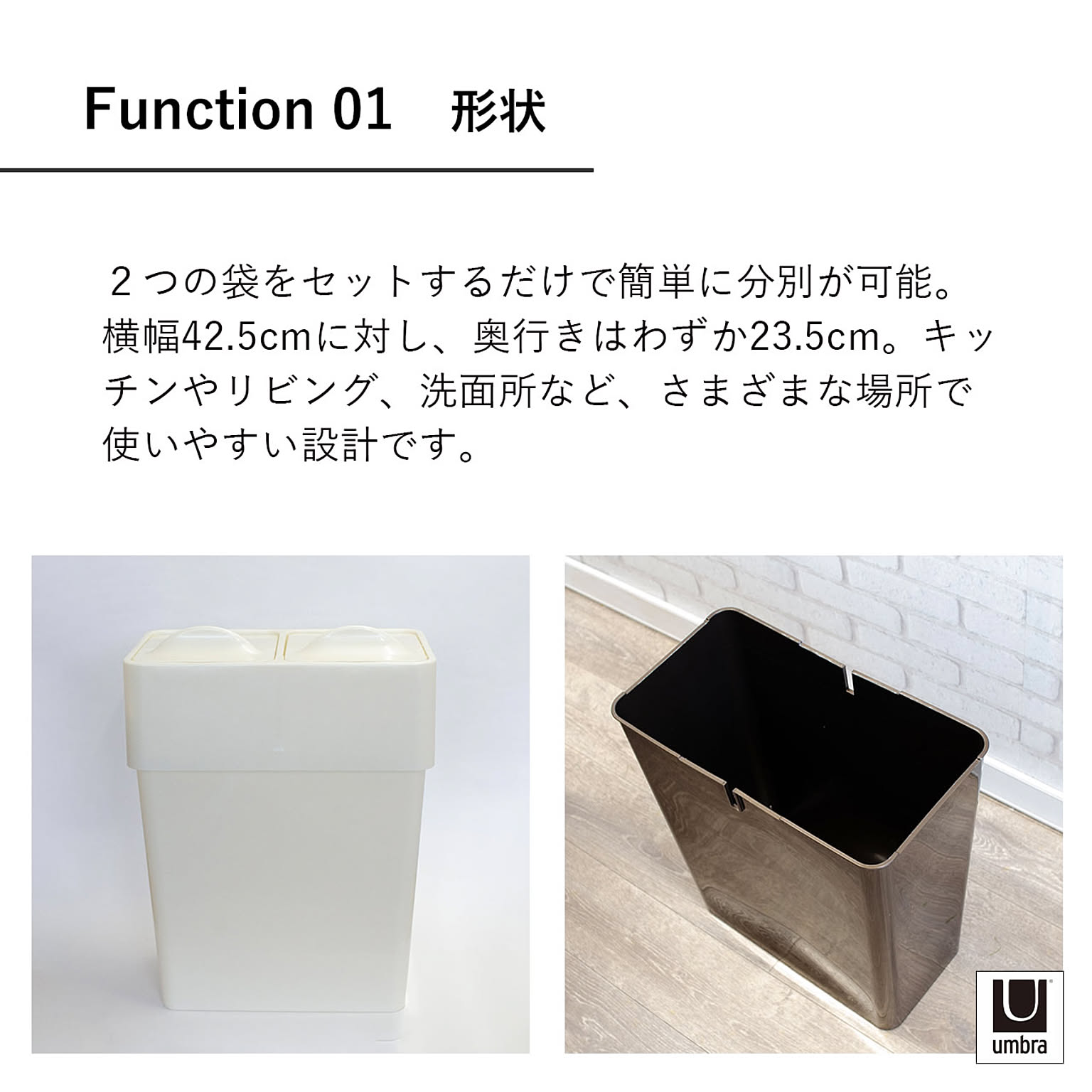 内部に設計されたくぼみを利用し、2つの袋をセットするだけで簡単に分別が可能。ダストボックスを複数並べる必要がなく、お部屋をすっきりと見せることができます。お部屋の雰囲気を邪魔しない、ミニマルなデザインが魅力です。