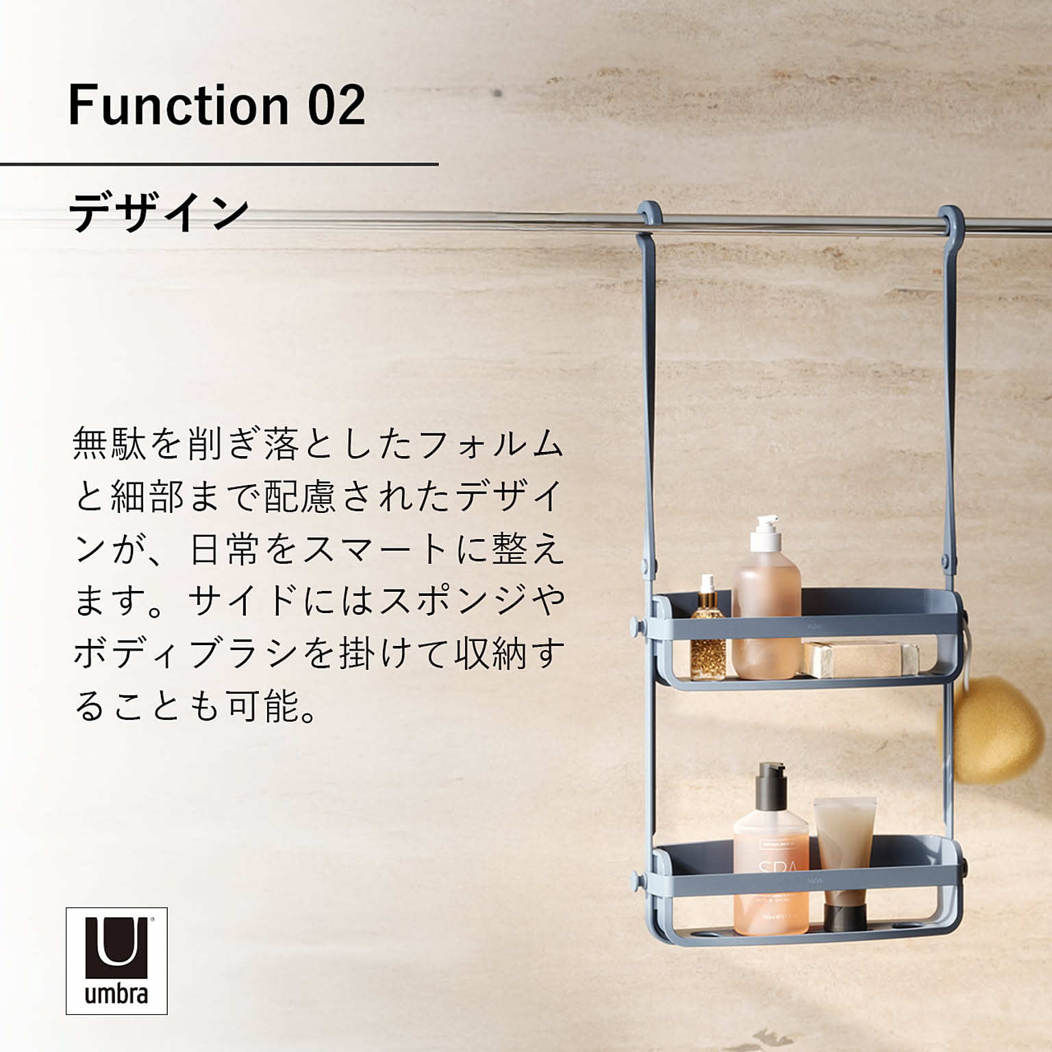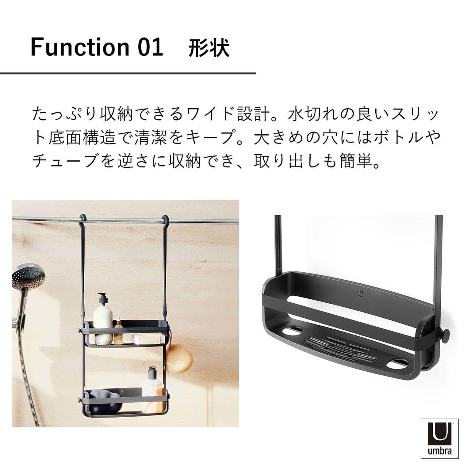 毎日使うシャンプーやボディソープを、すっきりまとめて収納。ボトル類はもちろん、石けんやスポンジまでまとめて収納可能。前面のバー付きで、物の落下を防ぎながら安定感をキープします。スリット底面でぬめりやカビの発生を軽減し、清潔に保ちます。