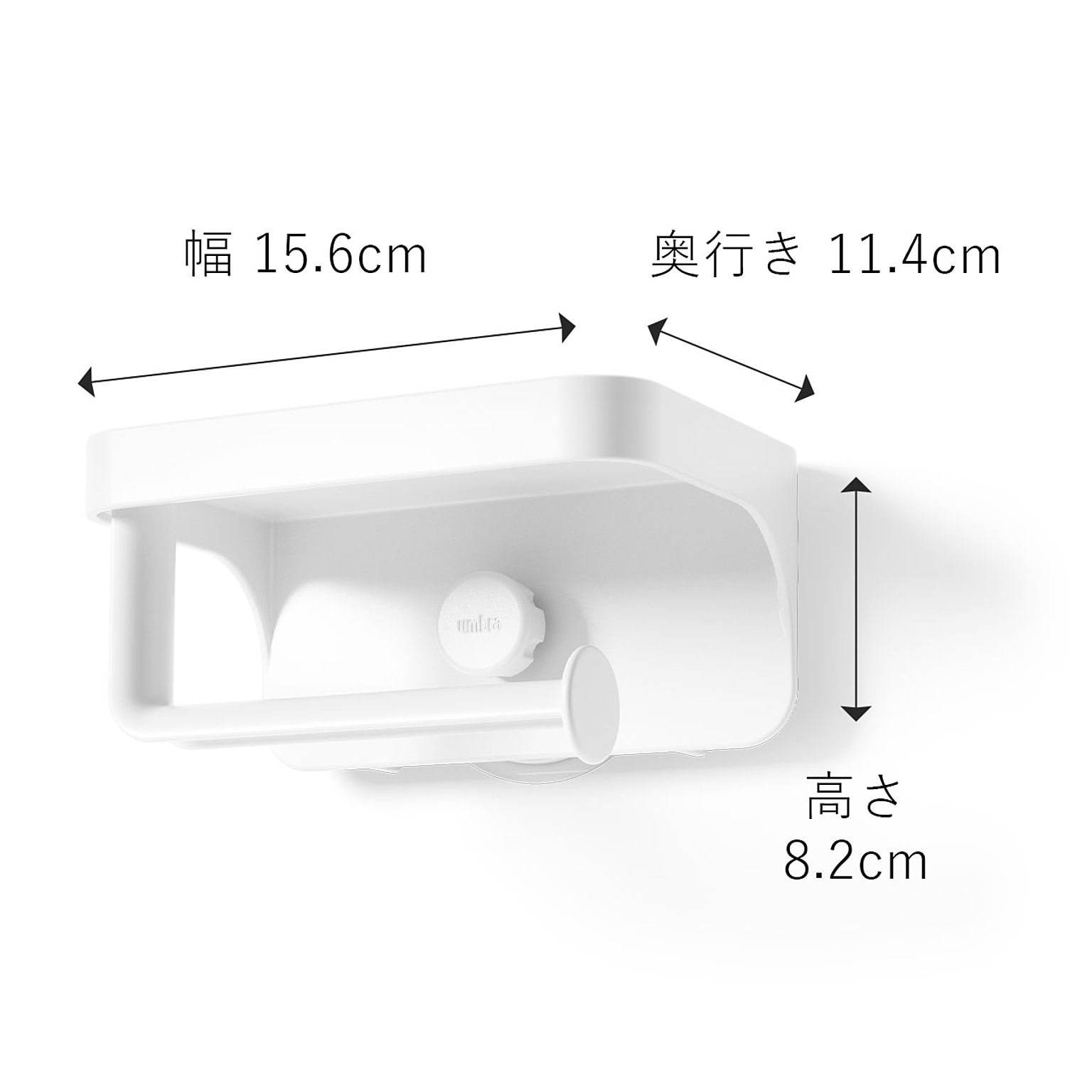 シンプルなトイレットペーパーホルダー。上部はフラットな天板になっており、スマートフォンやディフューザー、時計などを置くことができます。吸盤で取り付けるので、お好みの高さに調節可能。限られたトイレスペースでも圧迫感なく設置できます。