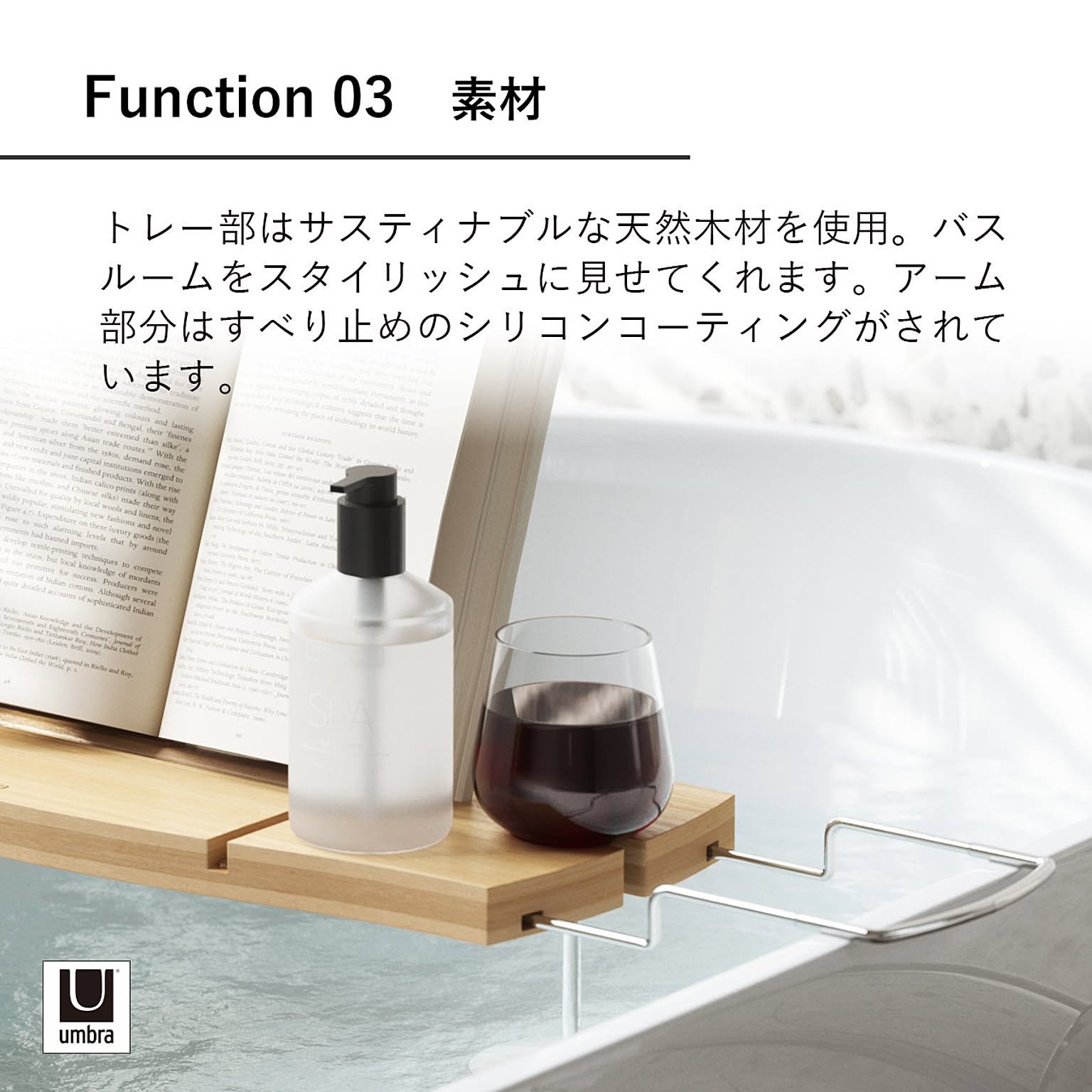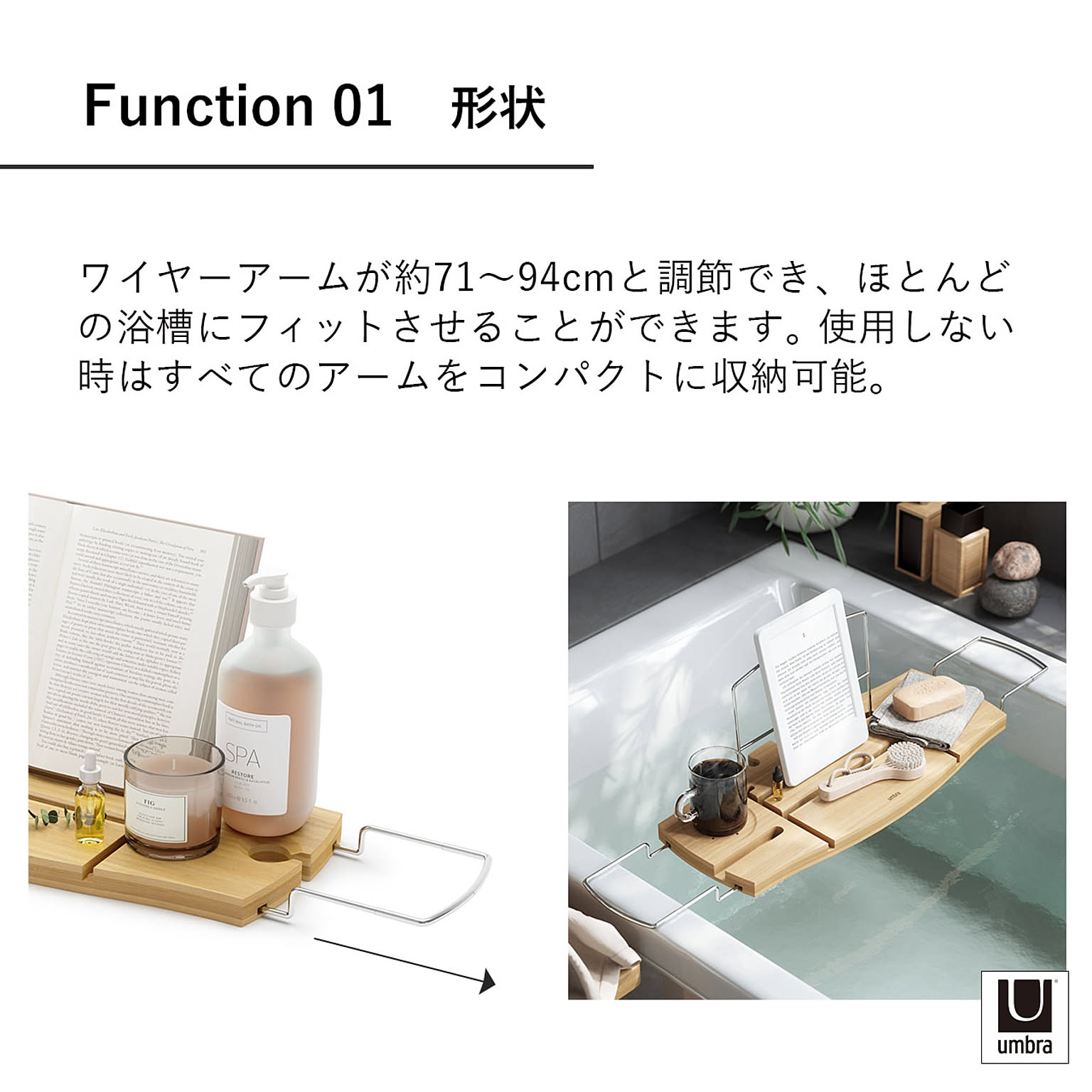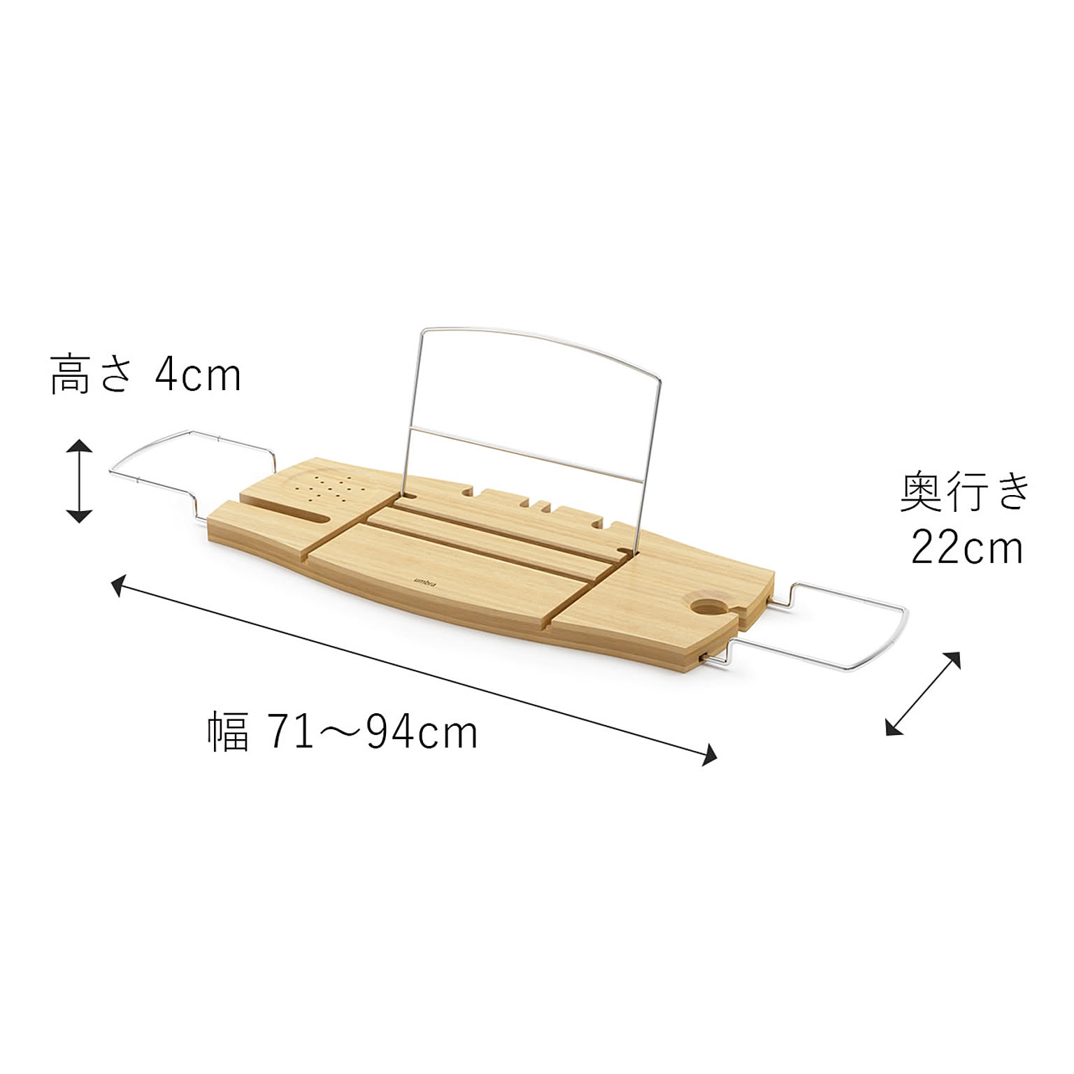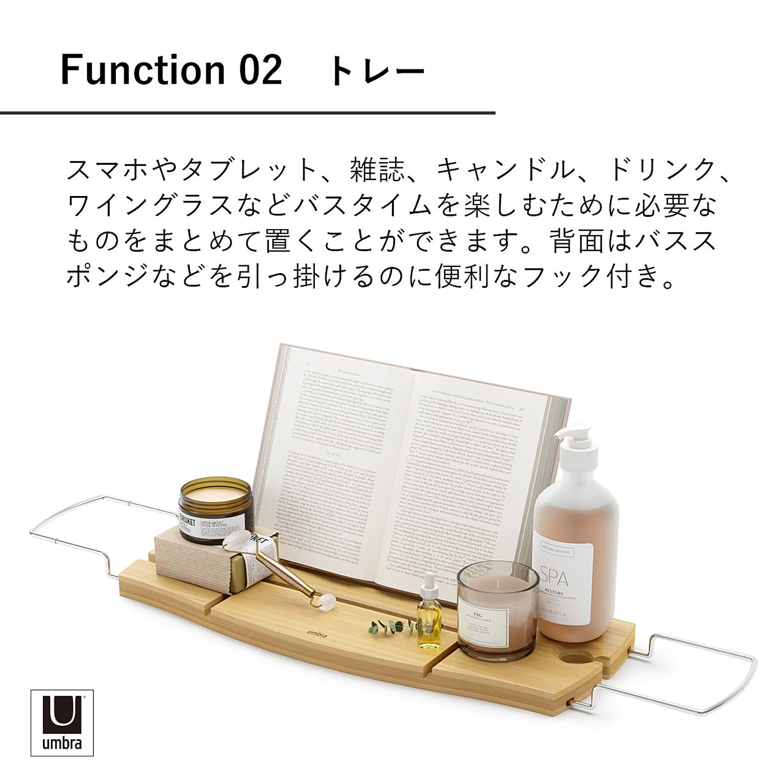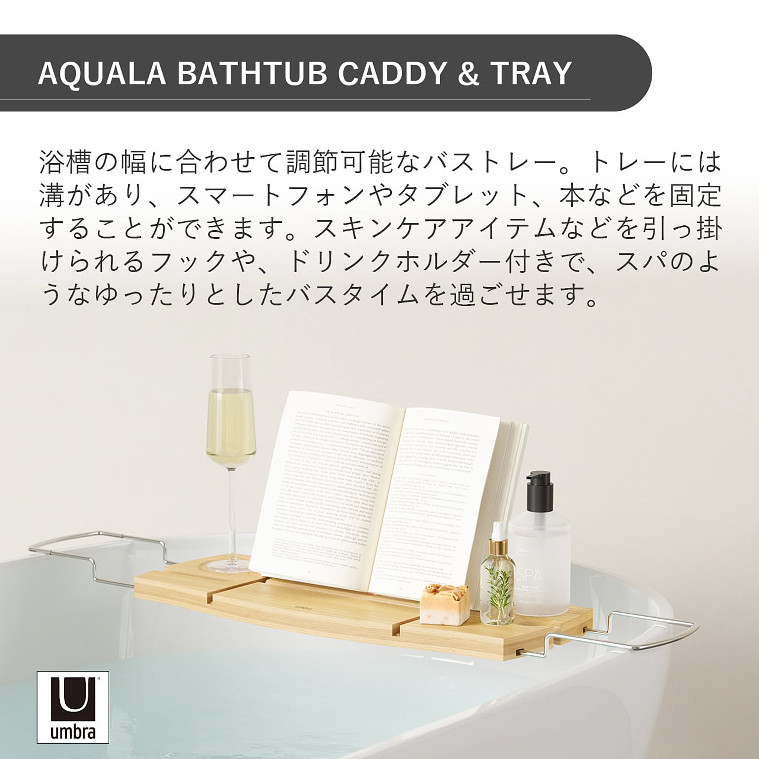 浴槽の幅に合わせて調節可能なバストレー。トレーには溝があり、スマートフォンやタブレット、本などを固定することができます。スキンケアアイテムなどを引っ掛けられるフックや、ドリンクホルダー付きで、スパのようなゆったりとしたバスタイムを過ごせます。