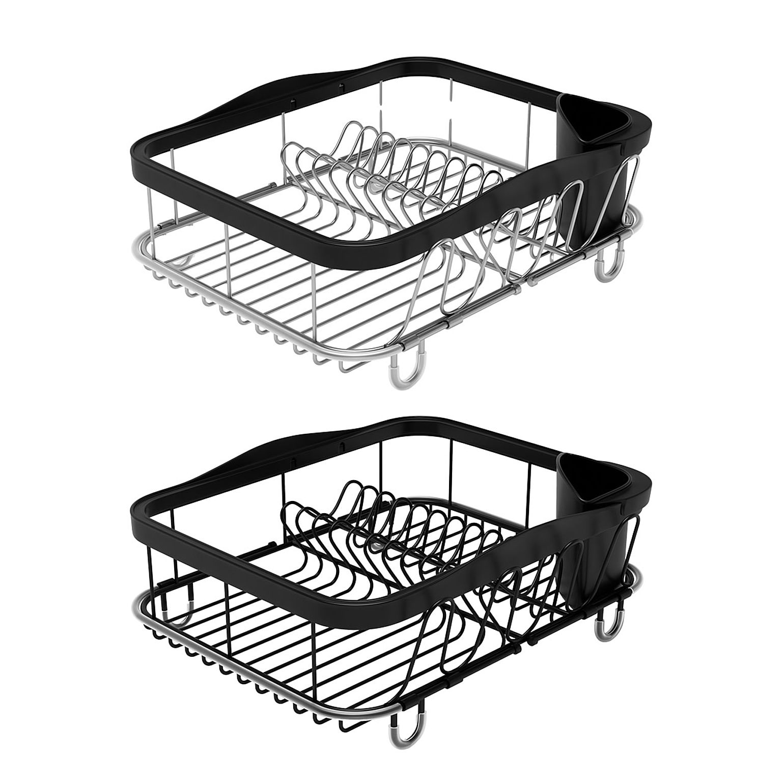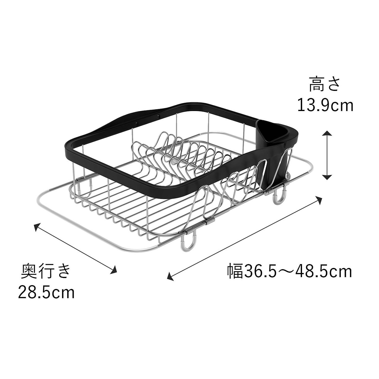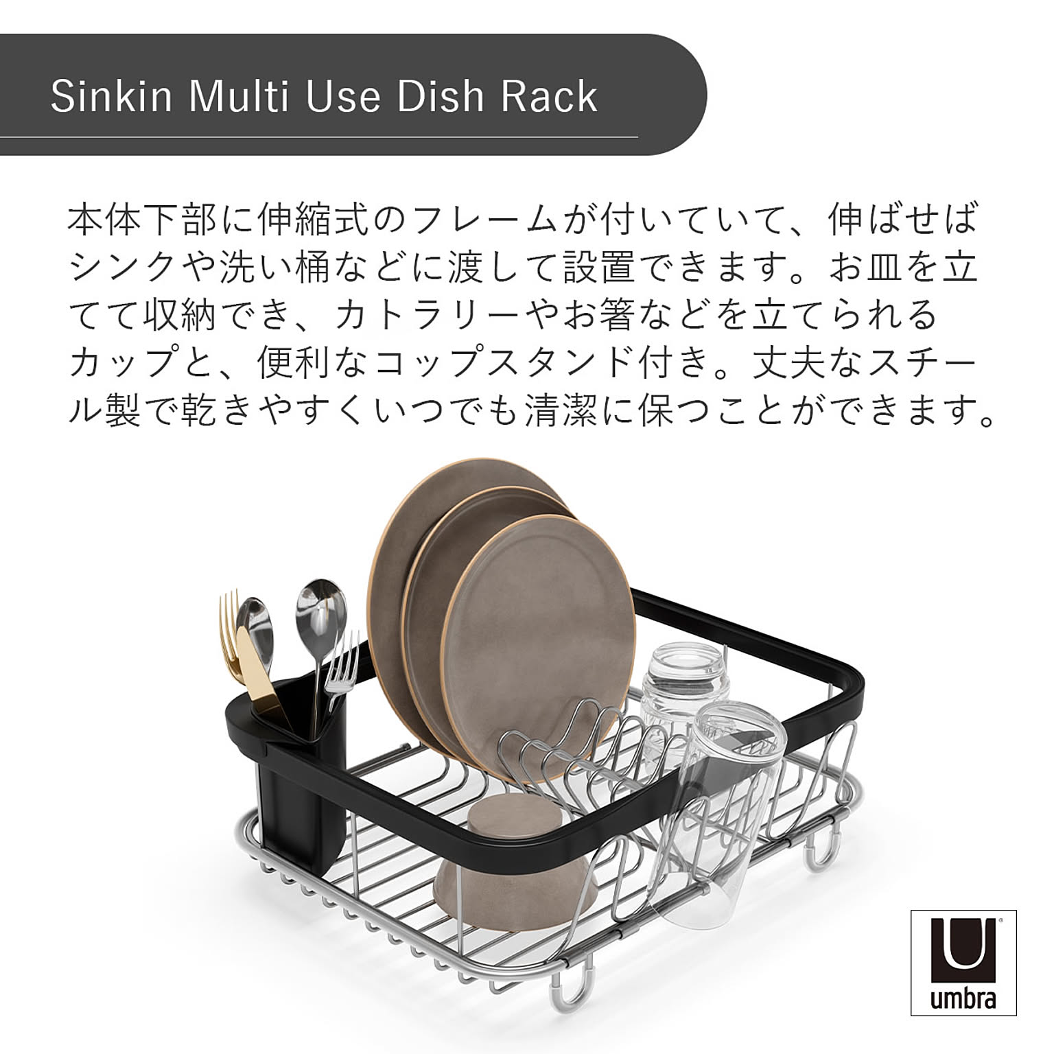 本体下部に伸縮式のフレームが付いていて、伸ばせばシンクや洗い桶などに渡して設置できます。お皿を立てて収納でき、カトラリーやお箸などを立てられるカップと、便利なコップスタンド付き。丈夫なスチール製で乾きやすくいつでも清潔に保つことができます。