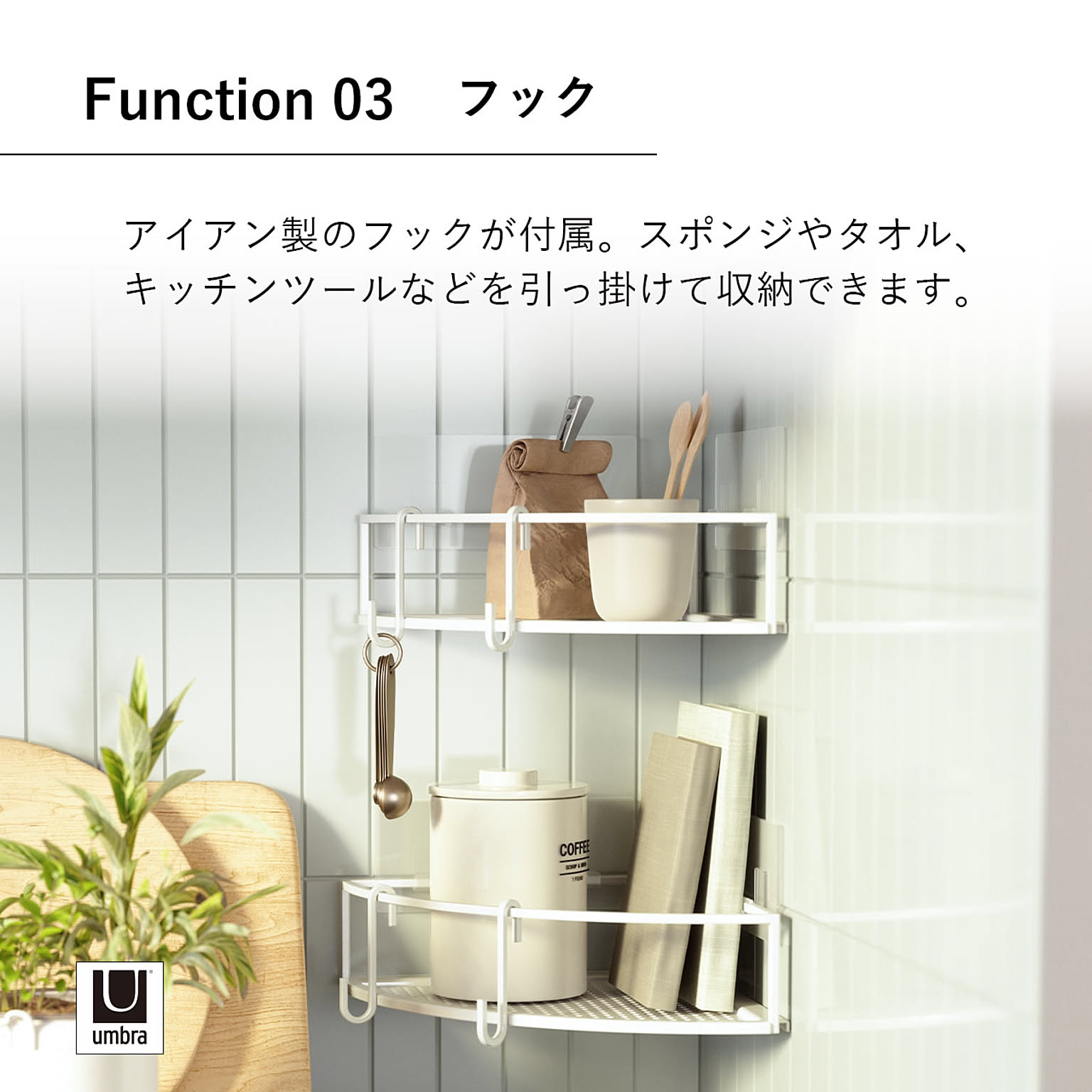 フィルムフックで簡単に取り付けできる収納ラック。モダンなワイヤーデザインで、スポンジやタオル、キッチンツールなどを引っ掛けられるフックが付属。バスルームやキッチンにおすすめです。