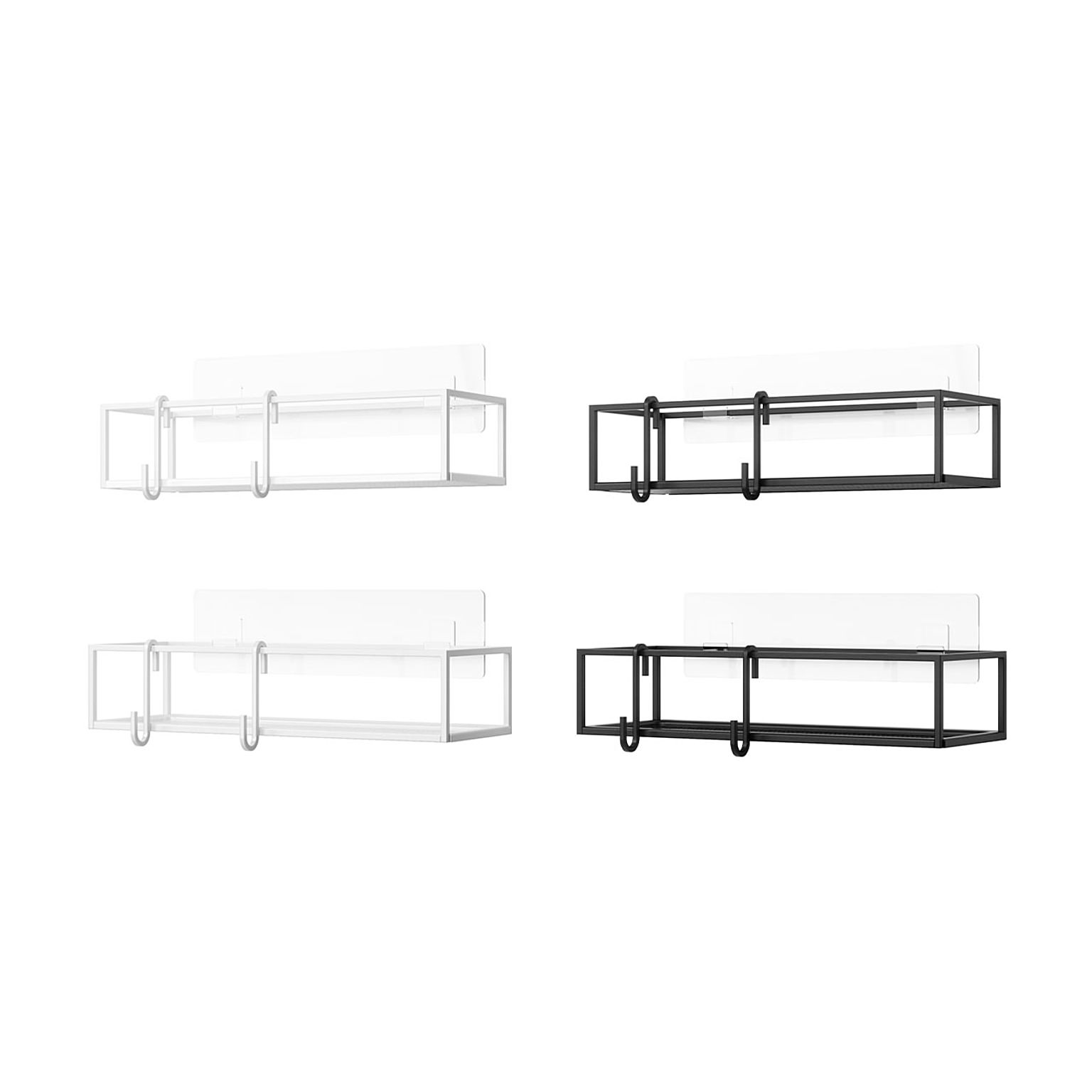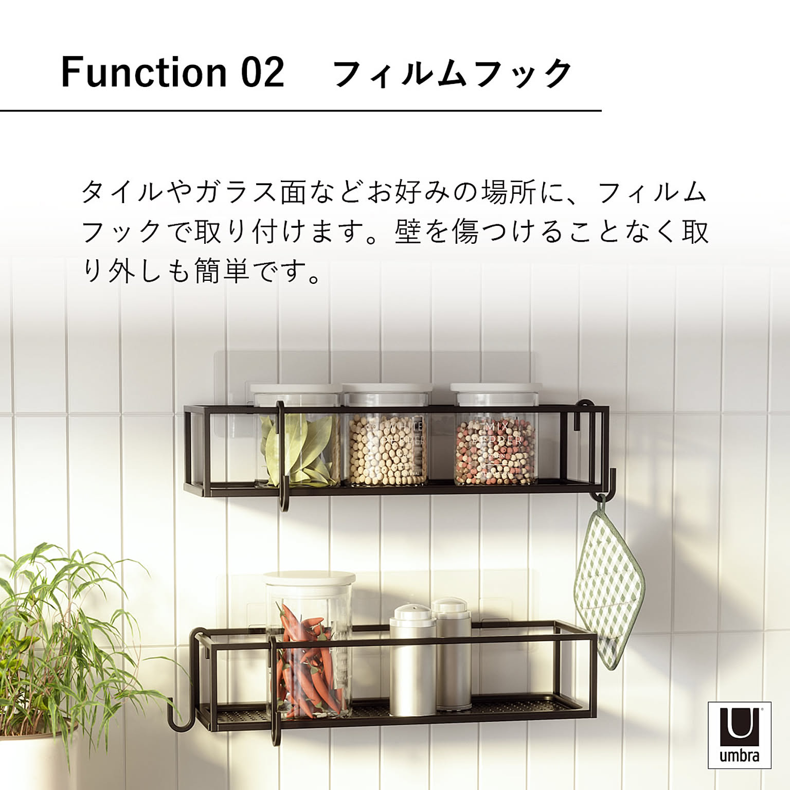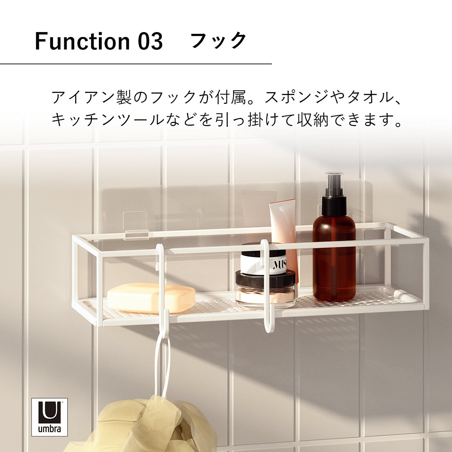 フィルムフックで簡単に取り付けできる収納ラック。モダンなワイヤーデザインで、スポンジやタオル、キッチンツールなどを引っ掛けられるフックが付属。バスルームやキッチンにおすすめです。