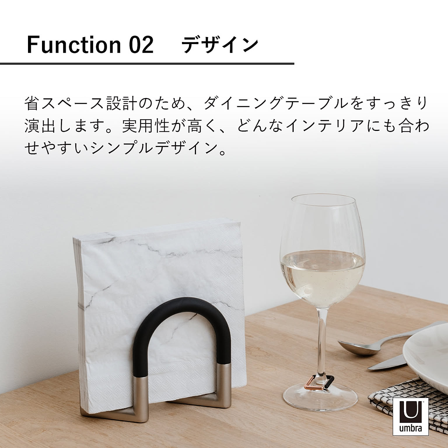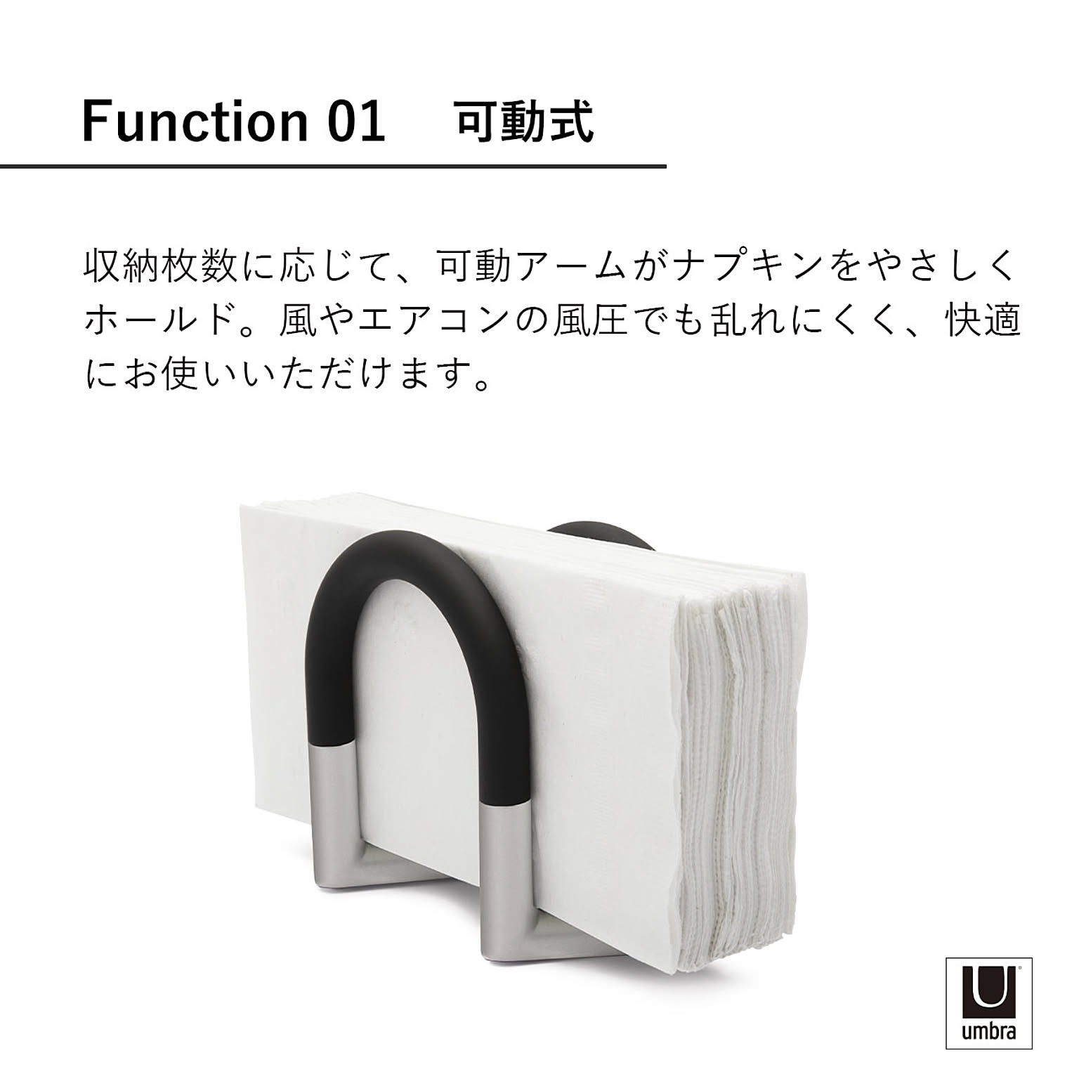 可動式アームがナプキンをやさしく押さえ、残り少なくなってもきちんとフィット。見た目も使い心地もスマートなナプキンホルダー。無駄を削ぎ落とした直線的なフォルムが、食卓をすっきりと整えます。